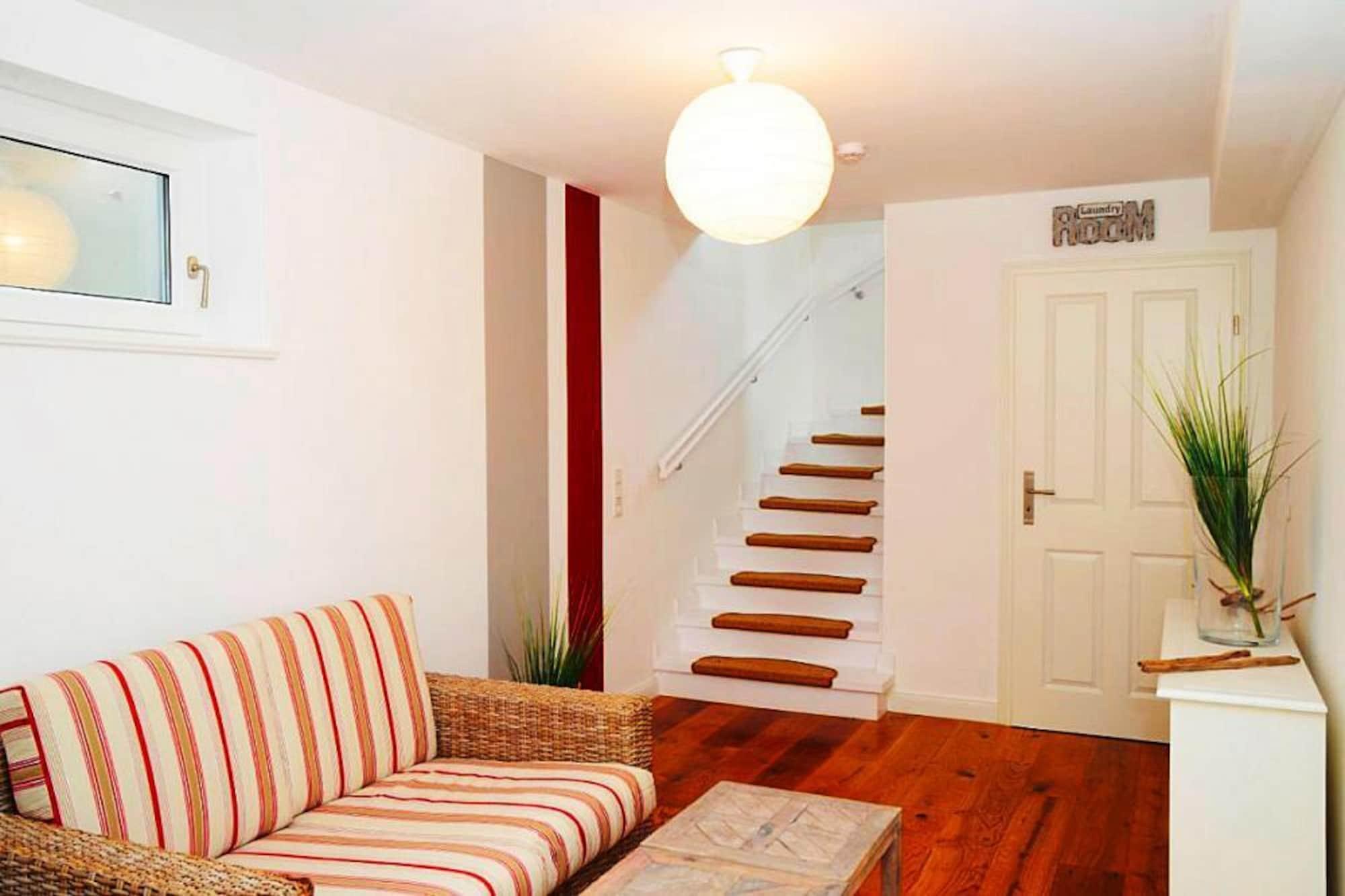På Wyker Südstrand: huse bygget i 2014 i et meget godt boligområde, få minutters gang fra havet og stranden. Inden for hvert hus er der to rummelige og helt separate boligenheder, som hver er indrettet næsten identisk. Dit domicil strækker sig over to etager og er beliggende i stueetagen og kælderen. Bybilledet i Wyk auf Föhr er præget af hyggelige frisiske huse og snoede gader. Utallige restauranter og caféer med havudsigt giver mulighed for at nyde den vidunderlige ro på en ø. Den lille havneby med dens kilometerlange sandstrand og parker med til dels eksotiske planter er et perfekt sted at flygte fra hverdagen og virkelig få ny energi. Detaljer: Forbrugsbaserede energiomkostninger, sengelinned, håndklæder, slutrengøring, WiFi Aktiviteter i nærheden: Den frisiske nordsøluft på Föhr vækker indre styrke og giver dig virkelig lyst til at træne. Tendensen her går i retning af aktiv ferieplanlægning: på Föhr kan sportsentusiaster vælge mellem mange forskellige sports- og aktivitetsprogrammer Hos Golfclub Föhr kan du også spille som gæst, men som greenfeespiller skal du have et klubkrav på mindst 54 og skal du er medlem af en golfklub tilknyttet de DGV Greenfee spillere med et krav klub af 46-54 skal påbegyndes mellem 08:00 og 10:00 eller på mindre travle tidspunkter i eftermiddag. du kan spise og nyde hvert hjørne af øen: regional eller international, eksklusivt eller ned-på-jorden køkken, hvad enten i Nieblum eller Süderende, Midlum eller Wyk - der er noget for enhver smag se frem til traditionelle frisiske retter, men ikke kun restauranter og cafeer tilbyder delikatesser, også mange!