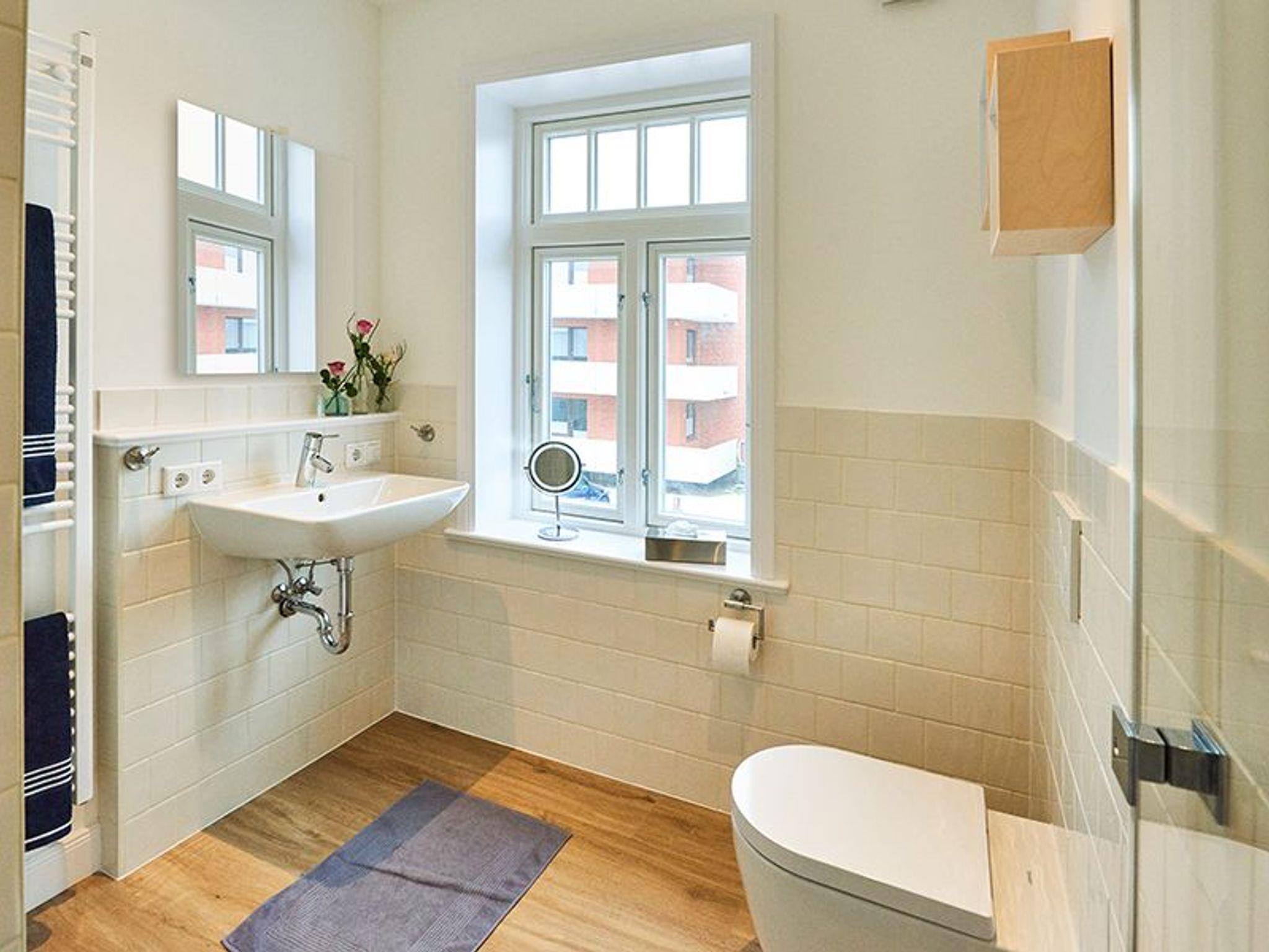 Sanitär: Föhn, Handtuchheizkörper, Schminkspiegel.