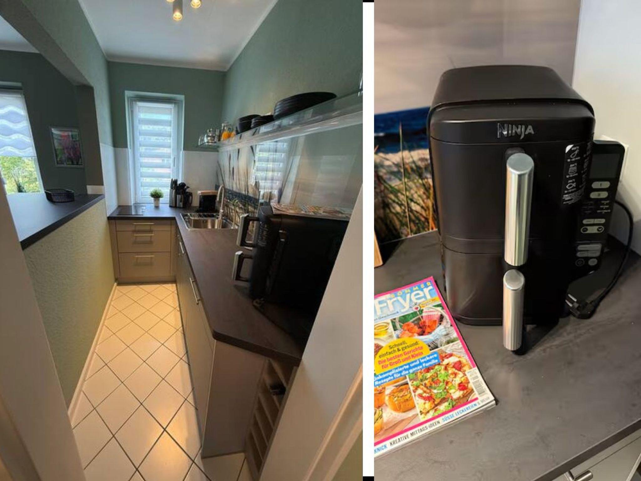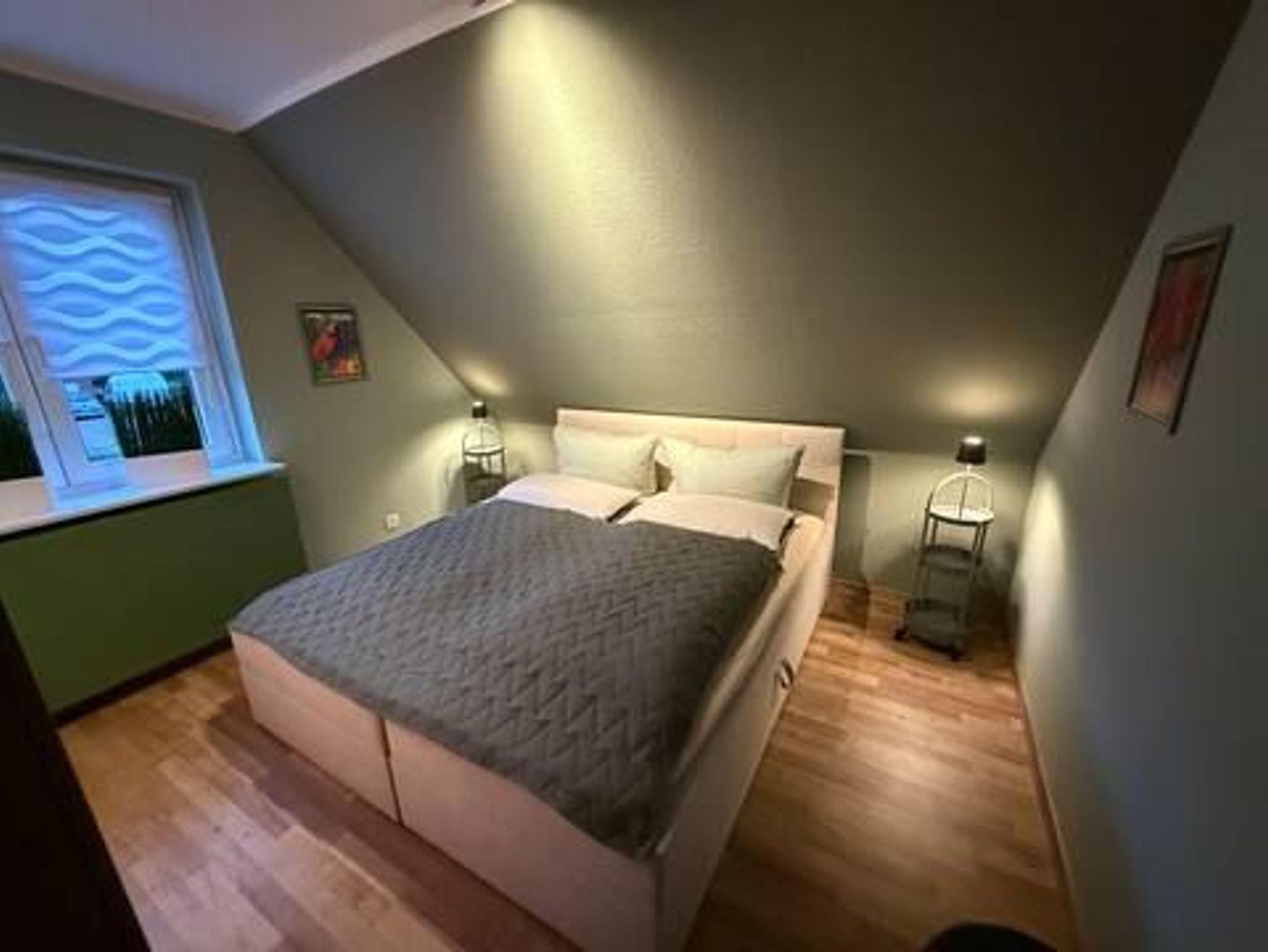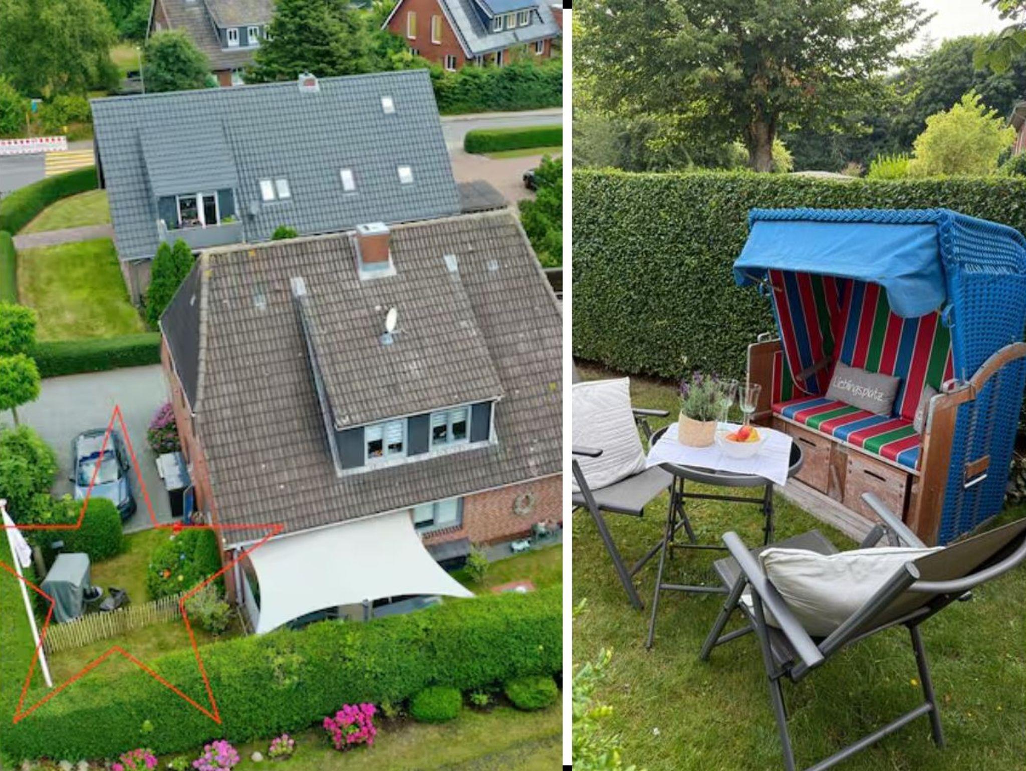 Schlafzimmer mit 2 x1,80 m Boxspring Bett, 2.TV, komplett ausgestattete Küche, und ein Wohnzimmer zum Entspannen und Wohlfühlen. Ein Garten-Anteil mit Strandkorb und Möbeln ist ebenso vorhanden.