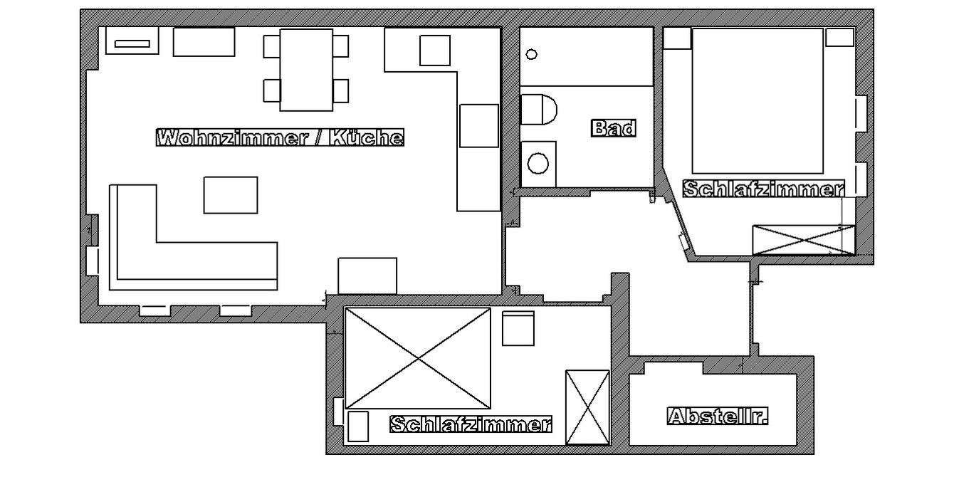 Ihre Ferienwohnung liegt im Erdgeschoss und ist mit einer Größe von 50 m² für bis zu 4 Personen ausgestattet. Ihre Wohnung verfügt über 2 Schlafzimmer, Wohnzimmer mit komplett ausgestatteter Küchenzeile und Essbereich, Duschbad, Abstellraum und Terrasse.