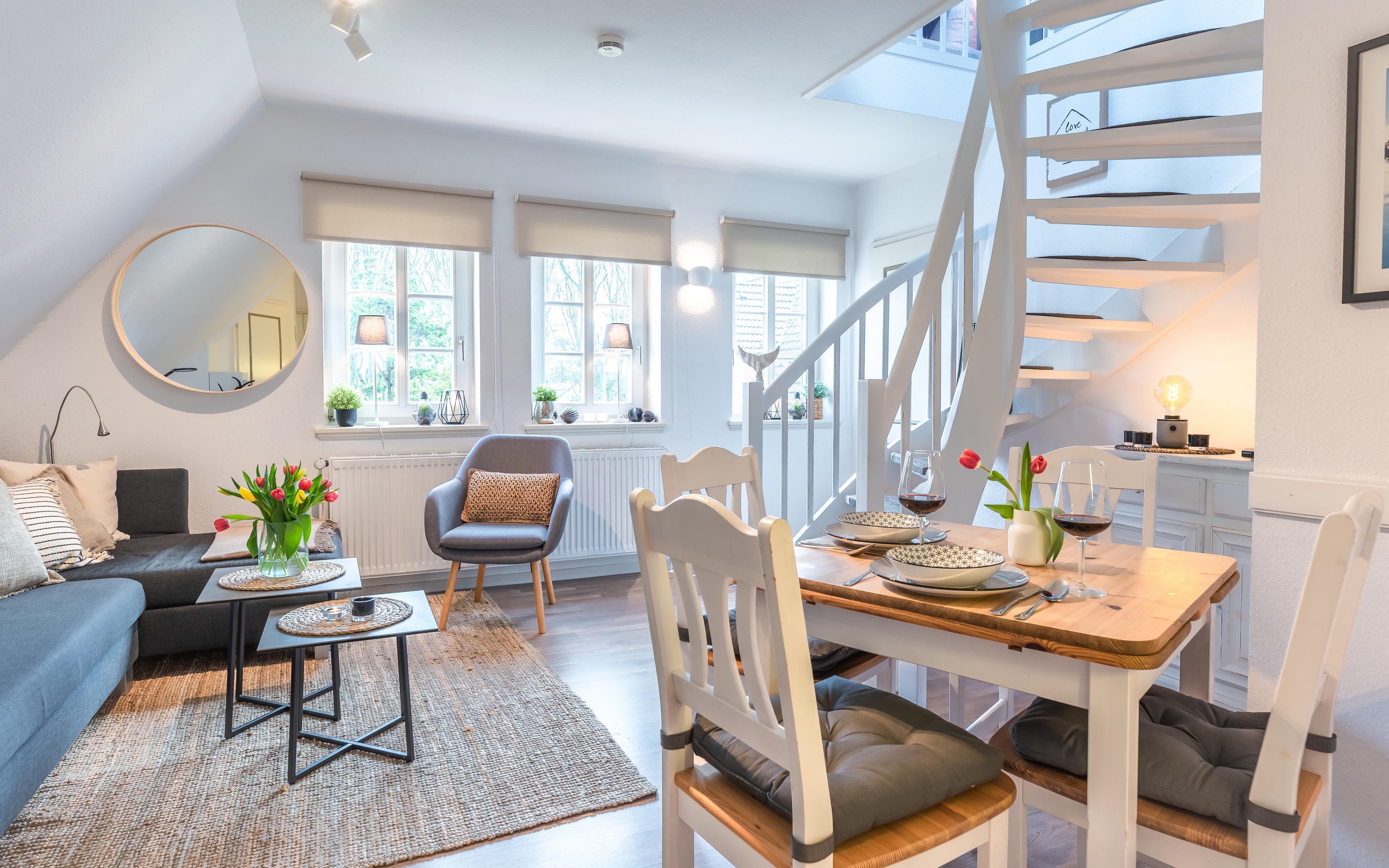Nur drei Gehminuten zur Promenade und zum großen Badestrand. In unmittelbarer Nähe befinden sich der Park an der Mühle sowie alle Erholungs- und Einkaufsmöglichkeiten, Cafés & Restaurants. Der Fährhafen ist in wenigen Minuten zu Fuß erreichbar.