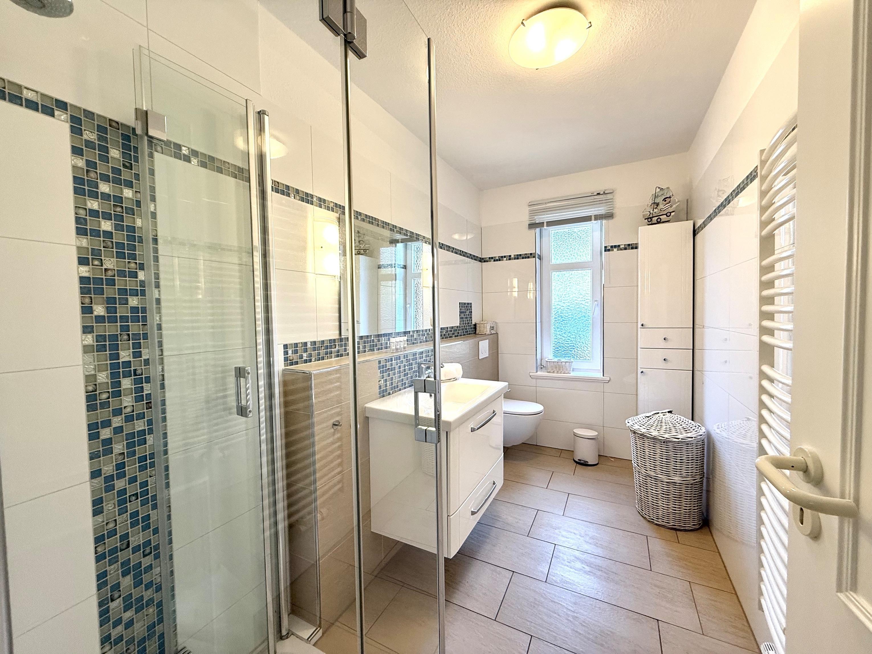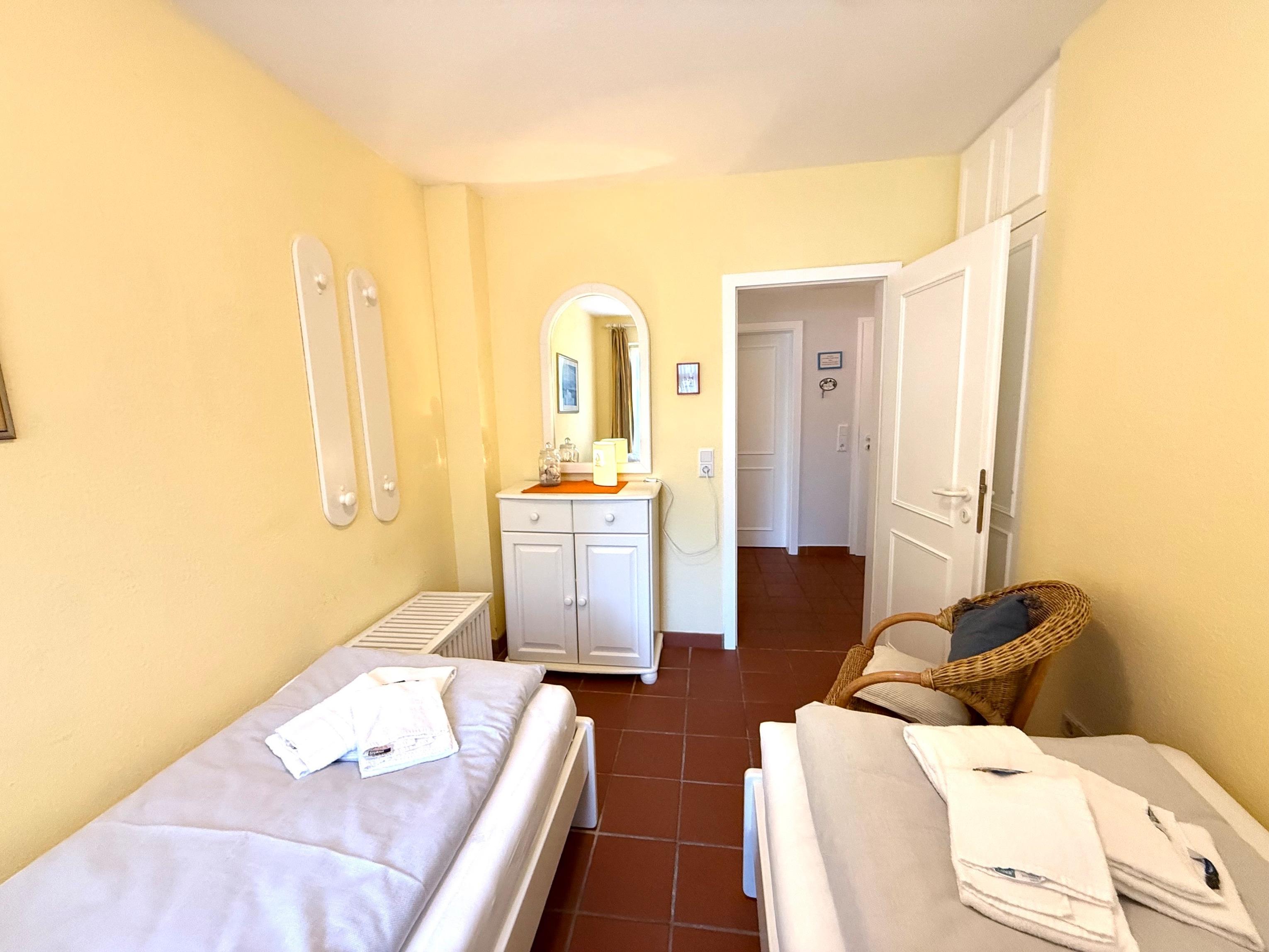 Die Ferienwohnung besitzt 2 Schlafzimmer. Für Sie stehen Einzel - und Doppelbetten bereit. Das Badezimmer ist ausgestattet mit einer Dusche. Die gut ausgestattete Küche besitzt unter anderem einen Kühlschrank, einen Herd zum Kochen und sogar eine Spülmaschine. Natürlich bieten wir Ihnen auch eine Waschmaschine und einen Trockner gegen Gebühr zur Benutzung an. Zudem gehört ein Schwimmbad, Sauna (gegen Gebühr) und ein Fitnessraum mit Crosstrainer, Ergometer und Schrägbank zur Anlage. Für unsere kleinen Gäste befinden sich auf dem Grundstück außerdem Sandkasten, Schaukel und ein Klettergerüst.