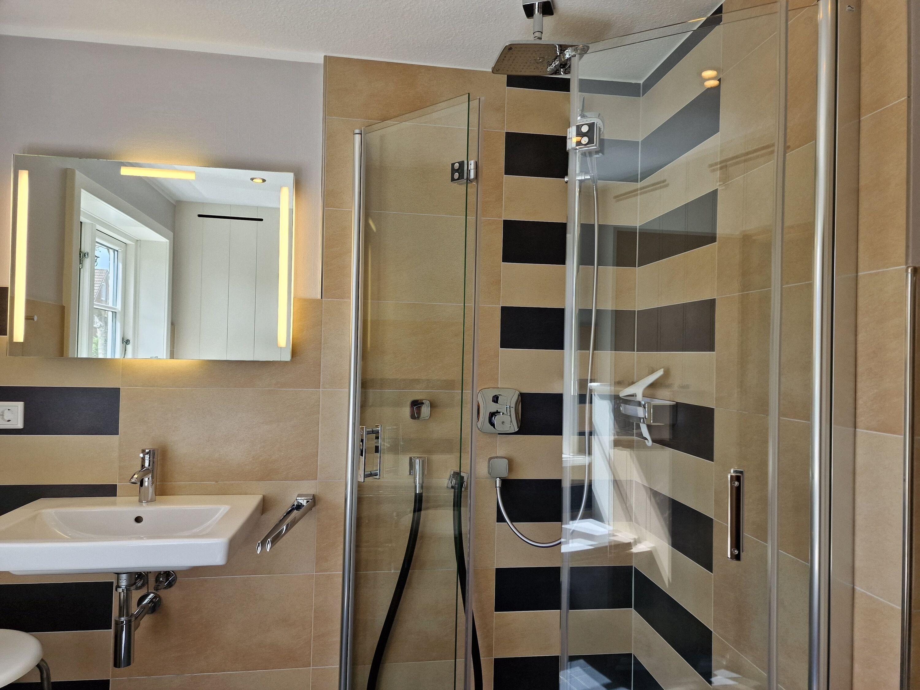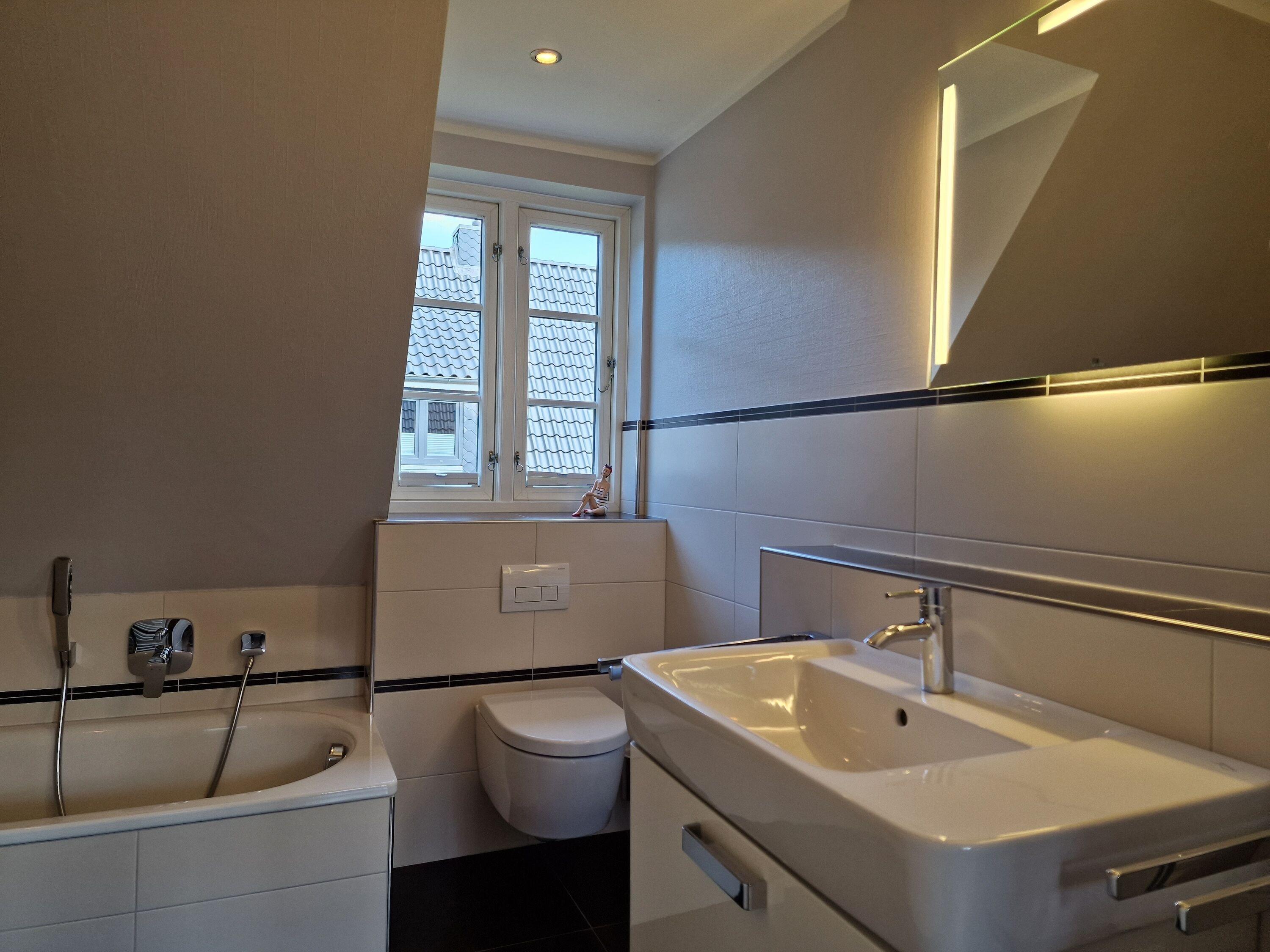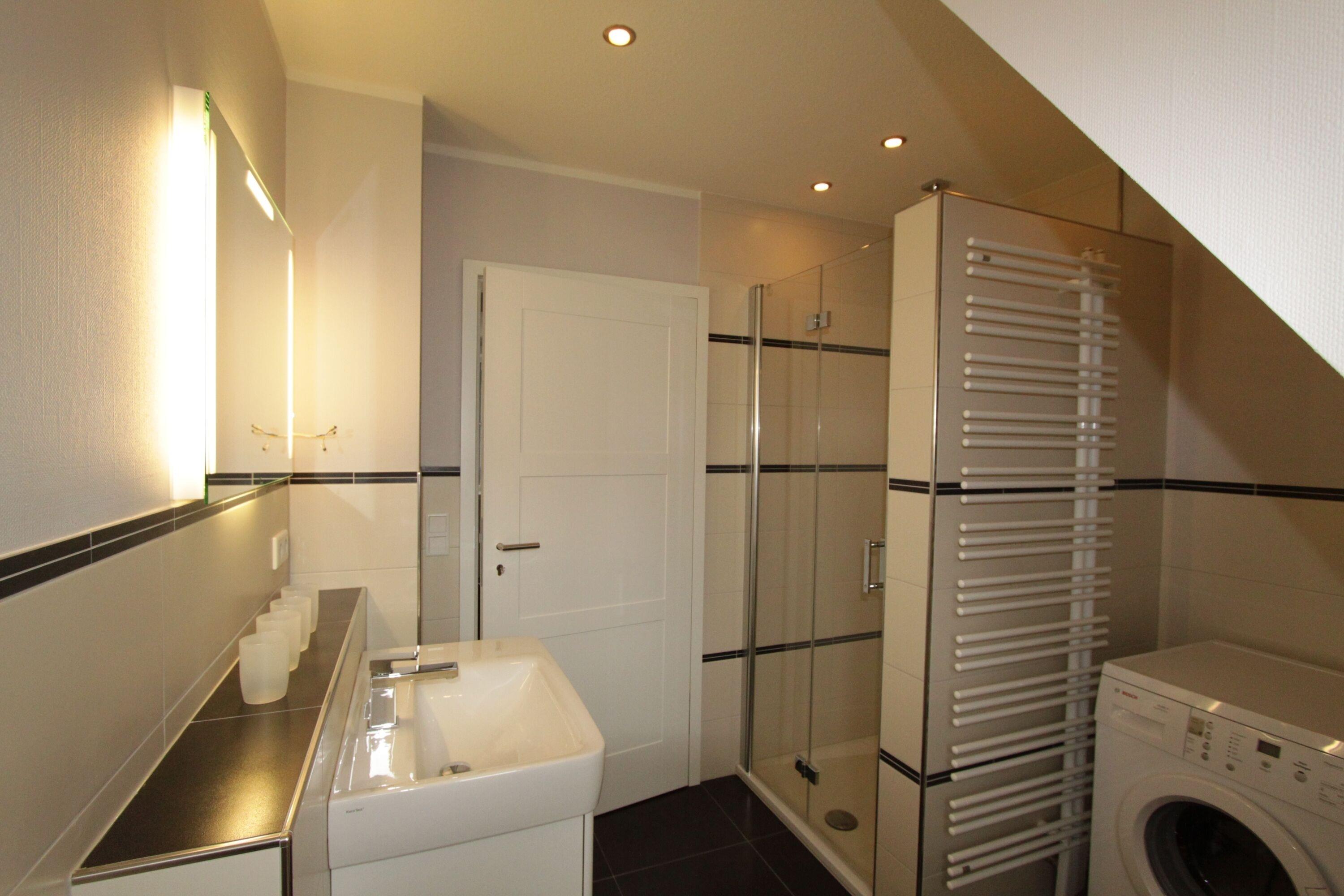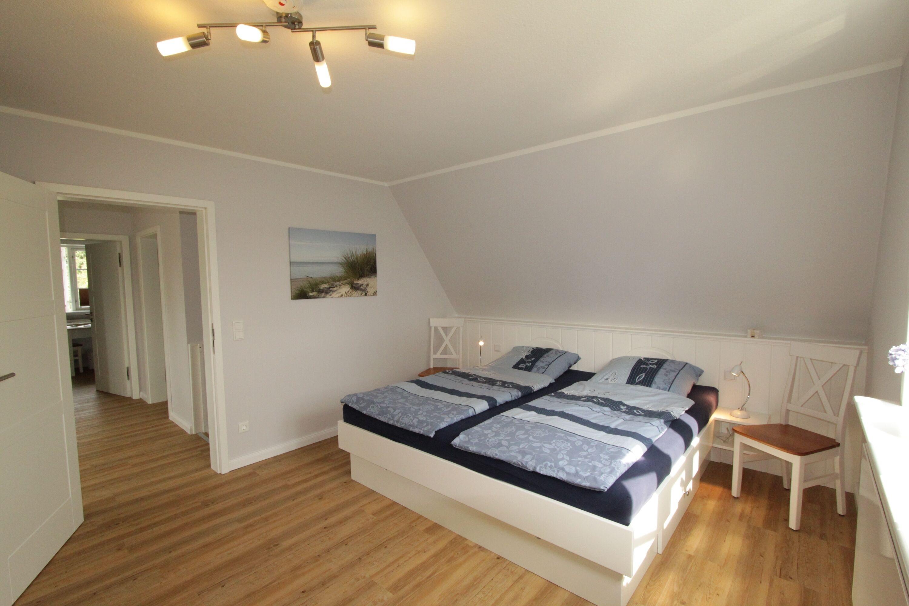 Die Unterkunft verteilt sich über EG und OG. Die beiden Schlafzimmer und 1 Bad befinden sich im OG, das zweite Bad mit Sauna sowie Küchen- und Wohnbereich im EG.
