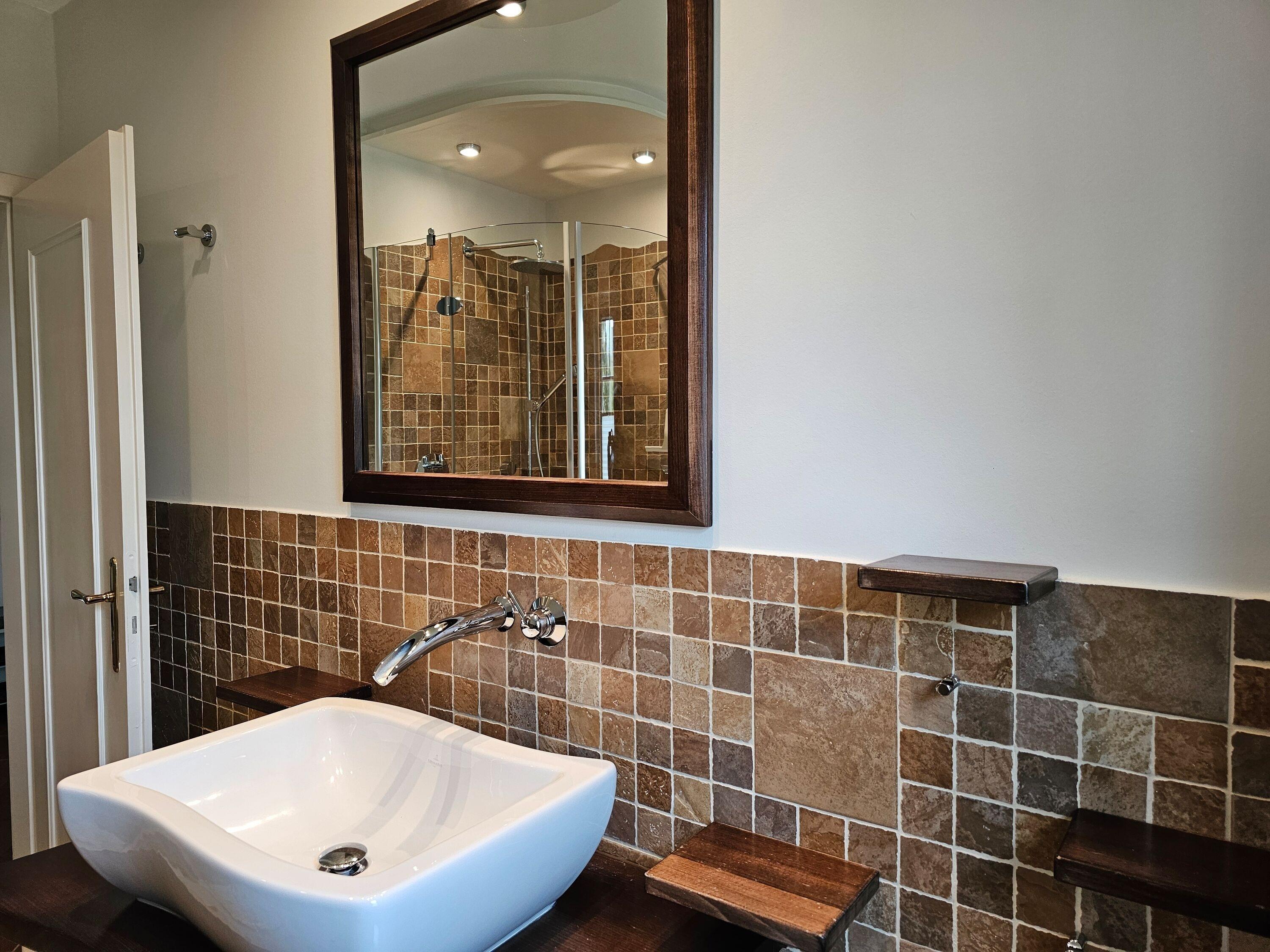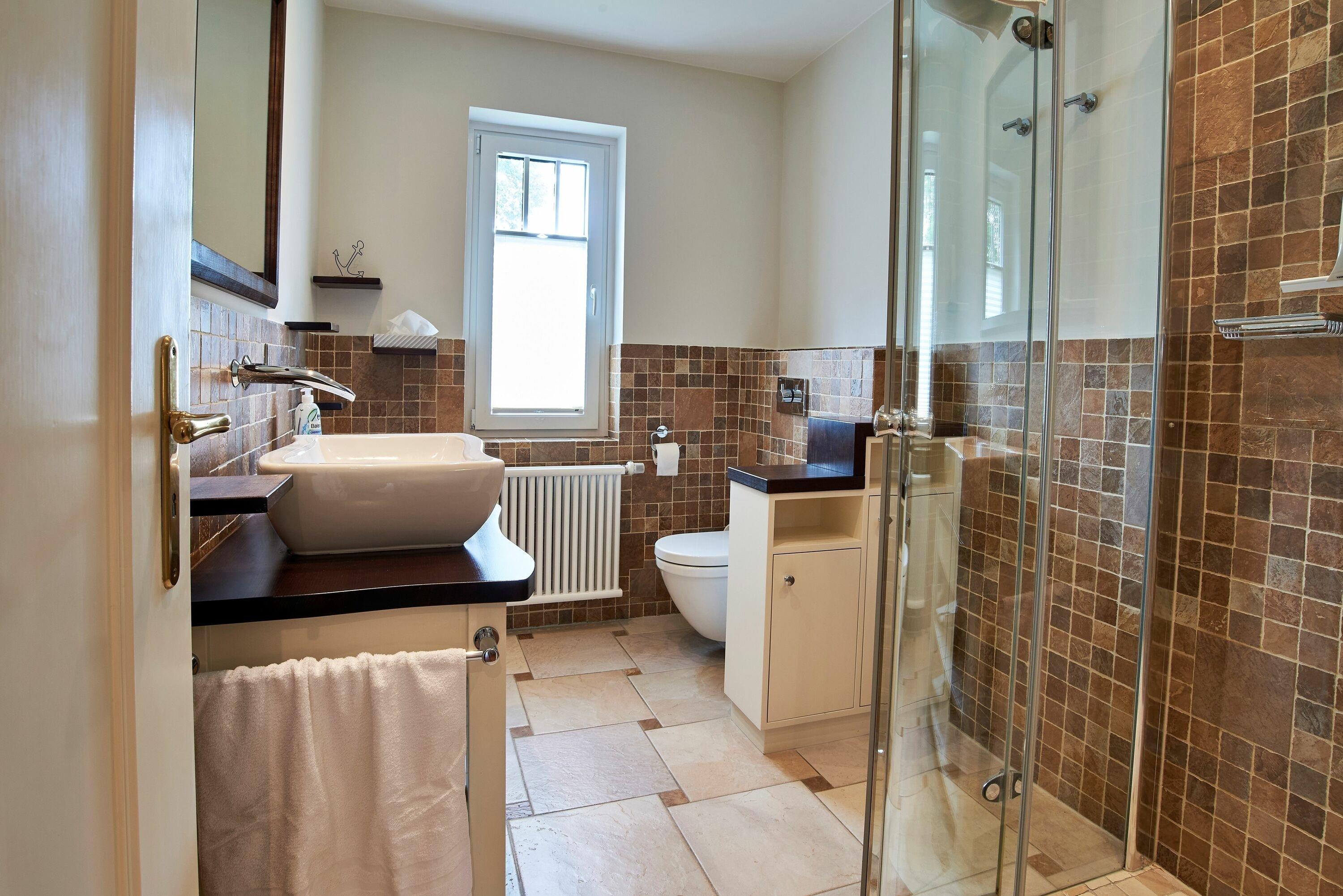 Die großzügige Erdgeschoßwohnung (95 qm) bietet zwei Schlafzimmer, jeweils mit einem Doppelbett. Das Badezimmer wartet mit einer ebenerdigen Regendusche und viel Ablagefläche auf. Im Flur ist eine Garderobe, die Platz für alle Fleece-, Regen- und weitere Jacken hat vorhanden. Weiterhin gibt es noch ein zusätzliches Gäste-WC.