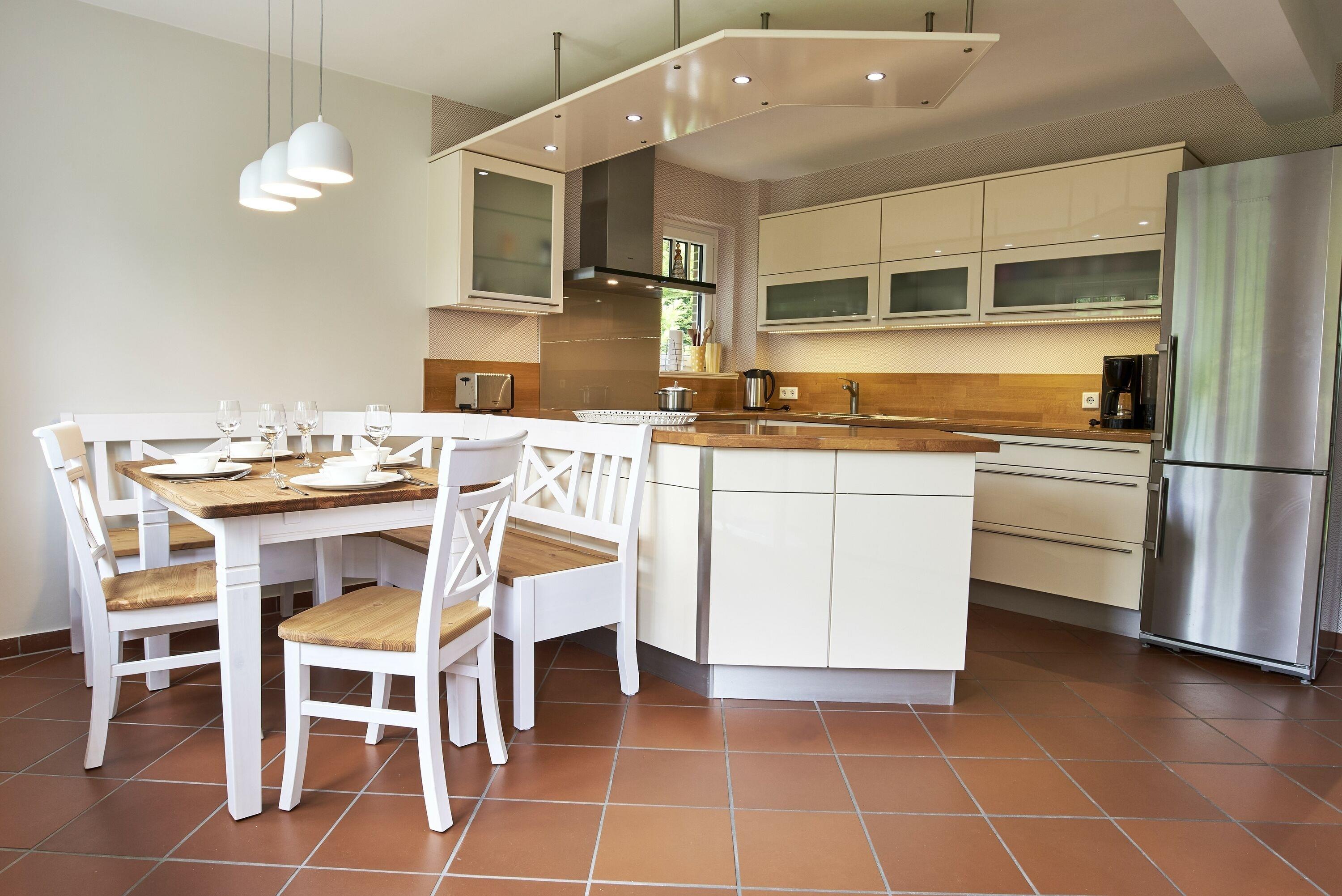 Etwas ganz Besonderes ist die Küche! Das Refugium für Hobbyköche, wo Kochen zur Erholung wird, mit hochwertigen Einbaugeräten wie Induktionskochfeld und gemütlicher Sitzecke. Und direktem Ausgang auf die zweite Terrasse der Wohnung.