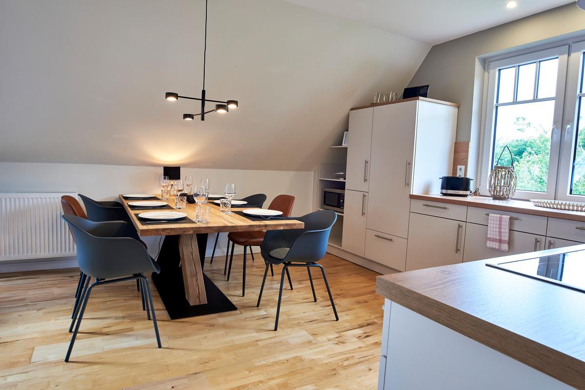 Die durchdachte Aufteilung der Wohnung schafft drei separate Schlafbereiche, welche durch eine großzügige, einladende Wohnküche verbunden sind. Diese ist mit einer modernen Einbauküche ausgestattet, die viel Raum für gemeinsames Kochen bietet. Genießen Sie Ihre Mahlzeiten an einem großen Holztisch oder entspannen Sie in der gemütlichen Sitzecke mit Fernseher.