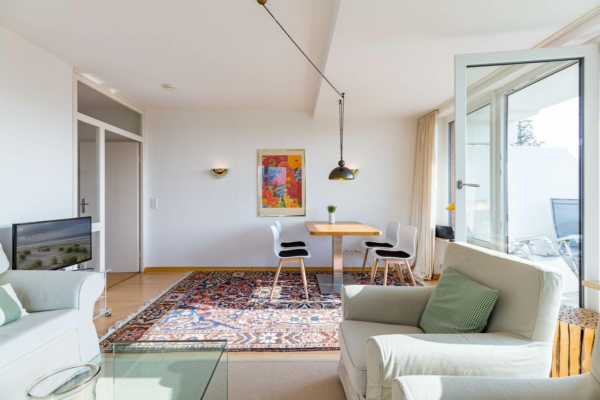 Aus der Giebelwohnung blicken Sie direkt auf's Meer hinaus. Zwischen dem Wyker Südstrand und Nieblum steht das beliebte Terrassenhaus Haus Halligblick. Die Lage ist wohl einmalig: direkt am Meer, mit Blick nach Süden in Richtung der Halligen in bester Umgebung. Ganz in der Nähe liegen der Golf- und Sportflugplatz, die bequem zu Fuß zu erreichen sind. Von dort ist es nur ein Sprung nach Greveling, der Gruppe von Reethäusern im Friesenstil. Nach Nieblum, einem der schönsten Orte Schleswig-Holsteins, ist es kaum weiter als zum Zentrum Wyks. Nicht ohne Grund gilt der Südstrand als Geheimtipp. ++ Bitte beachten Sie: in der mittleren Hausscheibe – Am Flugplatz 1a – werden vom 09.03. – 31.03.2026 die Fenster ausgetauscht. Weitere Informationen teilen wir Ihnen gerne persönlich mit.