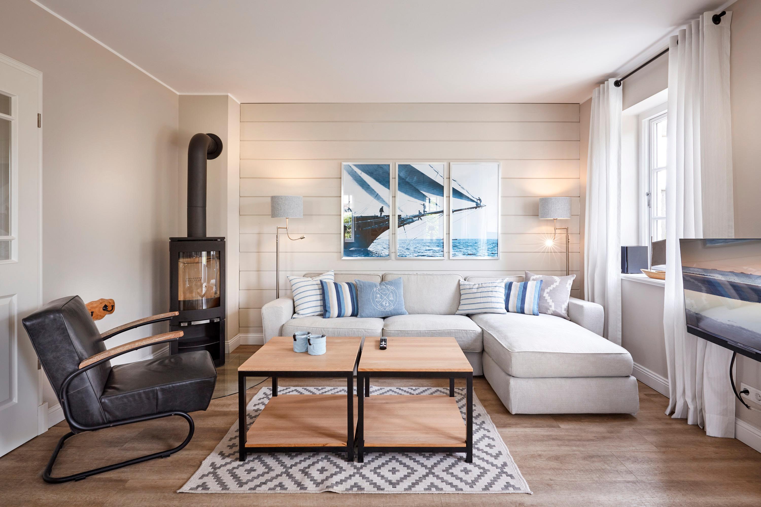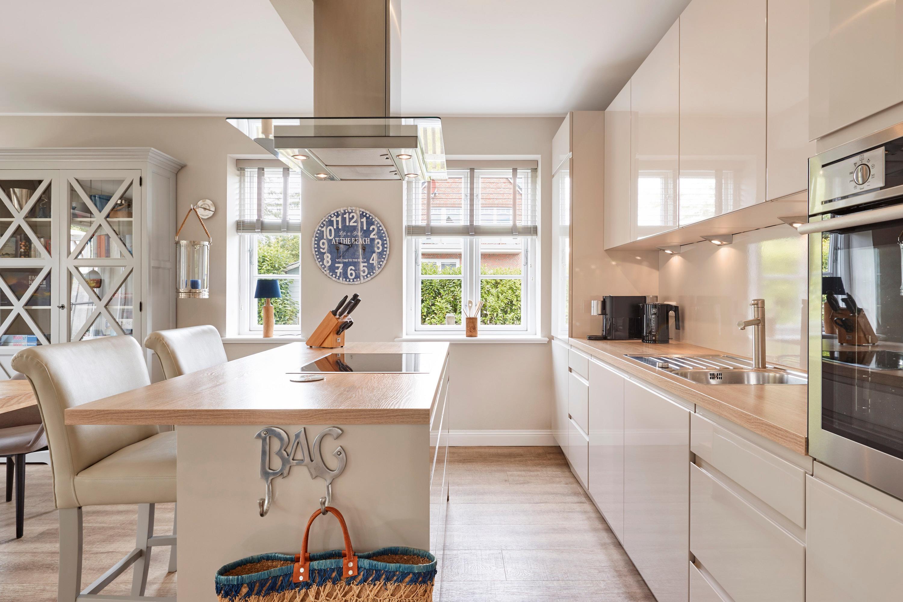 Das Ferienhaus Uast Winj hat im Erdgeschoss einen großen Wohn-Essbereich mit einer offenen Küche. Die Küche lässt keine Wünsche offen. Der Hobby-Koch findet hier alles, was er braucht: ein Induktionsfeld im Küchenblock, viele große Schubladen und Auszüge fürs bequeme Wegstauen, einen Backofen auf Augenhöhe, sowie viele elektrische Küchengeräte wie Pürierstab, Handmixer etc, ausreichend Töpfe und Pfannen, gute Messer, Schneidebretter und Rührschüsseln. Neben Wasserkocher und Toaster gibt es auch eine Nespresso Kaffeemaschine. Der Wohnbereich hat ein bequemes Sofa mit einem Filzbezug, Couchtisch und einen Sessel. Außerdem befinden sich im Wohnbereich ein Kamin-Ofen, ein TV (40-Zoll) Standgerät und eine Stereoanlage mit Dockingstation. Im Untergeschoss befinden sich Waschmaschine und Trockner.