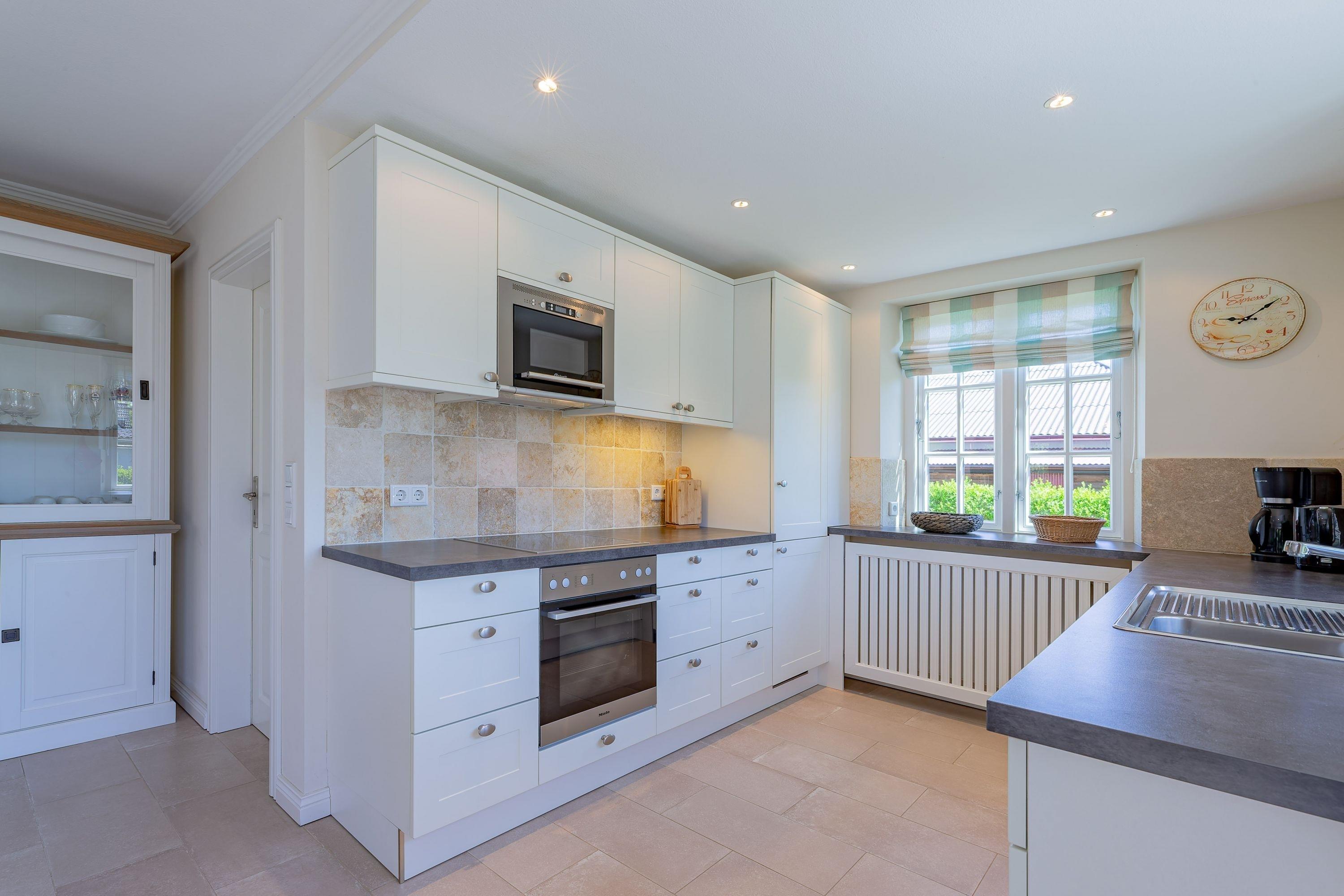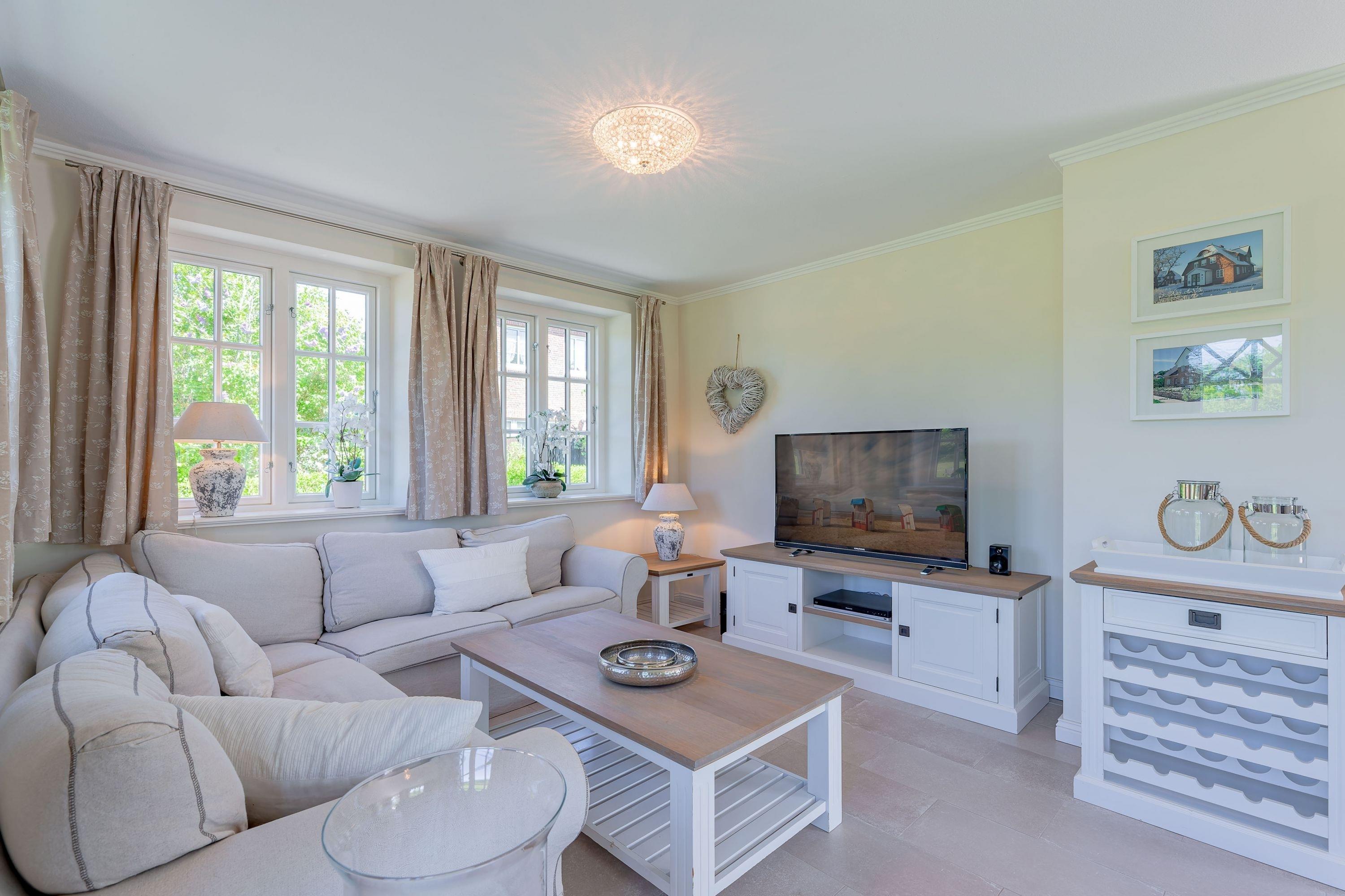 Ein typisches Friesenhaus mit sehr schöner Architektur. Die Summe schöner Details – Holzsprossenfenster, Reetdach, schöne Fliesen und Holzarbeiten - schafft eine wunderbare Atmosphäre. Im Erdgeschoss befindet sich ein großes, modern eingerichtetes Wohnzimmer mit Essplatz, von welchem Sie direkt auf die ca. 36 qm große Terrasse gelangen. Desweiteren eine moderne Küche, ein Schlafraum, sowie Diele, Bad und HWR. Im Obergeschoss sind zwei Schlafzimmer mit integrierten Bädern und die hauseigene Sauna. In nur wenigen Gehminuten gelangen Sie zum Südstrand, oder Golfplatz. Waldspaziergänge können direkt vor der Tür starten. Alle Erholungs- und Einkaufsmöglichkeiten sowie Cafés und Restaurants liegen ca. 1,5 km entfernt.