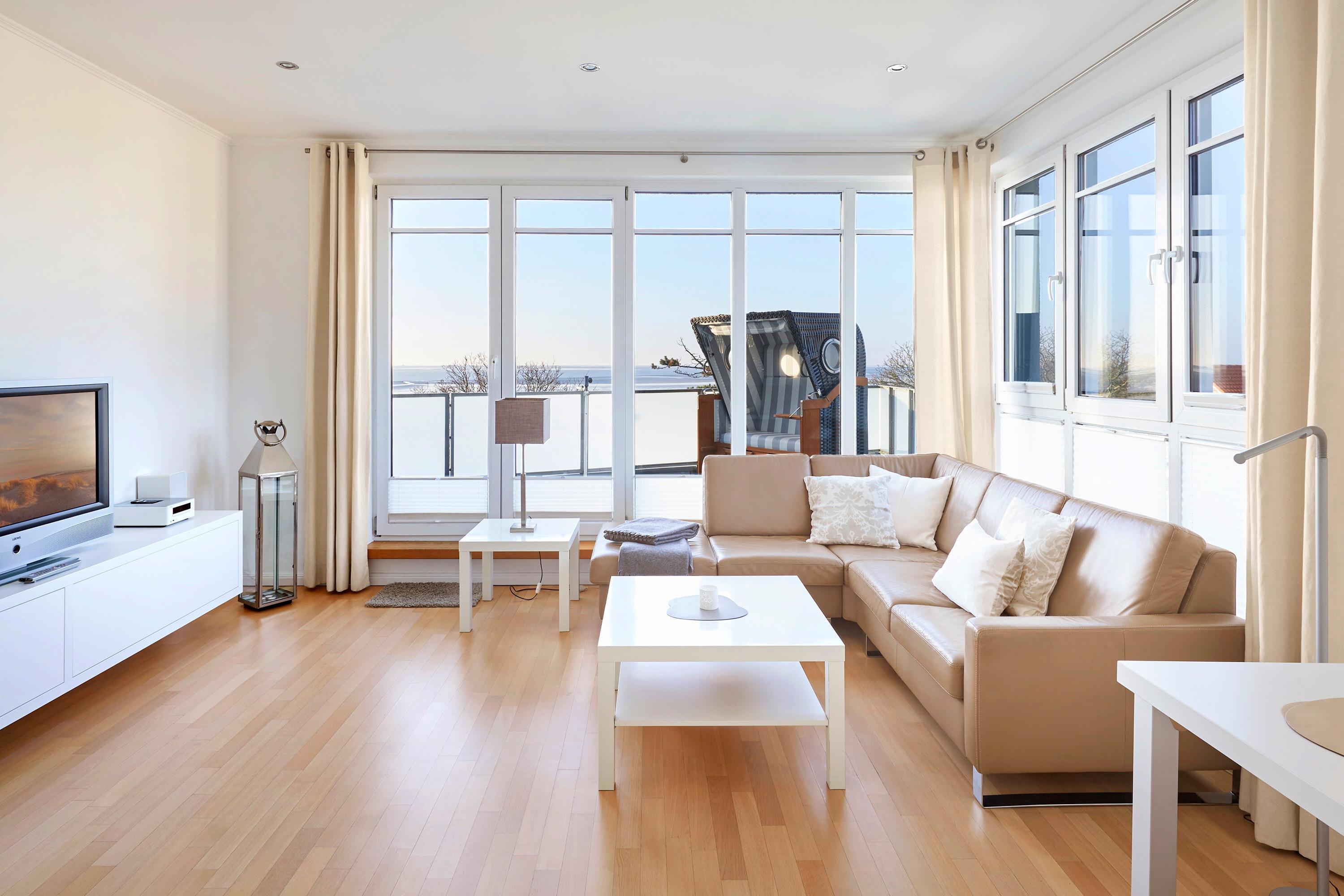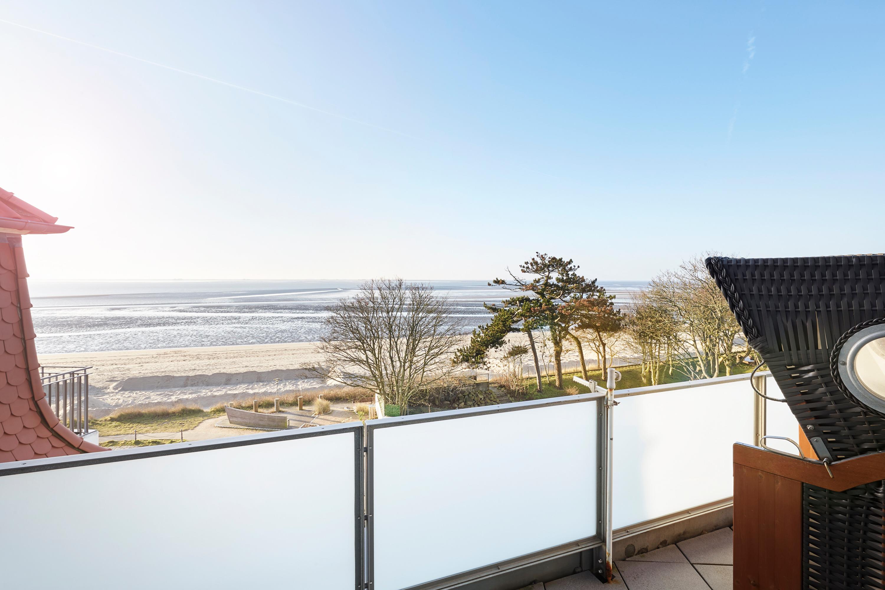 Wir begrüßen Sie im Schloß am Meer", der exklusiven Wohnanlage direkt am Wyker-Südstrand gelegen. Ihre Wohnung liegt im Staffelgeschoss hinter der historischen Fassade, welche beim Neubau erhalten wurde. Hier haben Sie eine Dachterrasse nach Süden gelegen ganz für sich allein und einen Blick auf die Nordsee und die Halligen. Dieser einzigartige Panoramablick ist unvergesslich. In nur wenigen Schritten befinden Sie sich auf der Promenade, die Sie ins Herz von Wyk führt. Hier laden Geschäfte zum Bummeln ein, Cafes und Restaurants verwöhnen Sie mit kulinarischen Köstlichkeiten."