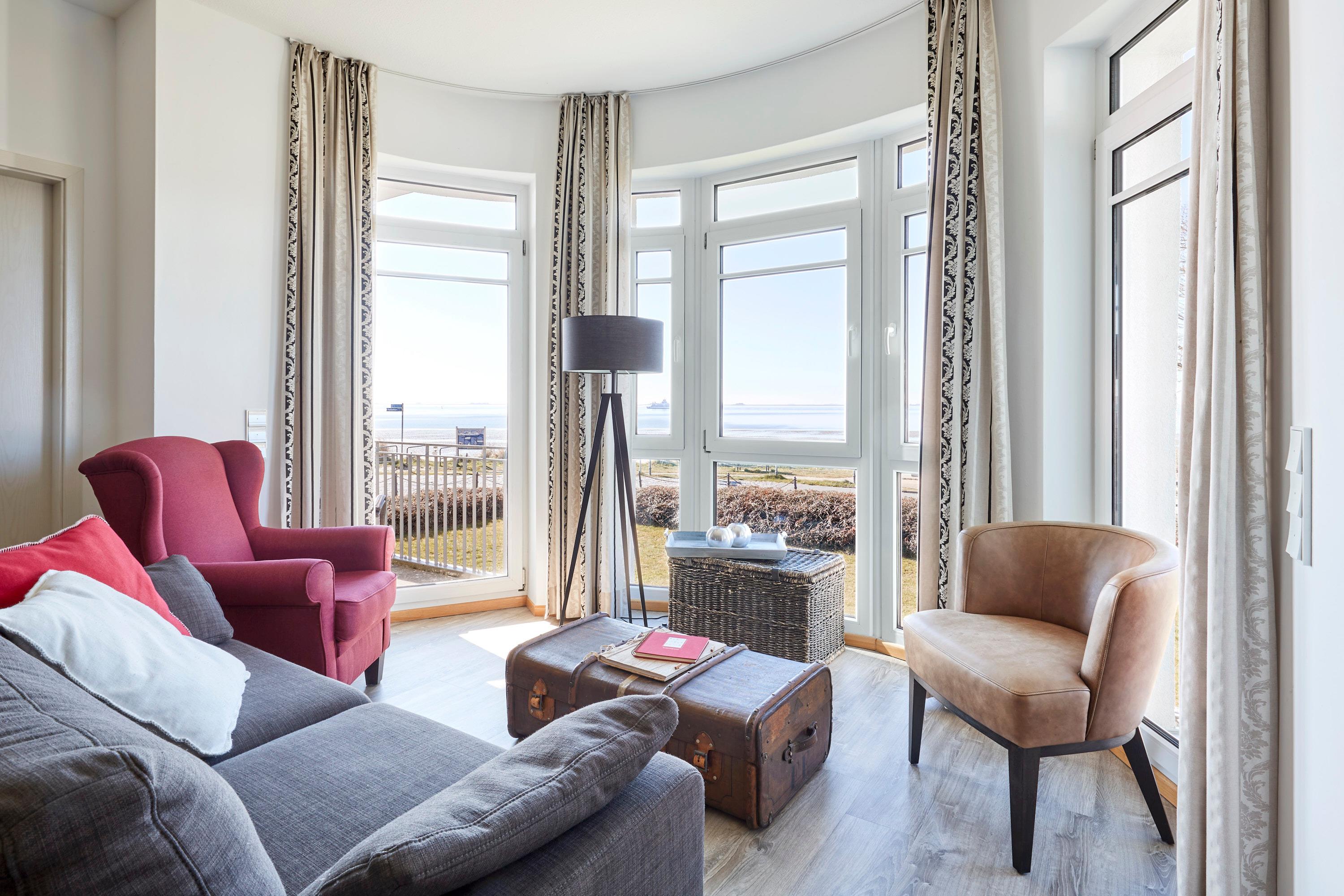 Wir begrüßen Sie im "Schloss am Meer", der exklusiven Wohnanlage direkt am Wyker Südstrand gelegen. Ihre Wohnung liegt Hochpaterre hinter der historischen Fassade, welche beim Neubau erhalten wurde. Hier laden drei Balkone ein, den Blick auf die Nordsee und die Halligen zu genießen. Ein einzigartiger Panoramablick erwartet Sie. Genießen Sie die Sonne schon beim Frühstück! In nur wenigen Schritten befinden Sie sich auf der Promenade, die Sie ins Herz von Wyk führt. Hier laden Geschäfte zum Bummeln ein, in Cafés und Restaurants werden Sie mit kulinarischen Köstlichkeiten verwöhnt.