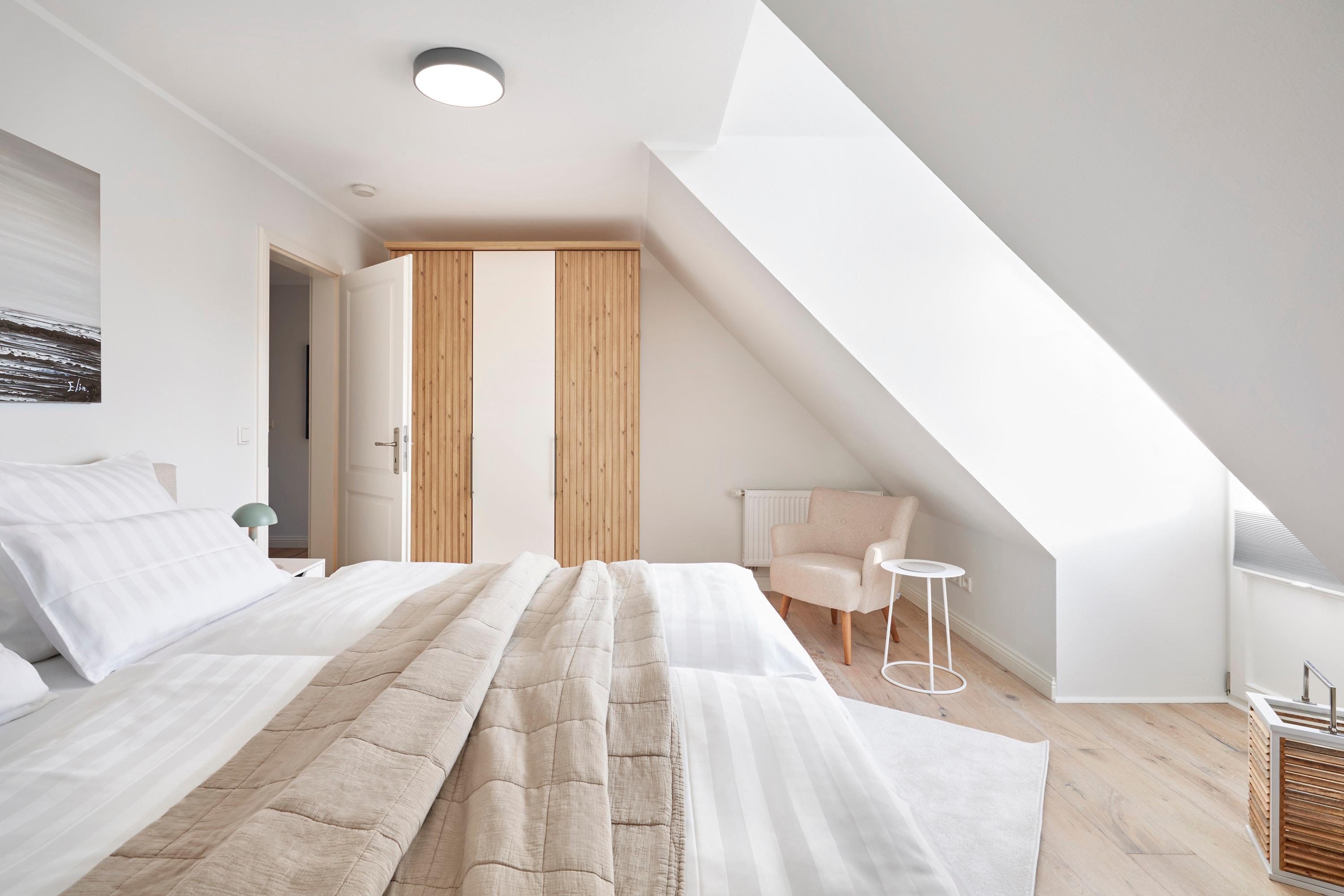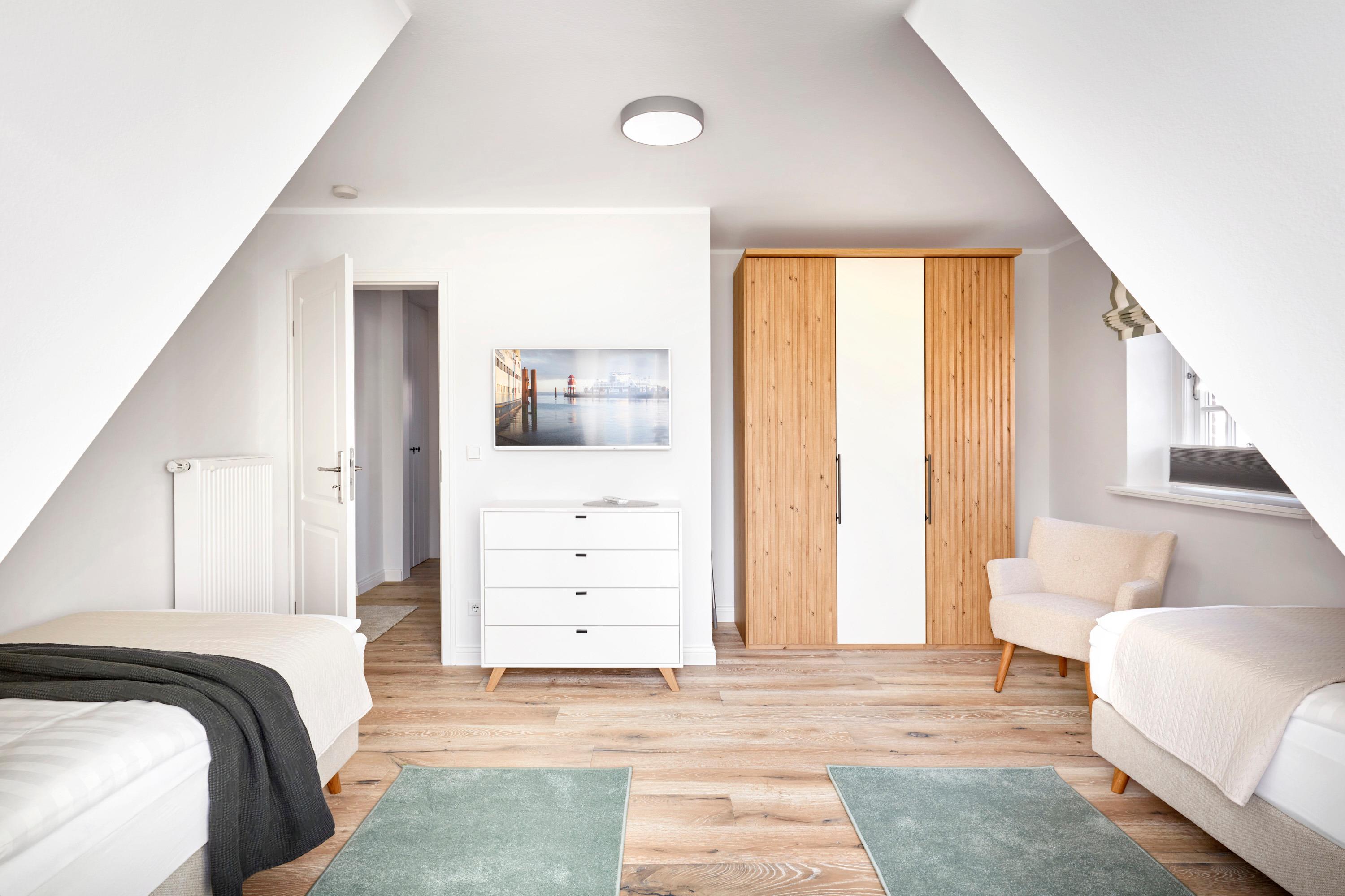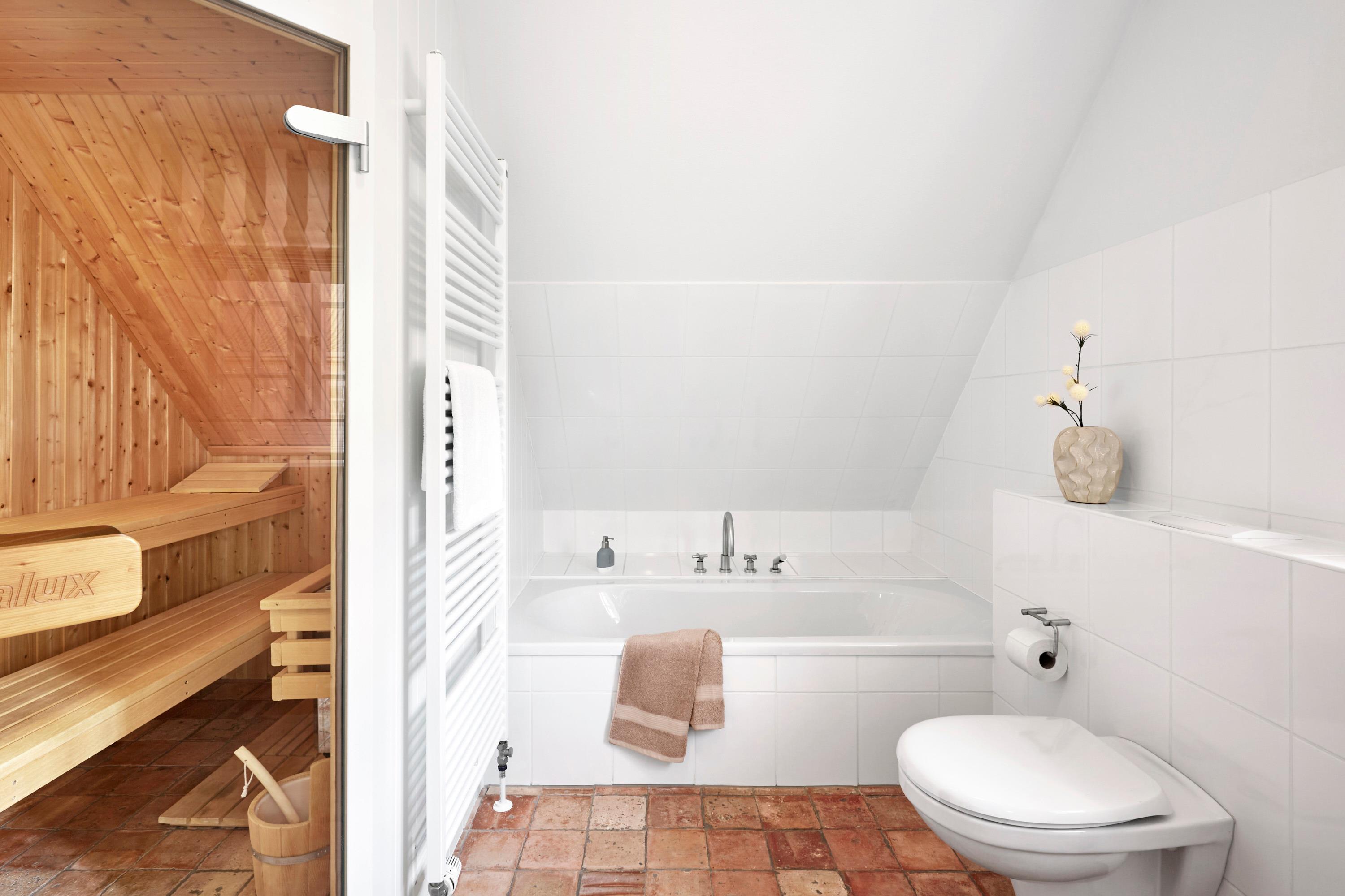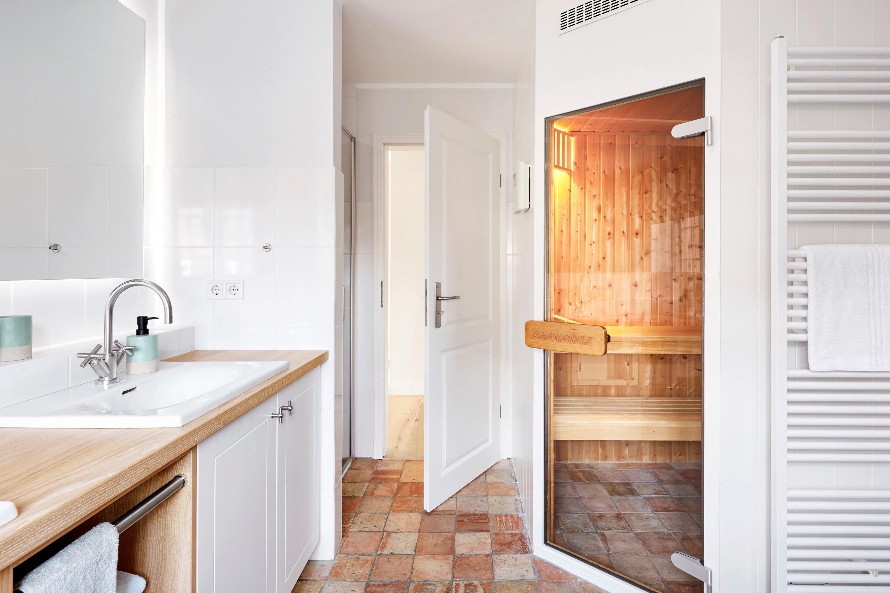 Im Obergeschoss erwartet Sie eine private Wellness-Oase mit Sauna und Badewanne, eingebettet in ein stilvolles Duschbad. Zudem stehen drei behagliche Schlafzimmer zur Verfügung – zwei mit Doppelbetten, eines mit zwei Einzelbetten. Zwei der Schlafzimmer bieten direkten Zugang zu einem Balkon.