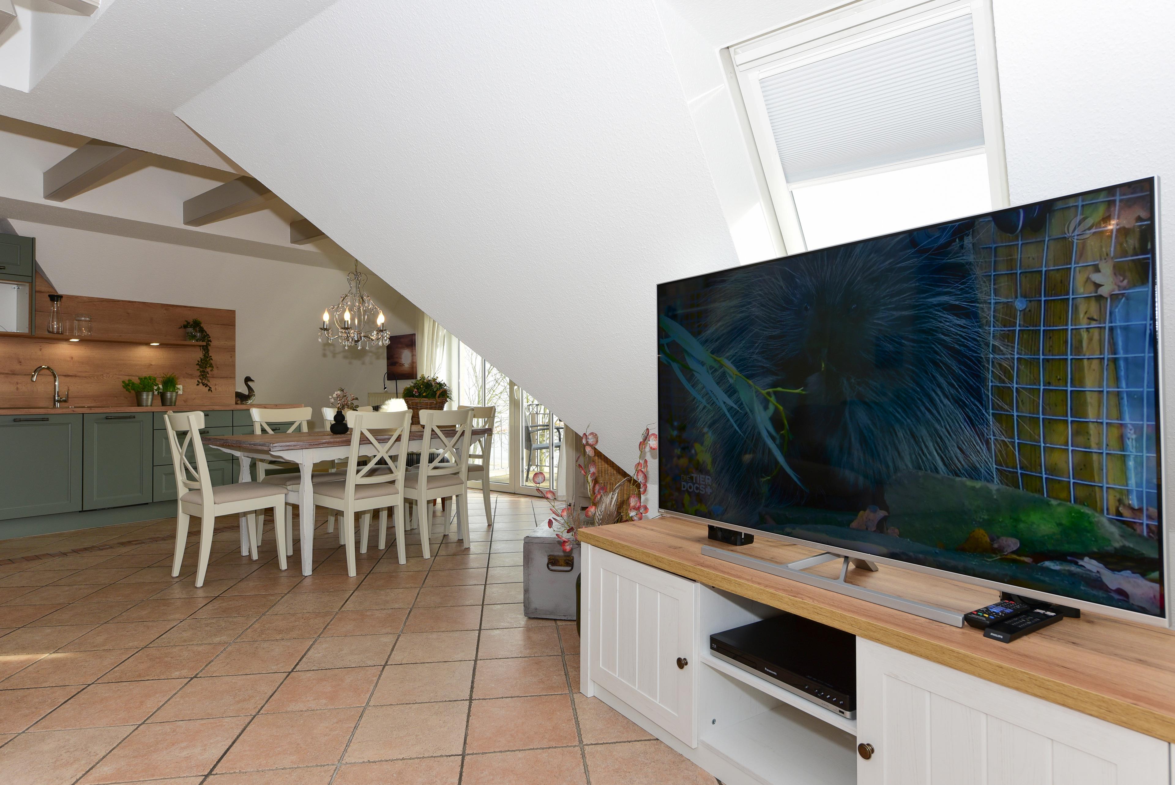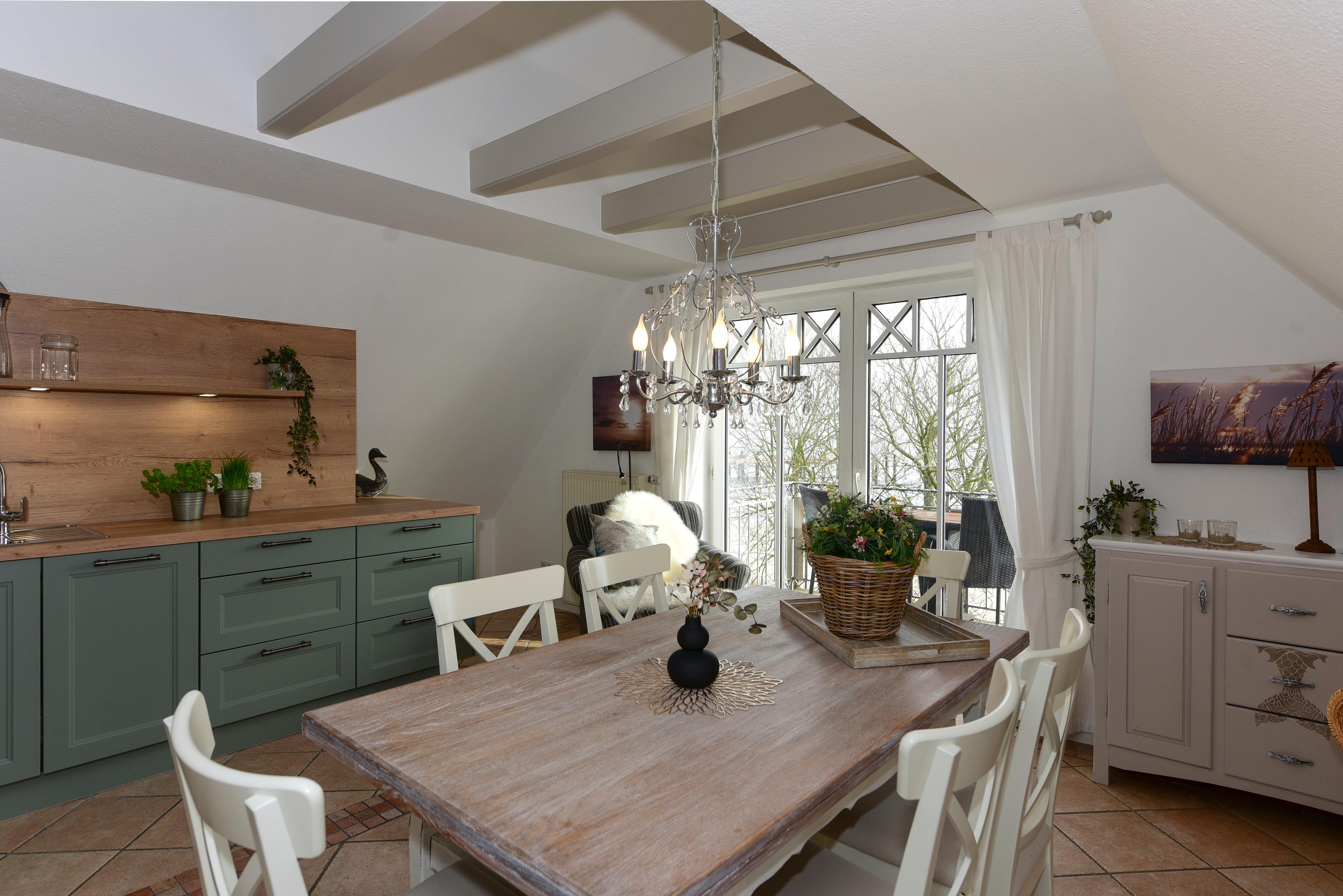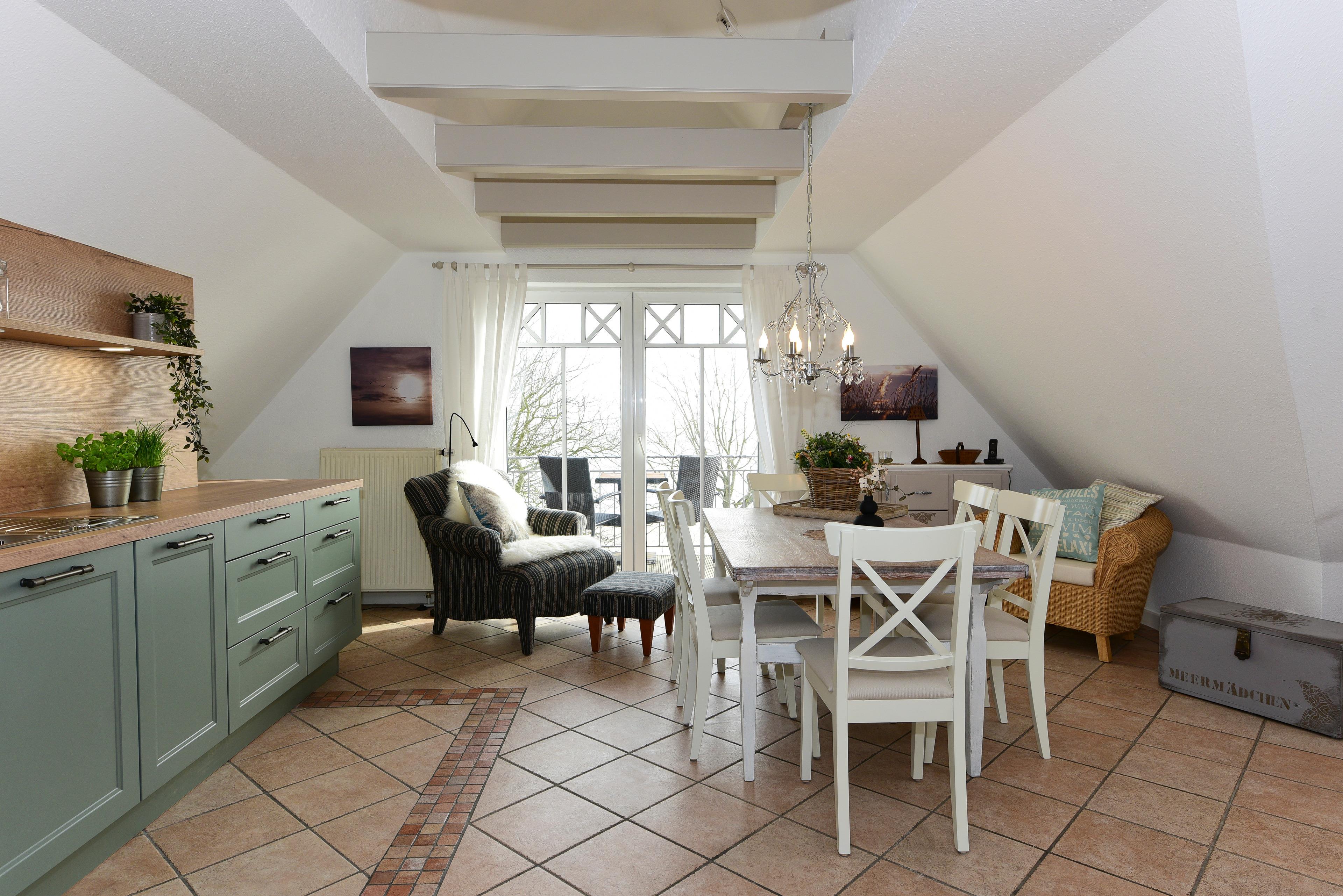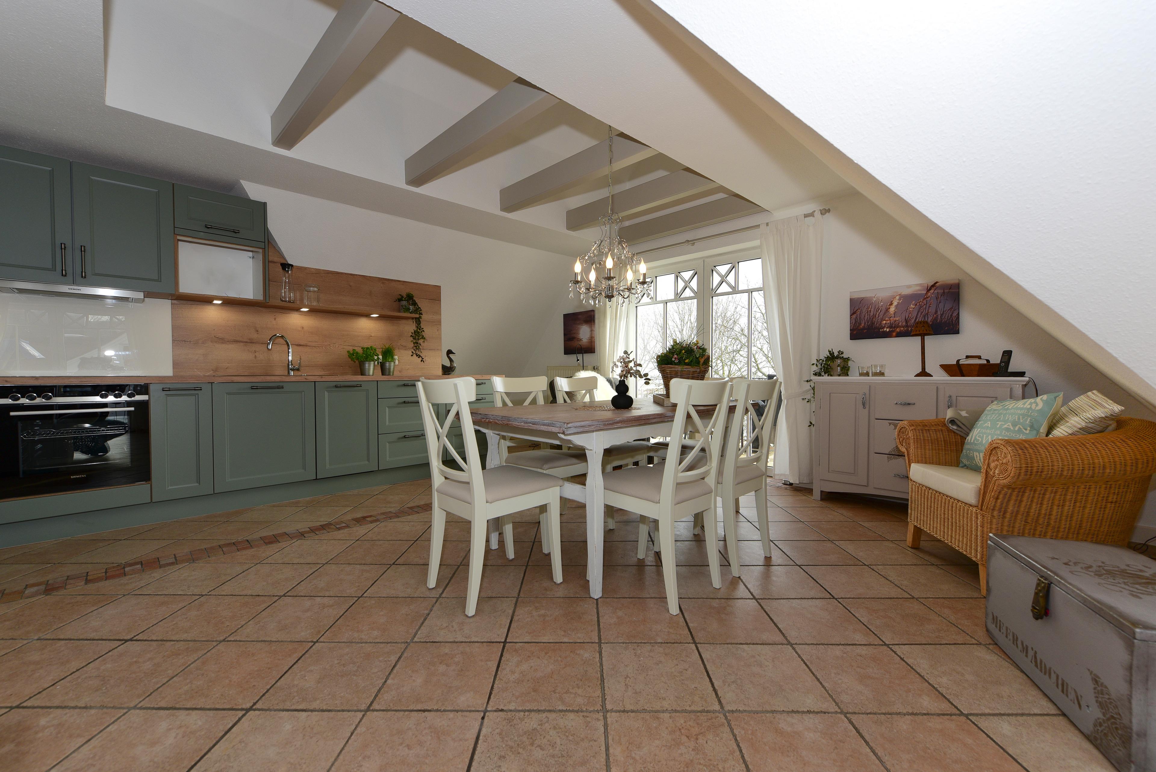 Die komplett ausgestattete Küche bietet alles, was Sie für die Zubereitung köstlicher Mahlzeiten benötigen. Der große Esstisch bietet Ihnen nicht nur ausreichend Platz, sondern auch einen einmaligen Blick auf die Nordsee – hier macht jedes Frühstück doppelt so viel Spaß.