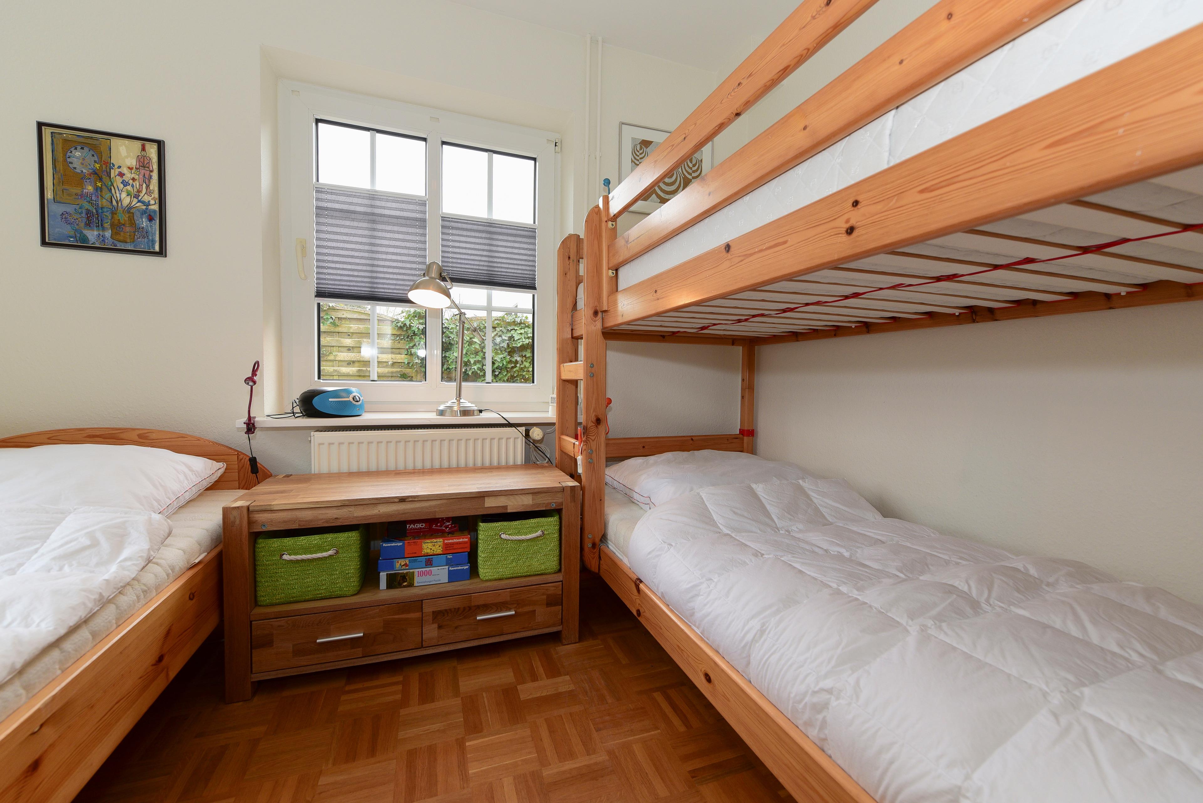 Das zweite Schlafzimmer ist mit einem Einzelbett und einem Etagenbett ausgestattet, sodass auch für Kinder oder weitere Gäste ausreichend Platz vorhanden ist.