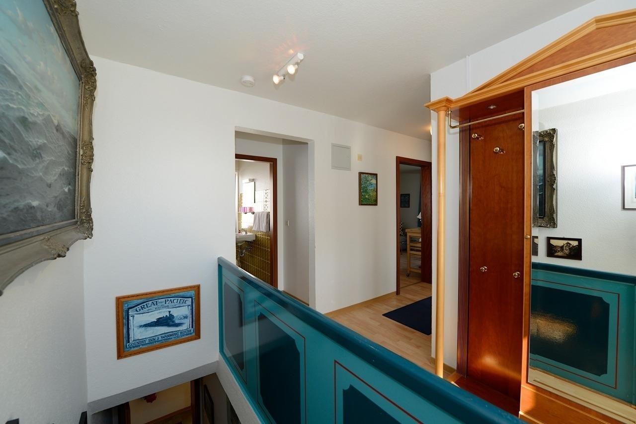 Der Treppenaufgang ist im typischen Friesenblau gehalten – ein wahrer Blickfang!