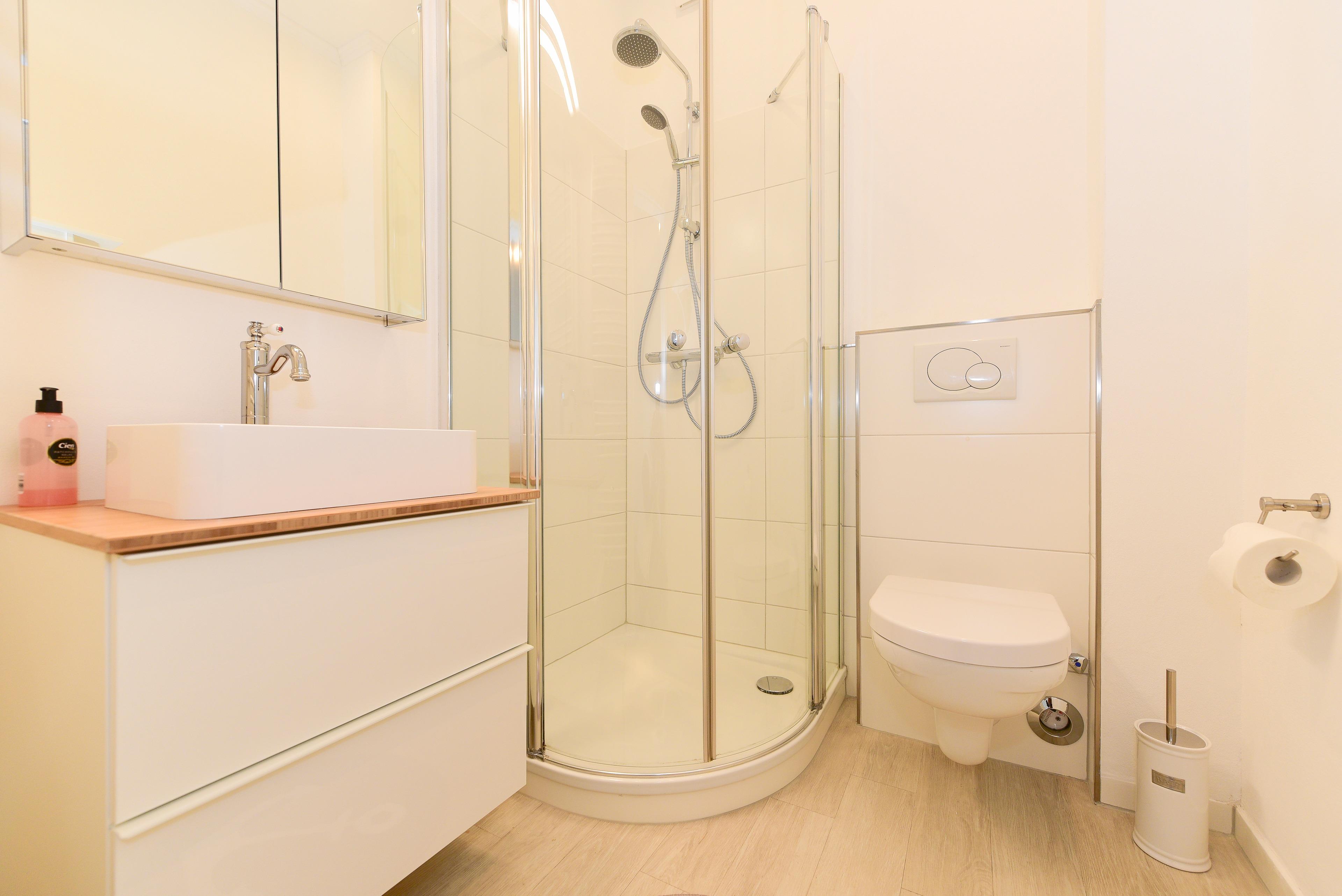 Das helle Duschbad ist mit einer Regendusche und einer Handbrause ausgestattet – ideal für einen erfrischenden Start in den Tag.