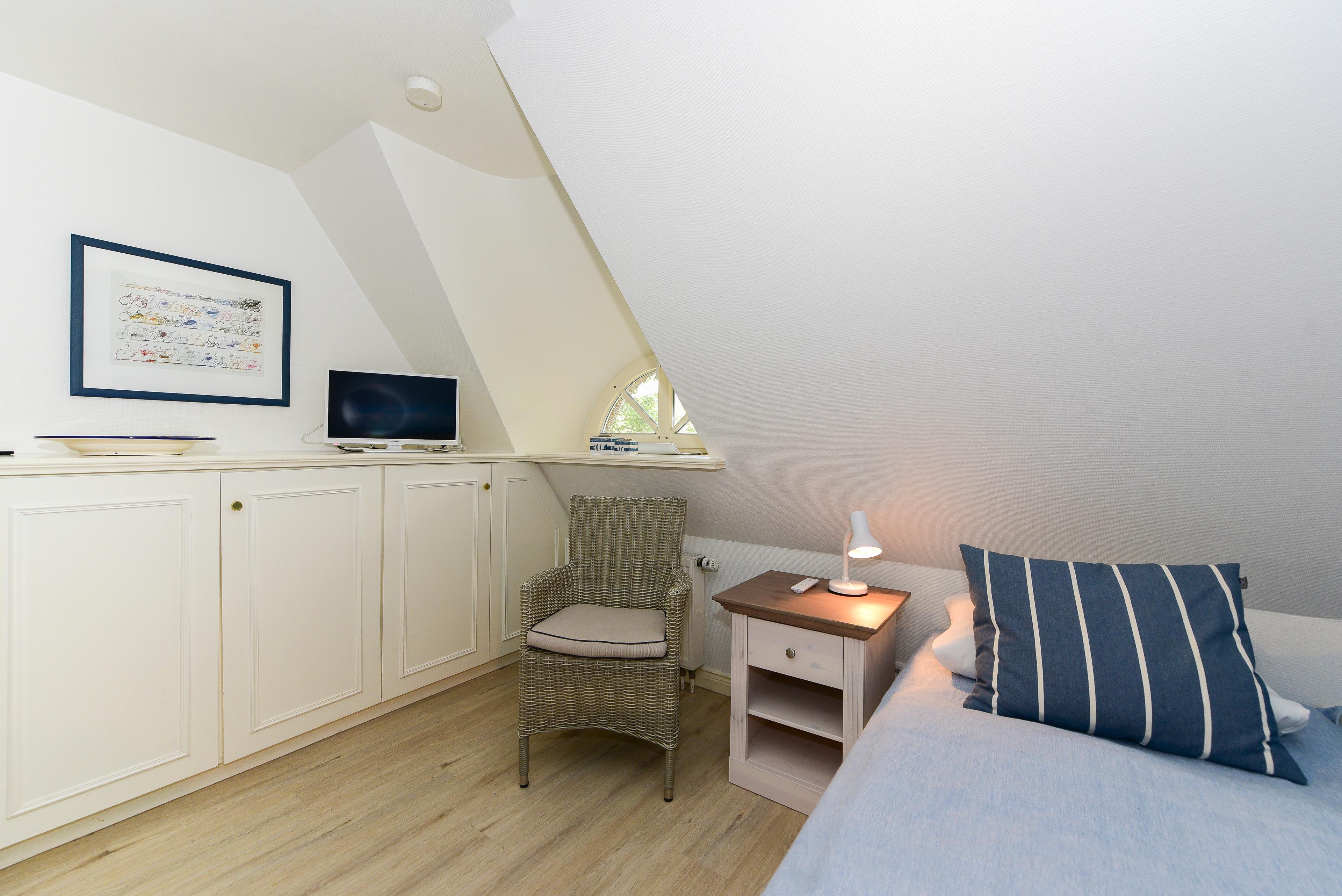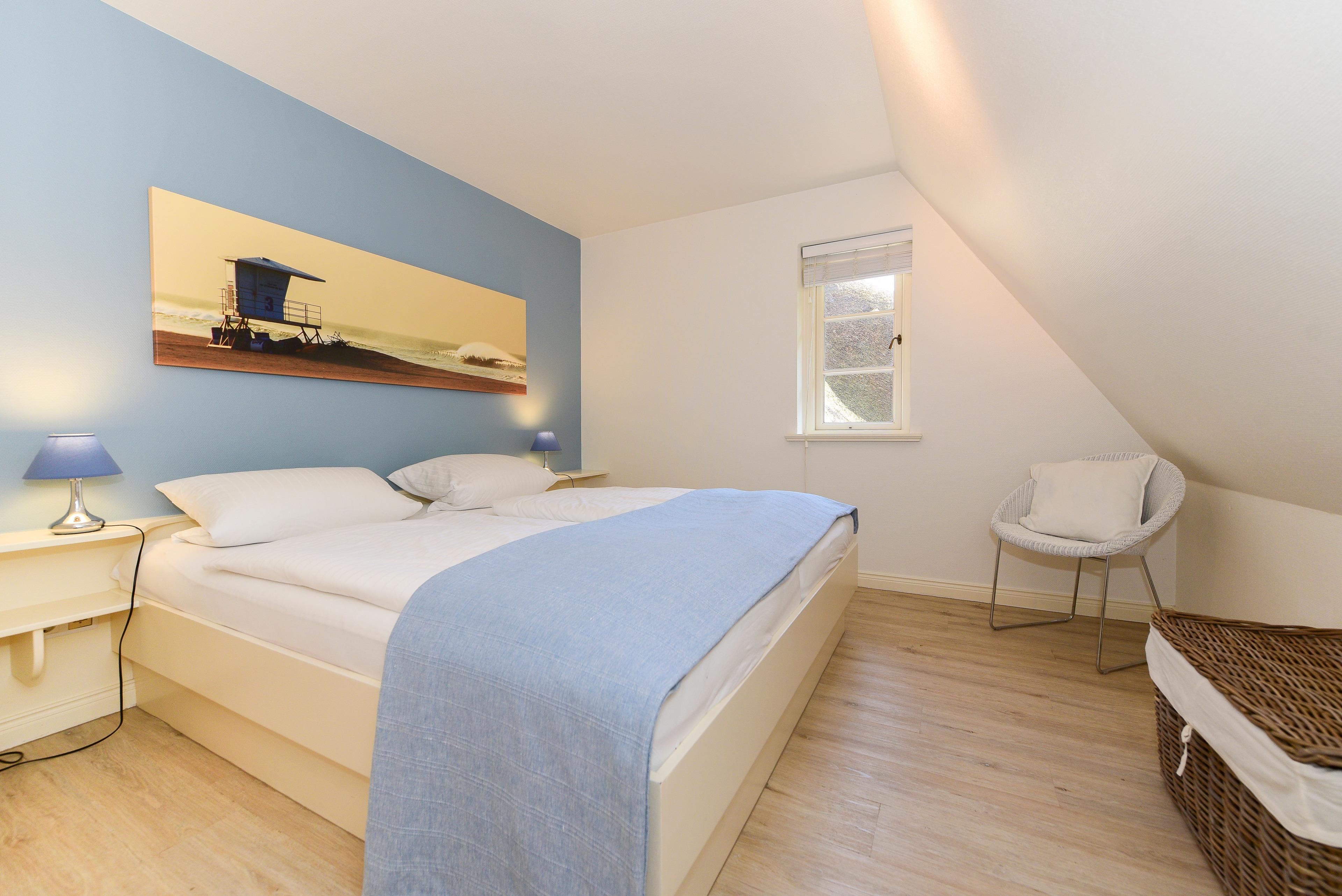 Im Obergeschoss befindet sich ein geräumiges Schafzimmer mit komfortablem Doppelbett und viel Stauraum sowie ein weiteres Schlafzimmer mit zwei Einzelbetten - perfekt für Kinder oder Erwachsene. Ein Kinderbett für die kleinsten Gäste ist inklusive.