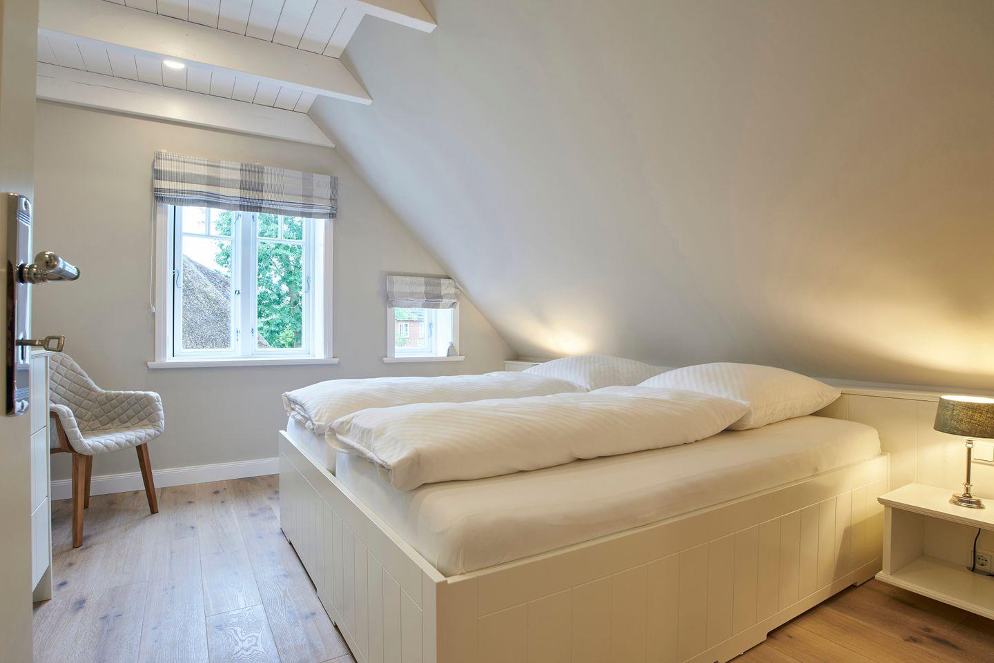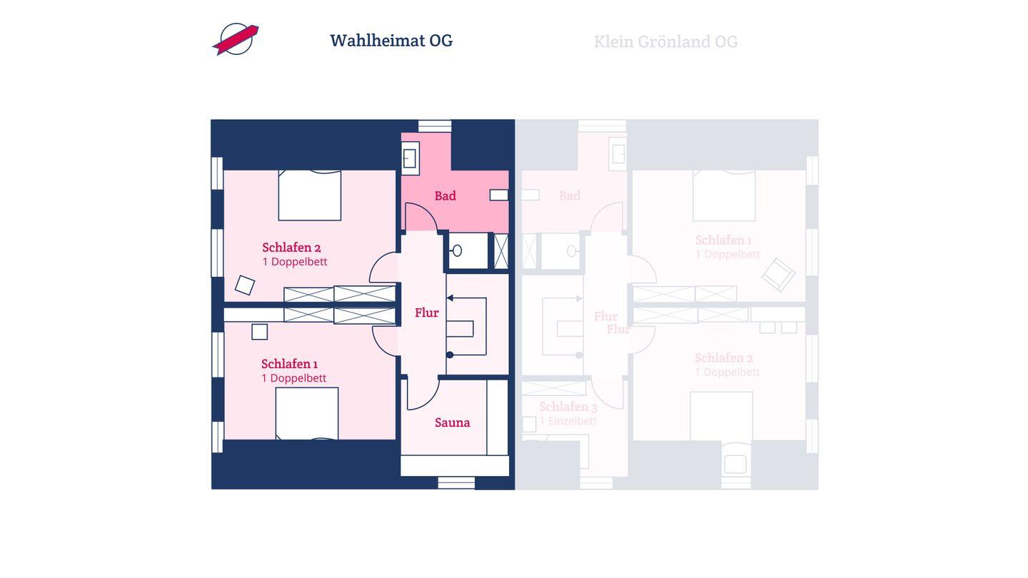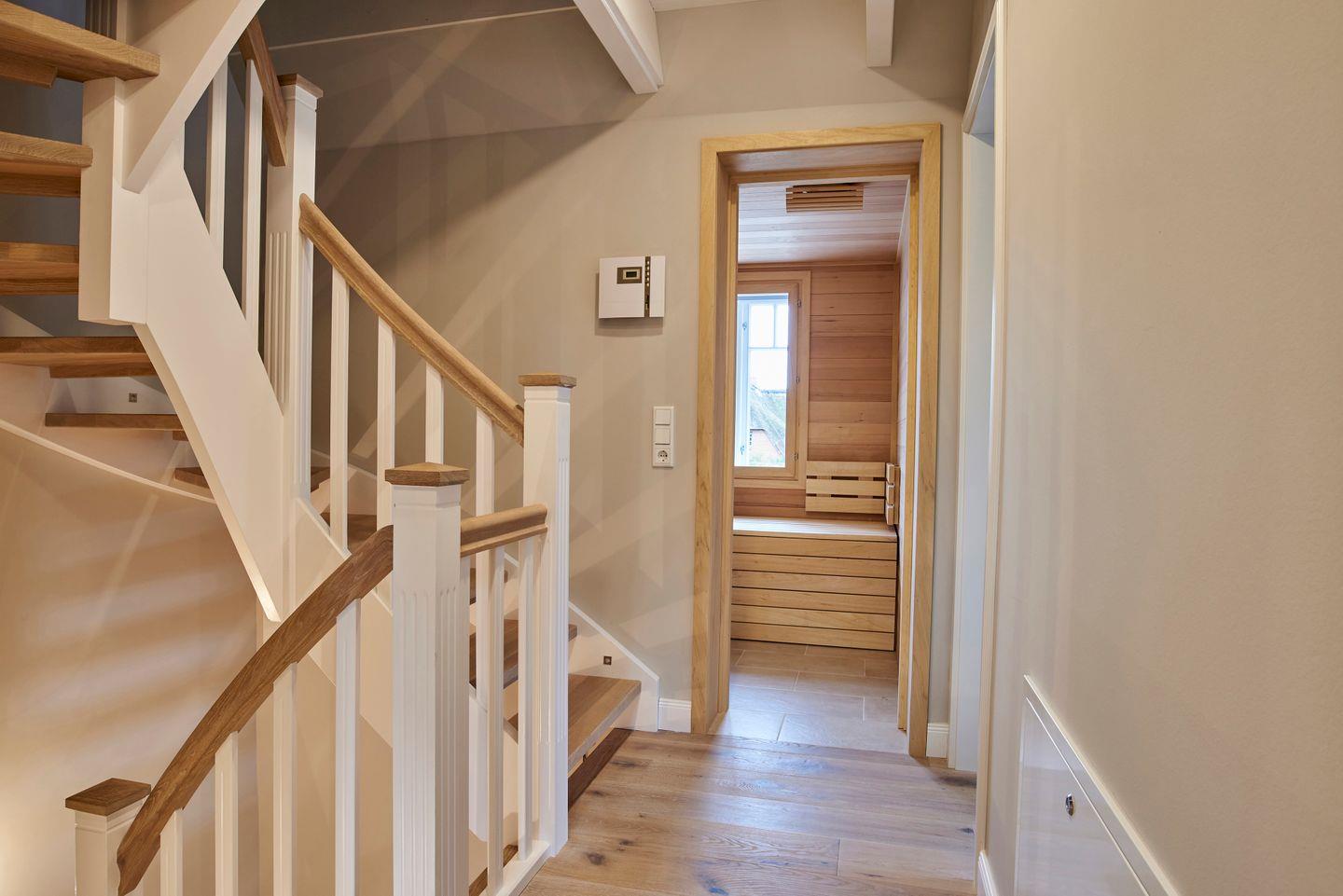 Im Obergeschoss befinden sich die beiden Schlafzimmer - jeweils mit einem Doppelbett ausgestattet - sowie ein weiteres Duschbad und die eigene Sauna. In den Schlafzimmern befinden sich weitere Smart-TVs. Zudem steht Ihnen im Spitzboden ein weiteres Doppelbett - ausschließlich für Kinder - zur Verfügung.