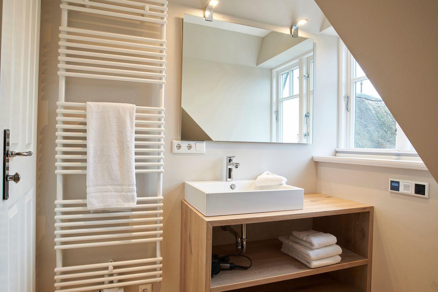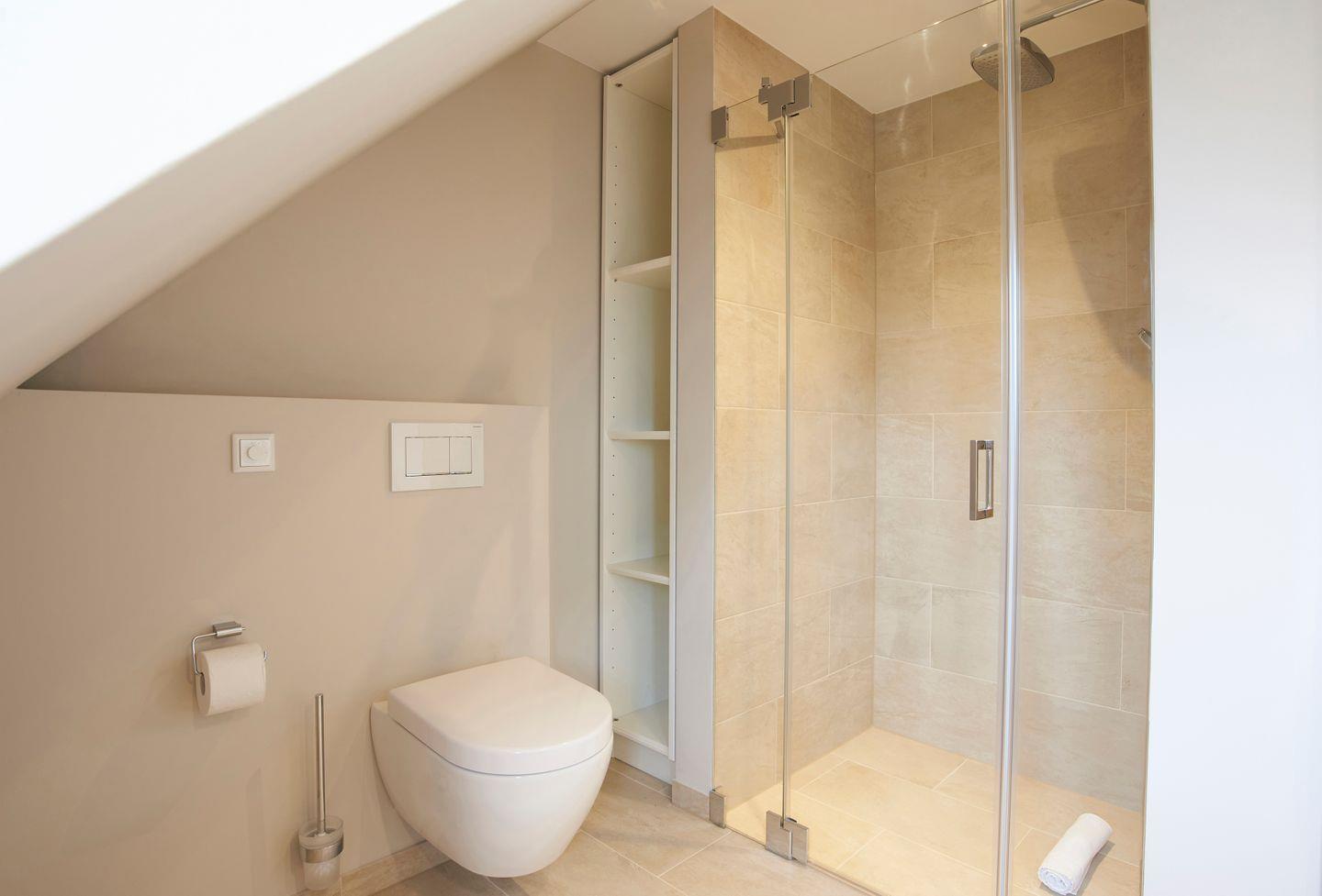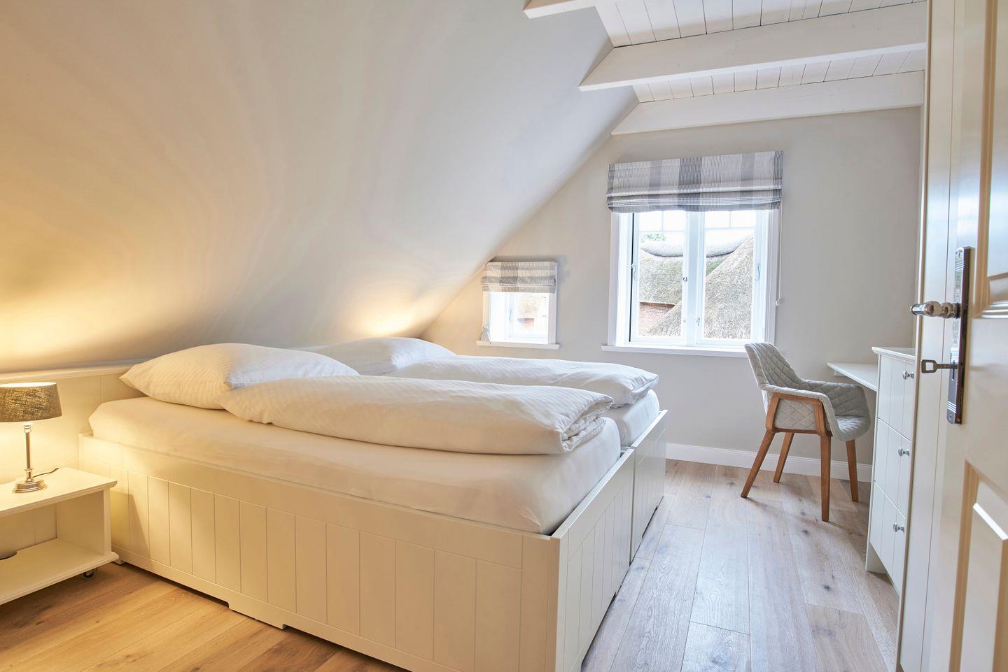 Im Obergeschoss befinden sich die beiden Schlafzimmer - jeweils mit einem Doppelbett ausgestattet - sowie ein weiteres Duschbad und die eigene Sauna. In den Schlafzimmern befinden sich weitere Smart-TVs. Zudem steht Ihnen im Spitzboden ein weiteres Doppelbett - ausschließlich für Kinder - zur Verfügung.