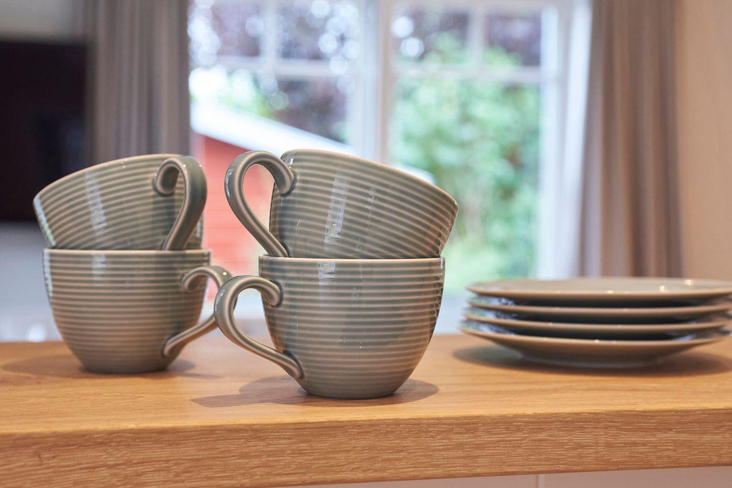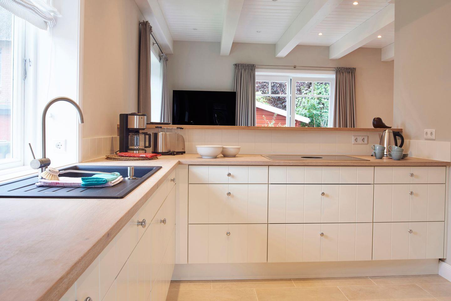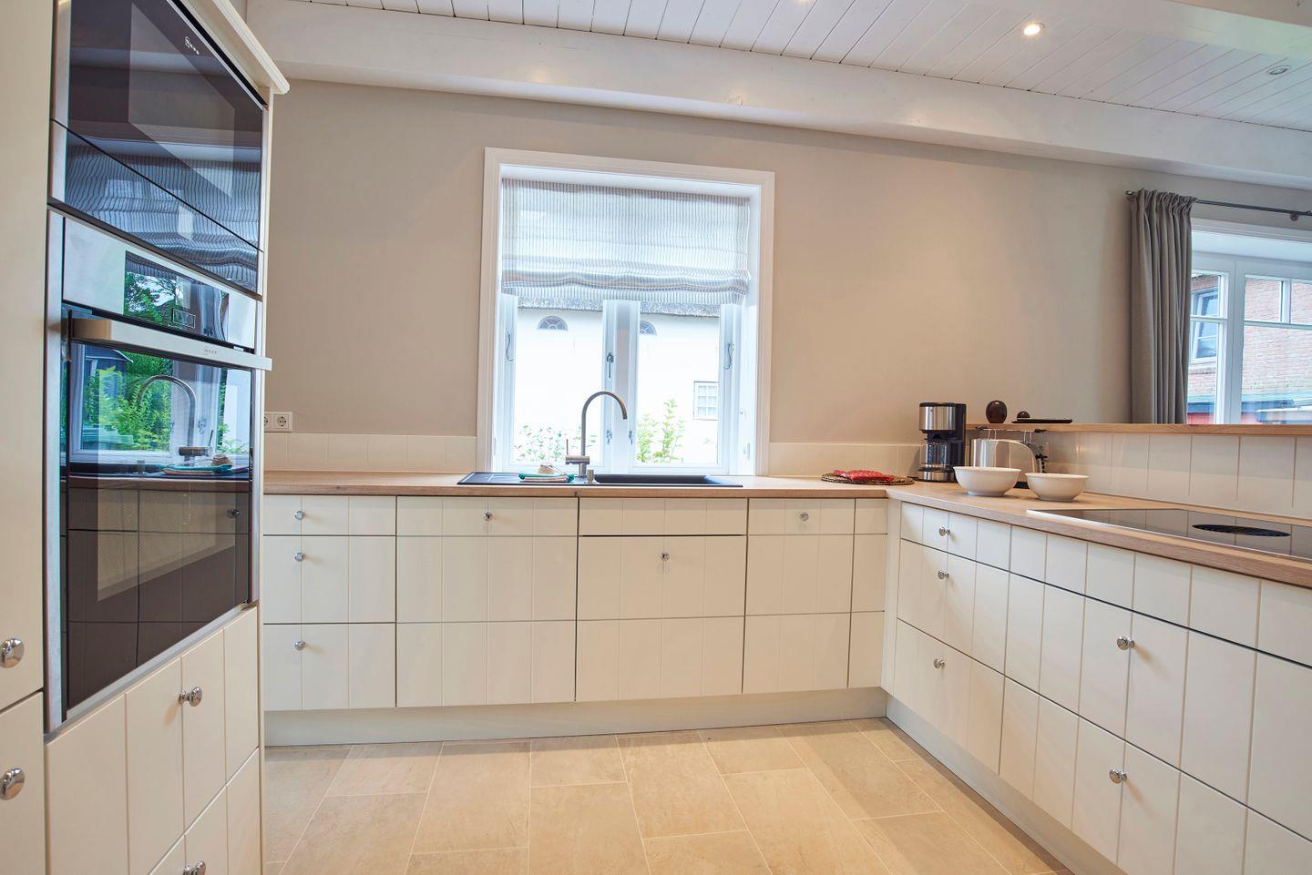 Im Erdgeschoss befinden sich der großzügige Wohn- und Essbereich mit offener Küche, ein Duschbad sowie ein von Außen zugänglicher Hauswirtschaftsraum mit Waschmaschine und Trockner der Marke Miele. Im Wohnbereich befindet sich ein Original Mylin-Kachelofen, der auch an kühleren Tagen angenehme Wärme spendet. Zudem gelangen Sie über den Wohnbereich direkt auf die eigene Terrasse und in den Garten. Die von einem Tischler gebaute Küche enthält hochwertige Einbaugeräte, wie ein Bora Pure Induktionskochfeld. Alle Einbauschränke sowie die Betten stammen von einer Insel-Tischlerei. Sämtliche Räume verfügen über Parkett- oder Granitböden sowie eine Fußbodenheizung.