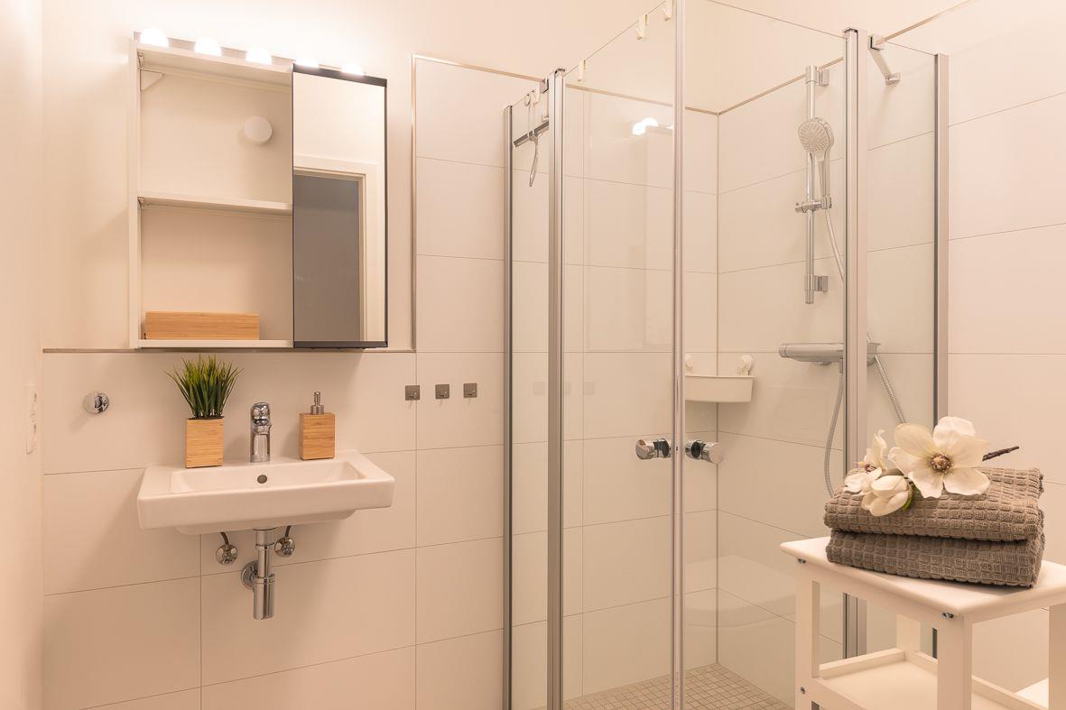 Das Badezimmer ist hell und modern gestaltet und mit einer ebenerdigen Dusche ausgestattet. Hier können Sie sich nach einem Tag an der Nordsee erfrischen und entspannen.