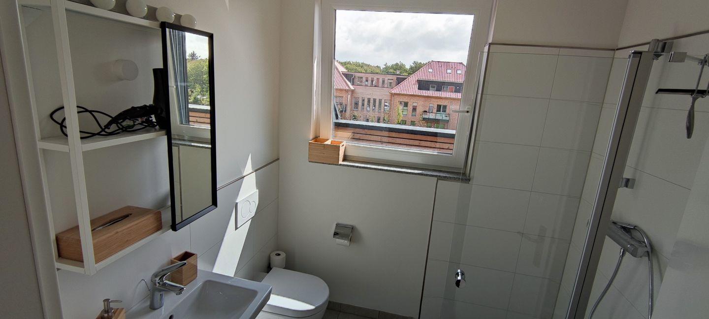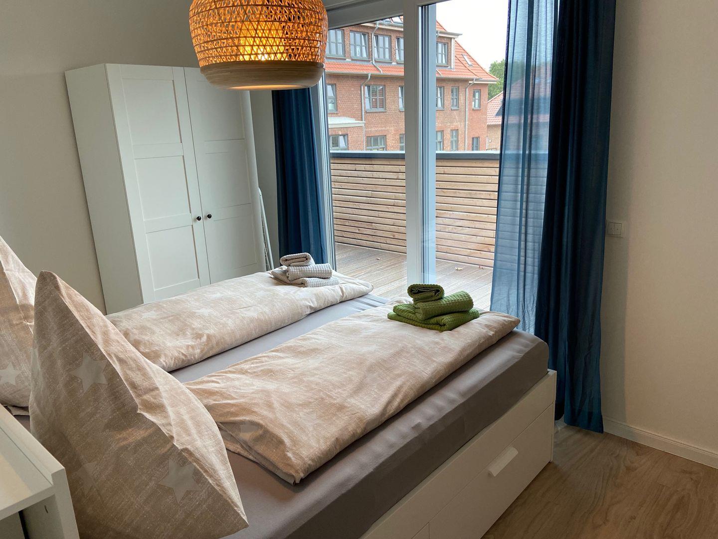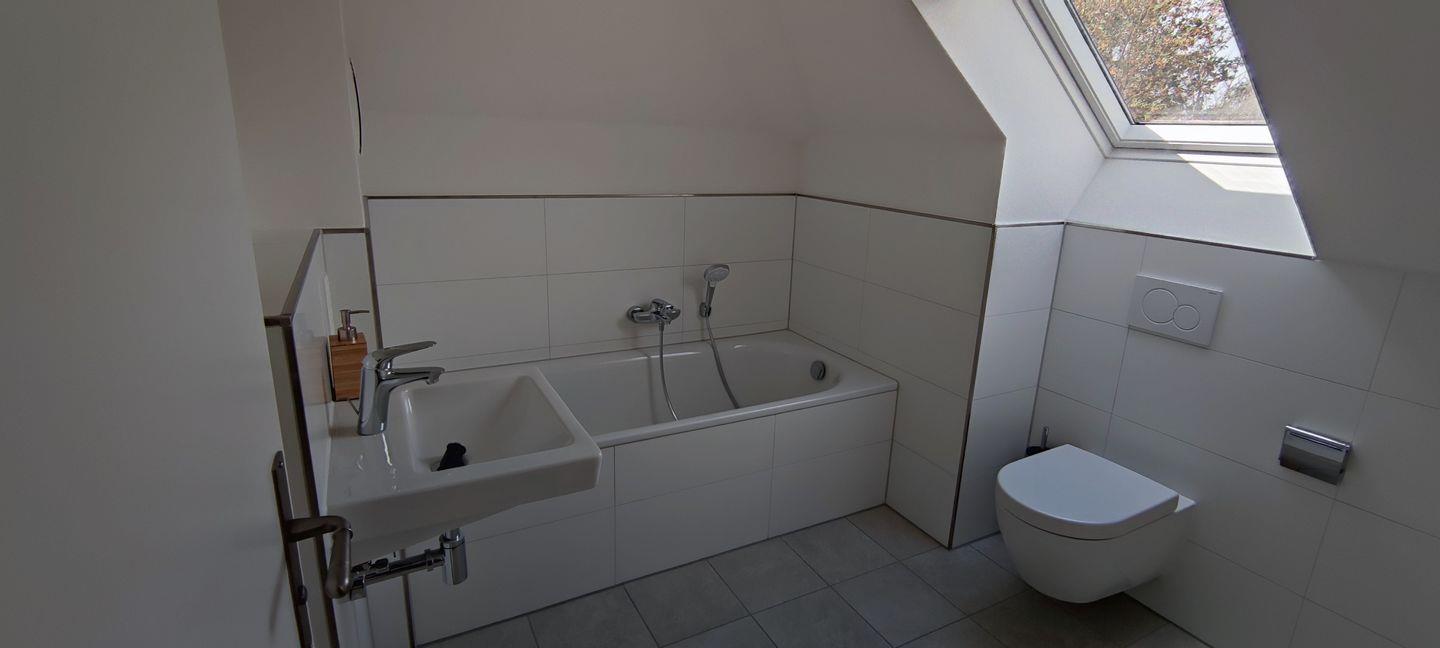 Das erste Highlight der Wohnung ist die Dachterrasse, die sowohl vom Wohnzimmer als auch von den beiden Schlafzimmern zu begehen ist. Von hier aus haben Sie einen wunderschönen Ausblick auf die Umgebung und können entspannte Abende bei einem Glas Wein verbringen. Eines der beiden Badezimmer ist mit einer ebenerdigen Dusche ausgestattet und sorgt für einen angenehmen Start in den Tag. Die beiden Schlafzimmer mit je einem Doppelbett (180*200) befinden sich ebenfalls im 2. Obergeschoss. Über eine Treppe gelangen Sie zum weiteren Highlight der Ferienwohnung: Das zweite Badezimmer, das über eine Badewanne und Tageslicht verfügt. Zusätzlich gibt es in diesem offenen Dachbodenbereich ein Tandembett, das zu einer Liegefläche mit 160*200cm erweitert werden kann