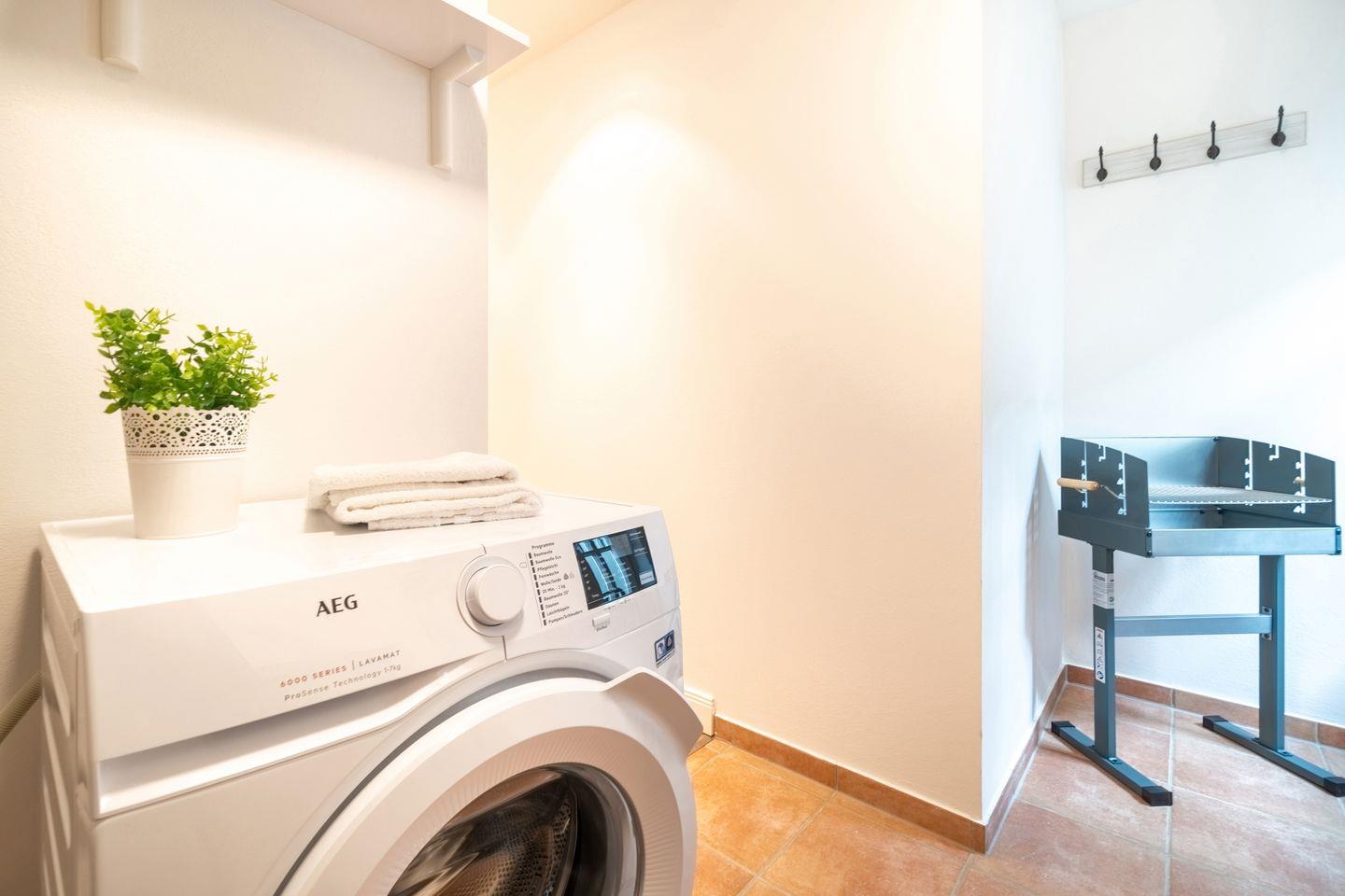 Im Souterrain befinden sich ein weiteres Schlafzimmer mit Doppelbett, ein Duschbad mit bodengleicher Dusche, die hauseigene Sauna und ein Hauswirtschaftsraum mit Waschmaschine.