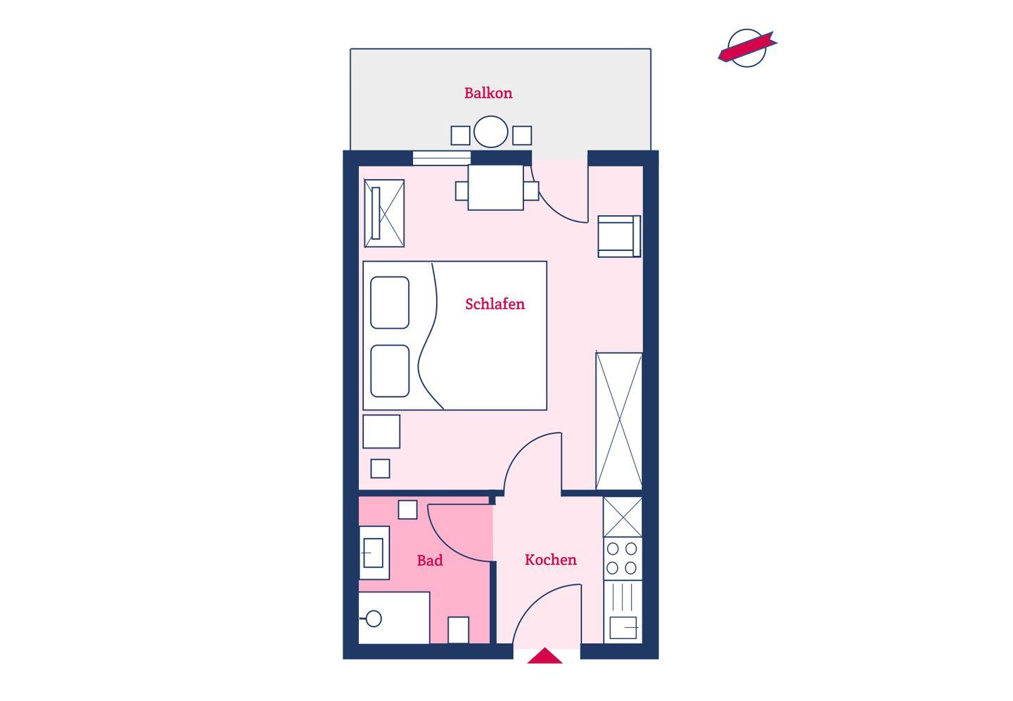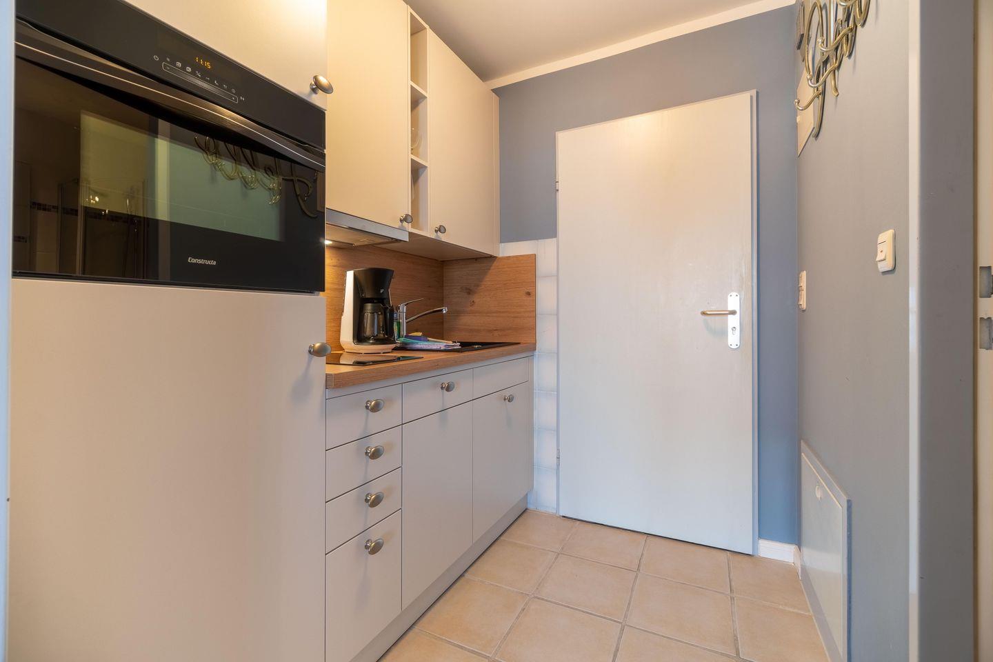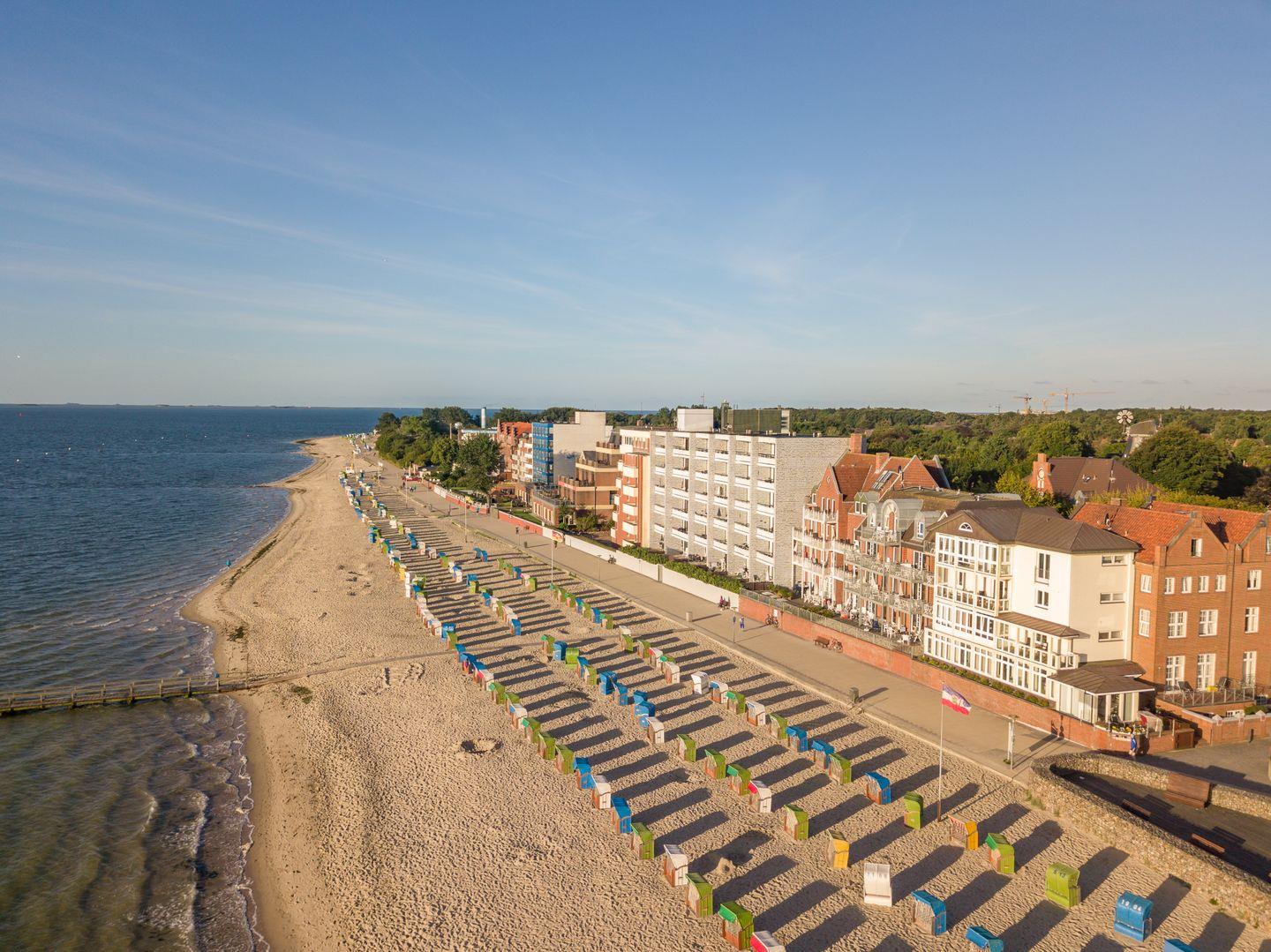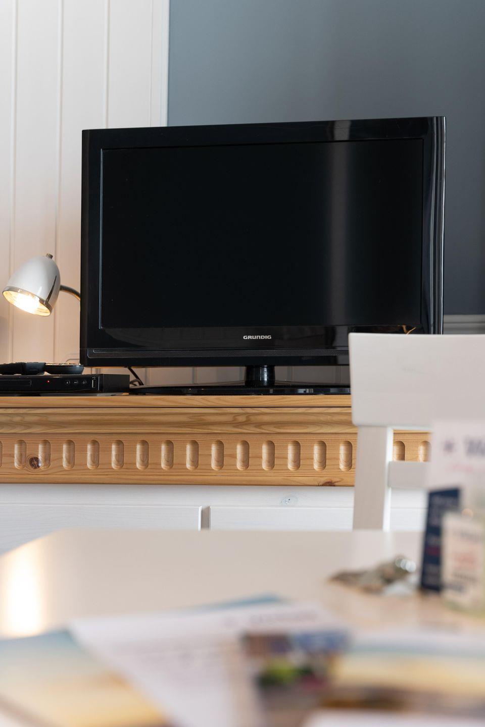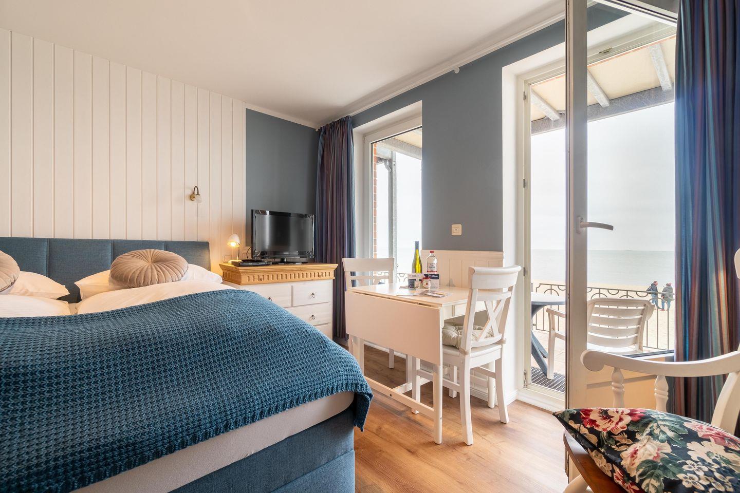 Die im Frühjahr 2022 renovierte, kleine 1-Zimmer-Wohnung Langeland befindet sich im Erdgeschoss mit besonders guter Aussicht auf den Strand und das Meer. Einmalig ist der weite Blick aus dem südöstlich zum Meer ausgerichteten Fenster und der bodentiefen Tür im Wohn-/Schlafzimmer. Bei diesem Wohnungstyp liegt der Schlafbereich auf der Meerseite des Hauses, hier hören Sie das Meeresrauschen bei offenem Fenster auch beim Einschlafen.