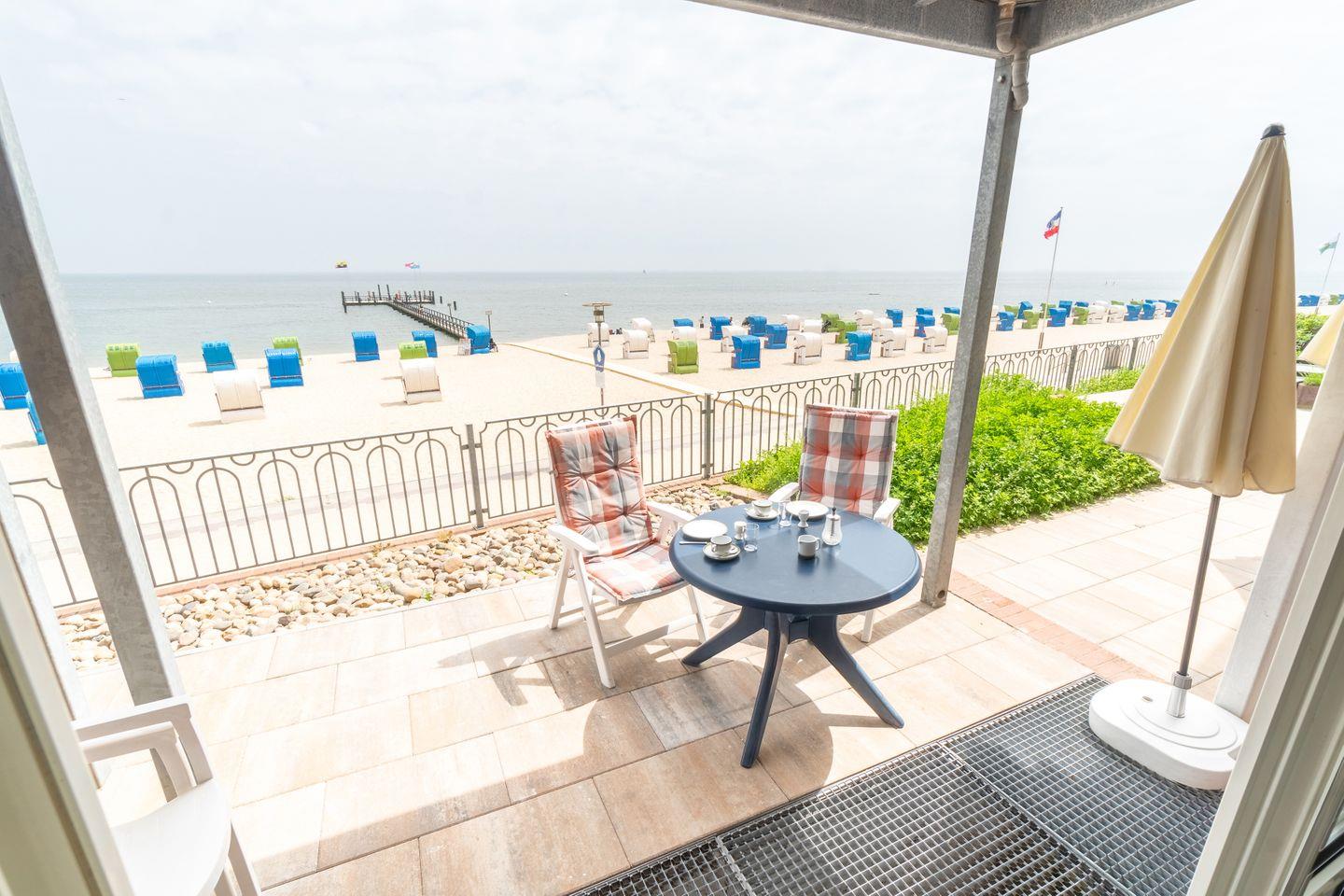 Das Highlight dieser Ferienwohnung bildet sicherlich die Terrasse mit unvergleichlichem Strand- und Meerblick. Zudem befinden sich eine Sauna und ein Schwimmbad im Haus, die gemeinschaftlich genutzt werden können.