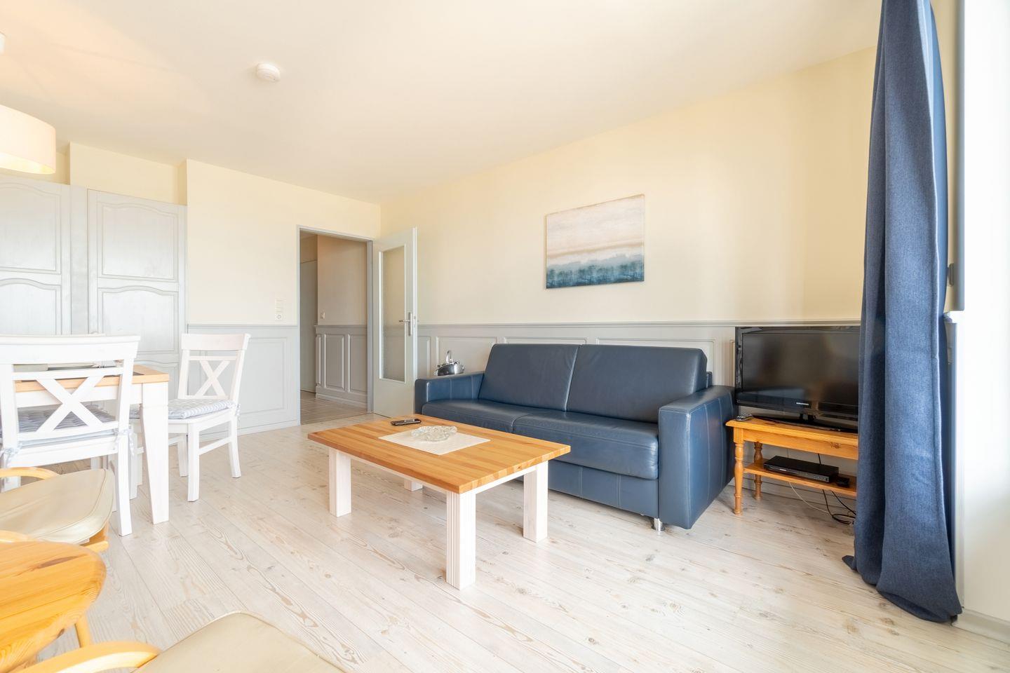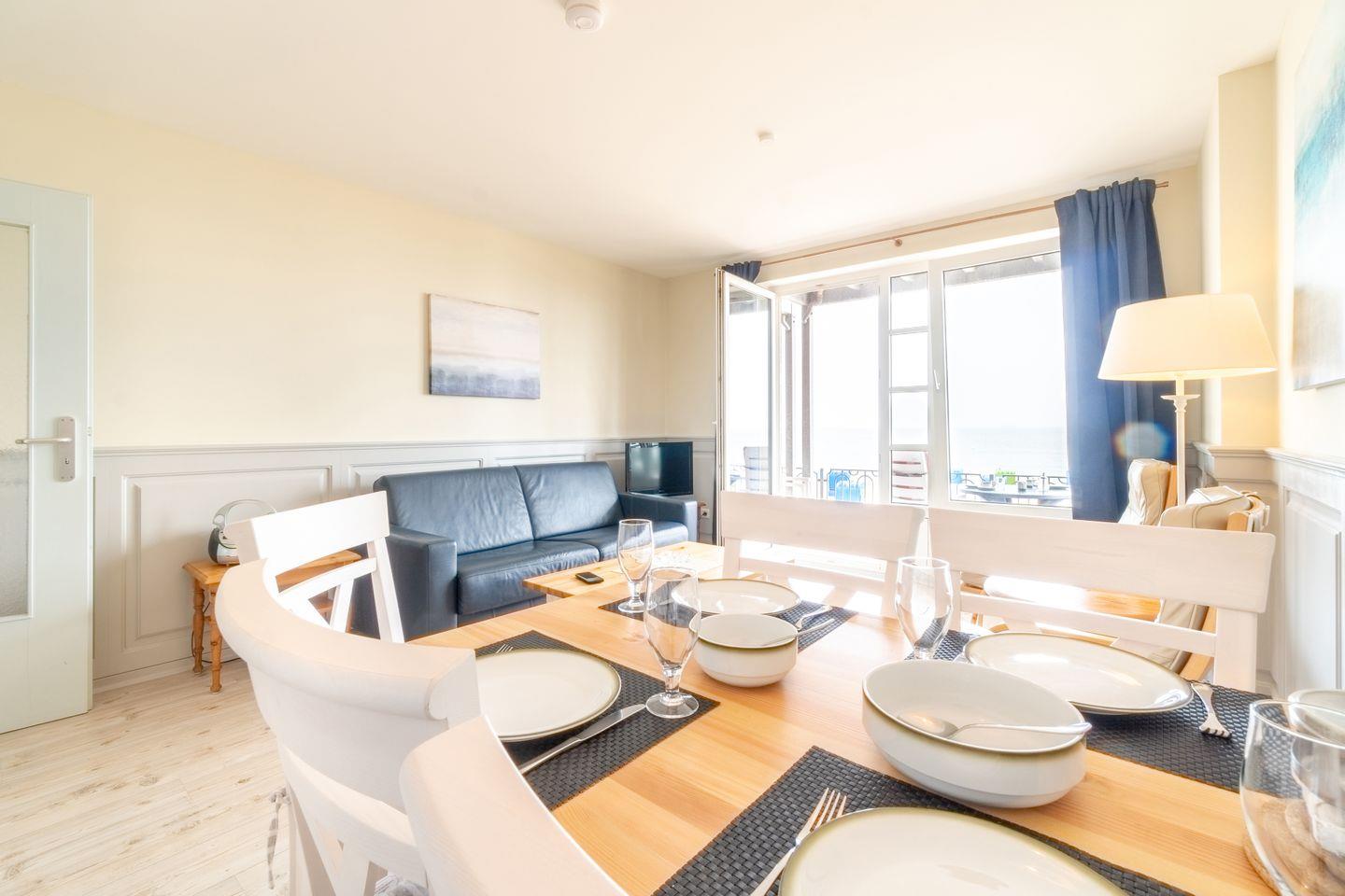 Die 2-Zimmer-Wohnung Fünen befindet sich im Erdgeschoss mit einer besonders guten Aussicht auf den Strand und das Meer. Einmalig ist der weite Blick aus dem südöstlich zum Meer ausgerichteten, bodentiefen Fenstern im Wohnzimmer. Genießen Sie schöne Stunden auch auf der Terrasse vor dem Wohnzimmer unmittelbar an der Strandpromenade oder das rauschende Meer bei offenen Fenstern. Die Ferienwohnung Fünen verfügt zudem über eine separate Küche, ein Schlafzimmer mit Doppelbett und ein Duschbad. Im Wohnbereich befindet sich eine Schlafcouch für 2 Personen.