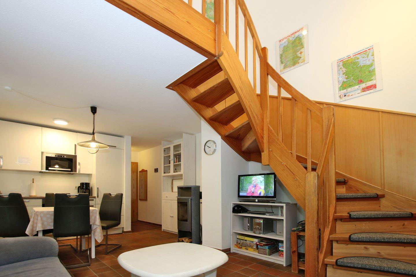 Vom Wohnzimmer führt eine Galerietreppe in die 1. Etage und in den Spitzboden. In der 1. Etage befindet sich ein SCHLAFZIMMER mit Doppelbett (1,80 x 2m), Kleiderschrank, SAT/TV .