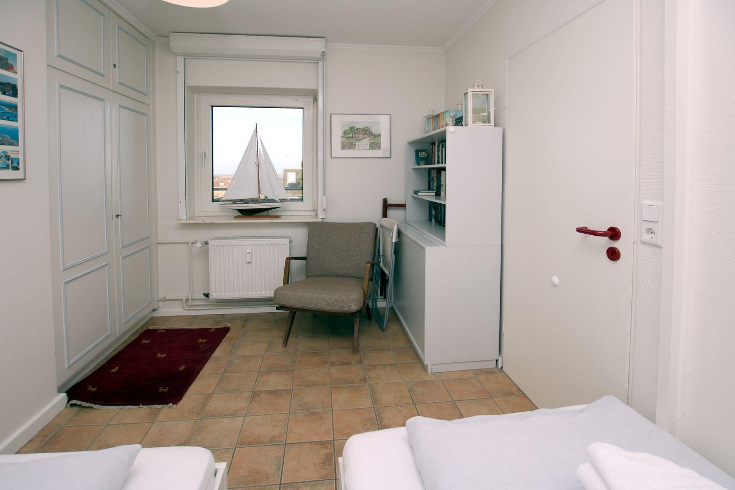 ZEILE. SCHLAFZIMMER 1 mit 2 Einzelbetten (0,90 x 2 m) und eingebautem Kleiderschrank (weiße Möbel). SCHLAFZIMMER 2 mit 2 Einzelbetten (0,90 x 2 m) und 2 eingebauten Schränken (weiße Möbel), Blick auf den Hafen und das Festland. BAD mit Dusche und WC, Blick auf das Festland. Das Haus verfügt über einen Fahrstuhl bis in die 5. Etage. Ein Parkplatz steht nur zur Verfügung, wenn ein Platz frei ist. Es gibt für das ganze Haus nur ca. 6 Parkplätze. Die Wohnung liegt zentral in der Fußgängerzone und hat einen sagenhaften Blick aufs Wasser und auf Wyk. Zum Wellenbad sind es ca. 10 bis 15 Minuten Fußweg.