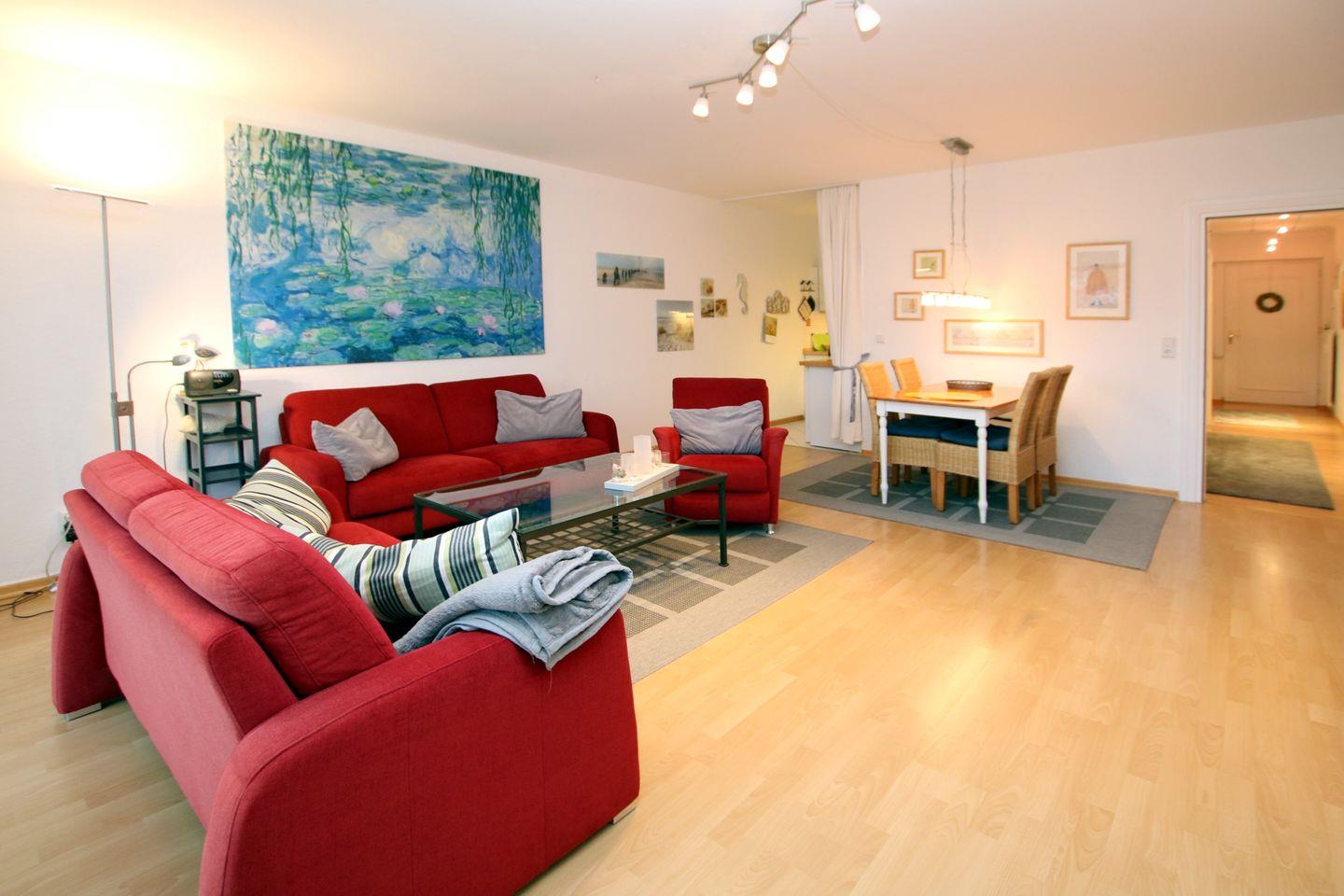 BALKON: Südseite 4 Gartenstühle, Strandkorb und 1 Liege. Die Wohnung ist vollständig mit Laminat ausgelegt. Eine sehr gemütliche und großzügige Wohnung in der Innenstadt. Die Wohnung ist liebevoll mit Accessoires und Bildern von den Eigentümern eingerichtet worden. Zum Strand sind es ca. 300 m Fußweg. Einkaufsmöglichkeiten in der Nähe. Ein Parkplatz ist nicht vorhanden. Zum Be- und Entladen ist es erlaubt in die Fußgängerzone zu fahren. Im Hof befindet sich ein ein überdachter Fahrradständer. Im Keller des Hauses finden Sie eine Waschmaschine und einen Trockner.