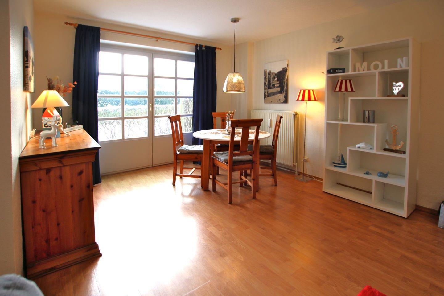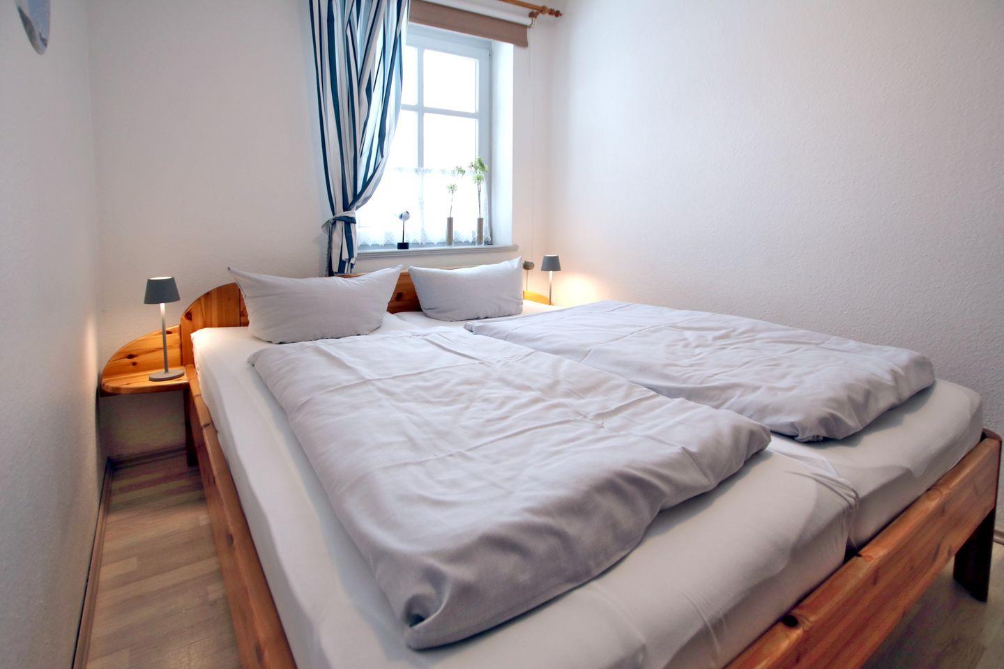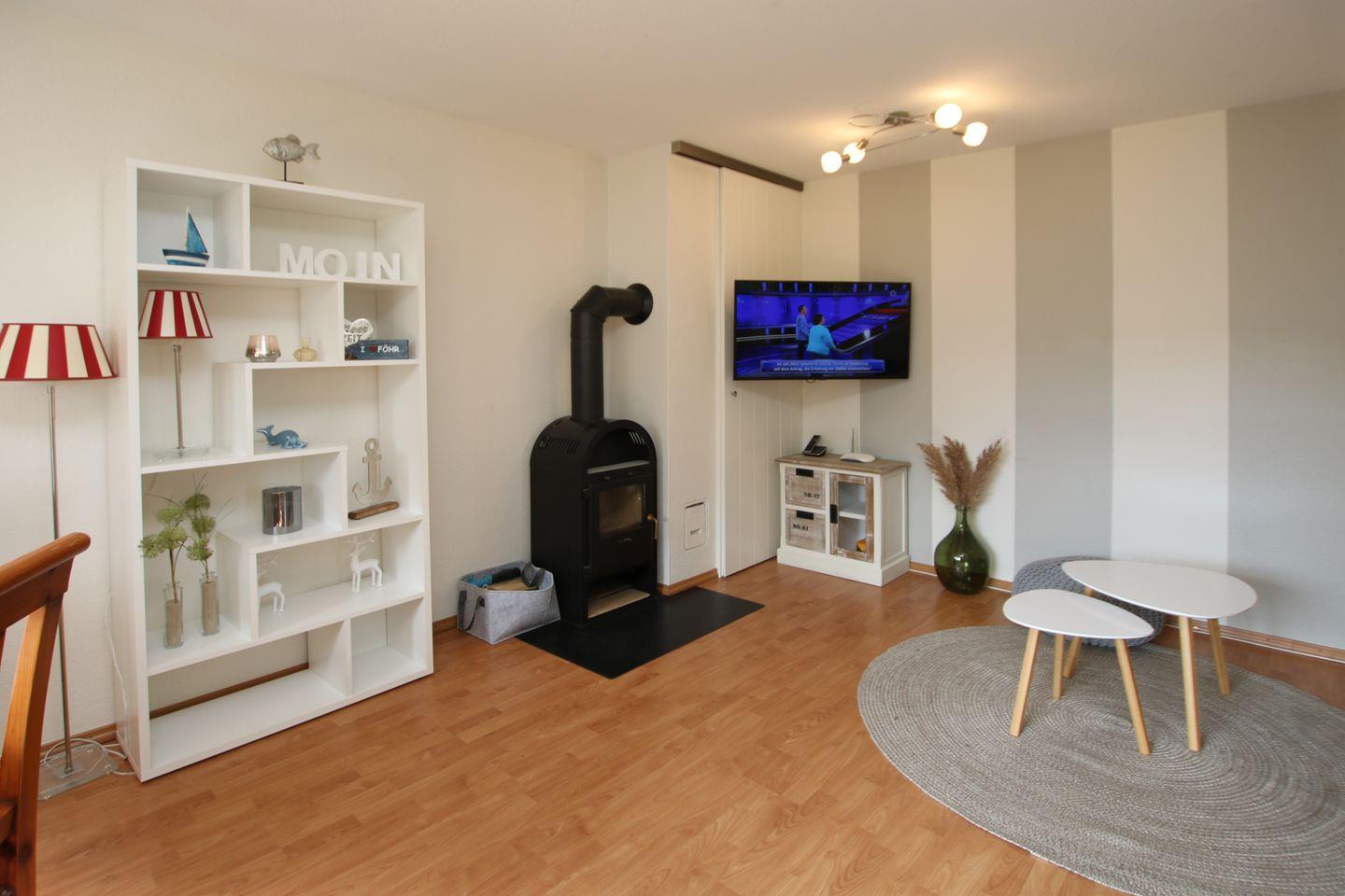2-Zimmer- Nichtraucherwohnung im Erdgeschoß, ca. 48 qm mit Ostterrasse an der Vorderseite des Hauses. WOHNZIMMER mit Sofa, Essplatz mit 4 Stühlen und Kommode. SCHLAFZIMMER mit Doppelbett (1,60 m x 2 m) und Kleiderschrank. BAD mit Dusche und WC. FLUR mit Garderobe. SEPARATE KÜCHE mit kleinem Sitzplatz. Im KELLER stehen Waschmaschine und Trockner auf Münzbasis zur Verfügung. Fahrradständer und Spielecke für Kinder am Haus. LAGE: Ruhig und dörflich an der Marsch. Bäcker und Bushaltestelle im Dorf. Zum Zentrum von Wyk, Strand, Kurmittelhaus und Wellenbad sind es ca. 20 - 30 Min. Fußweg.