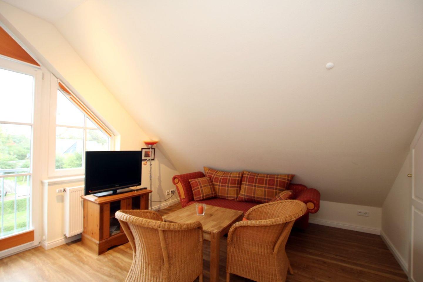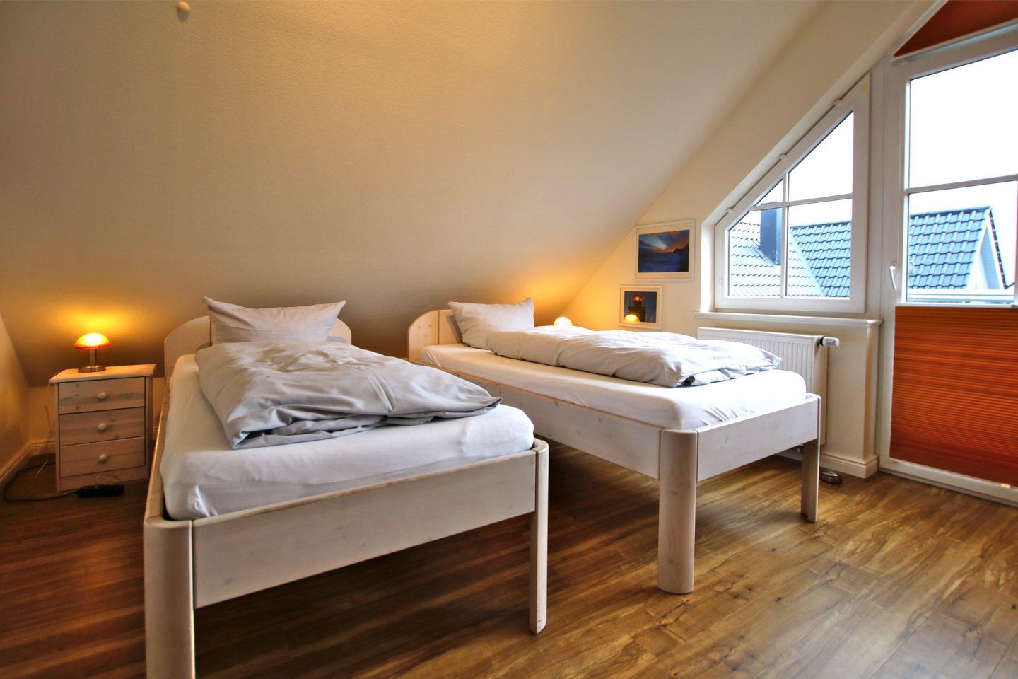 - Schlafzimmer 2 im Spitzboden mit 2 Einzelbetten, Kleiderschrank, Couch und TV