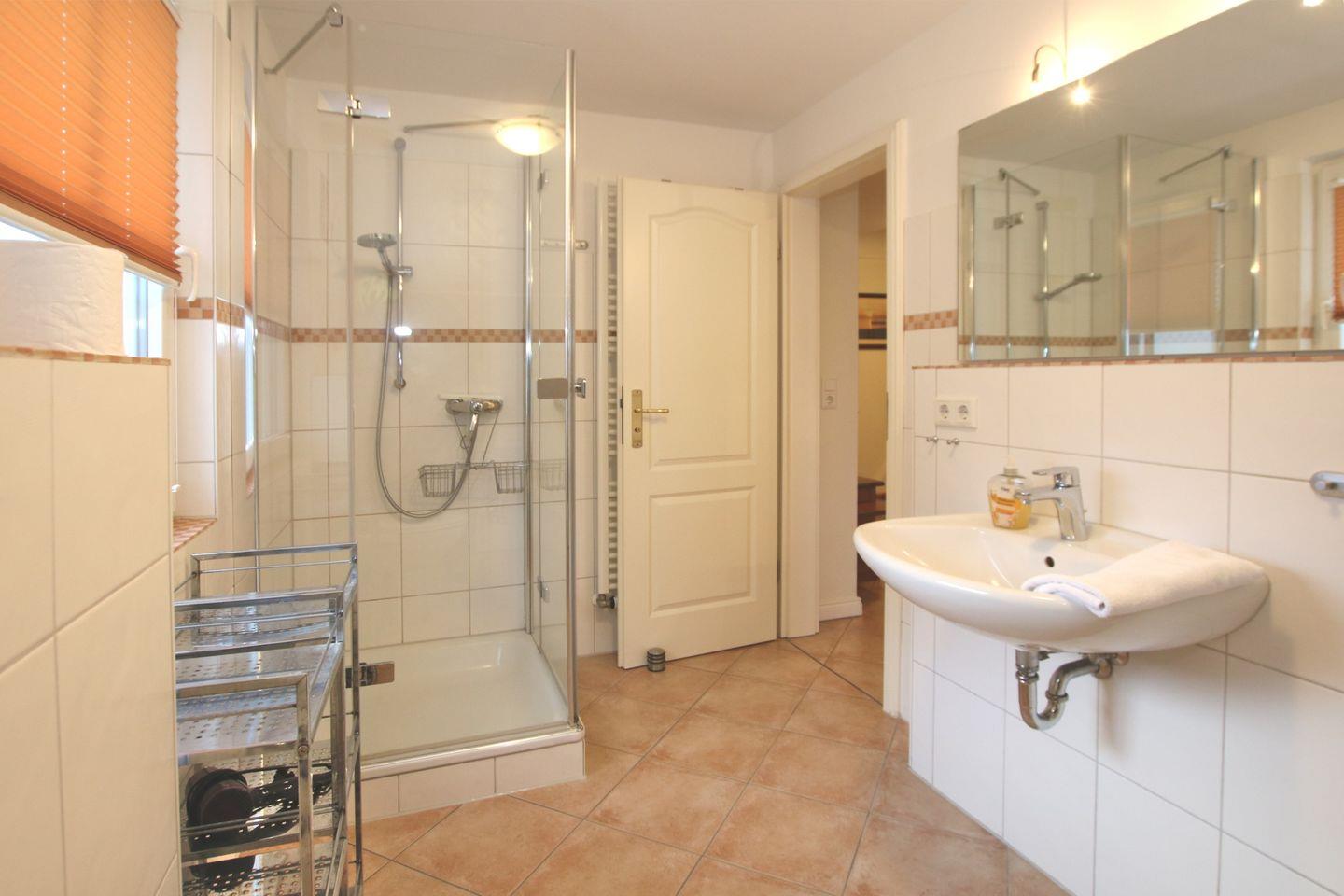 - Badezimmer mit Fußbodenerwärmung, Duschwanne, WC, Waschmaschine/ Trockner