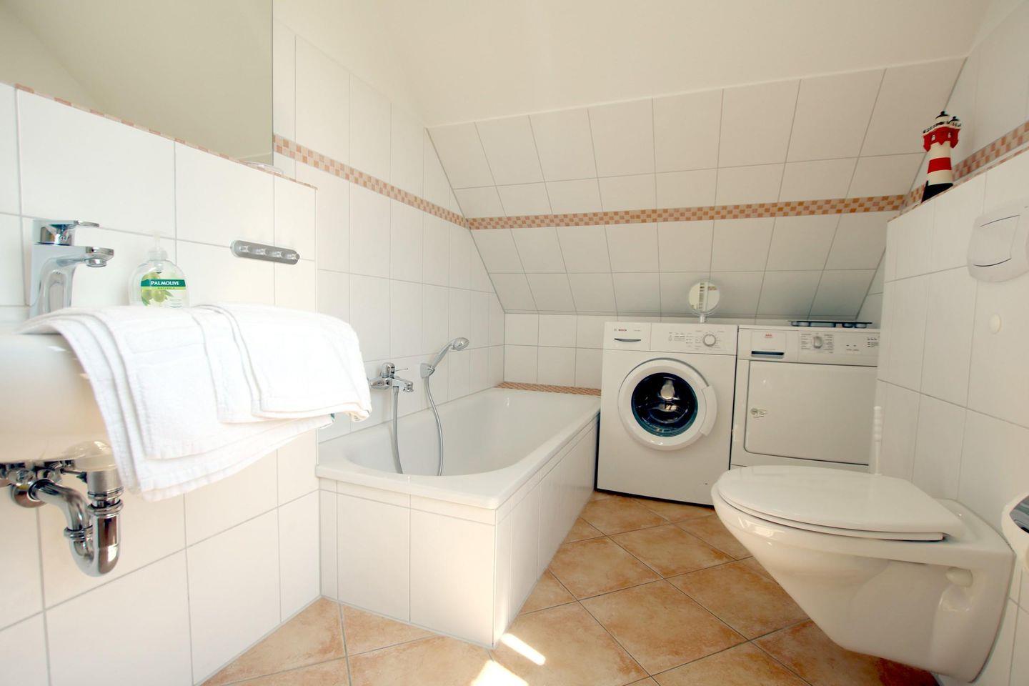 Das große, helle TAGESLICHTBAD ist vollausgestattet mit Badewanne, Dusche und WC. Im Badezimmer sind Waschmaschine und Trockner für sie untergebracht und für die kalten Tage ist eine Fußbodenerwärmung installiert.