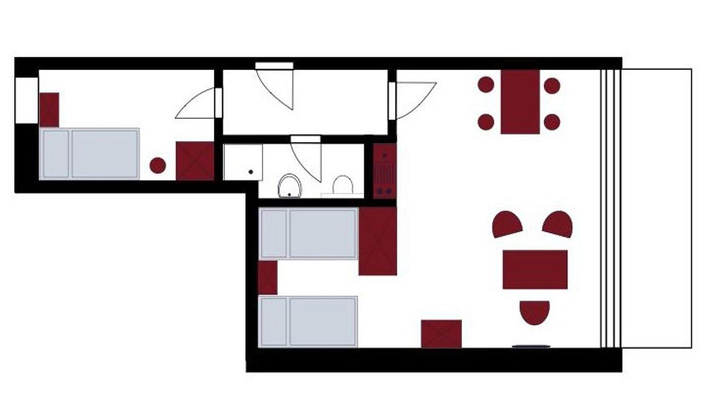 - Wohn-/ Schlafraum mit 2 Einzelbetten, Sitzecke, Essplatz, Pantryküche, TV