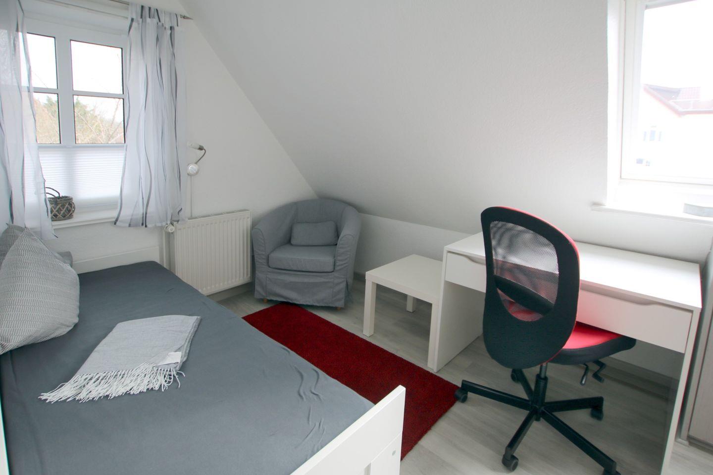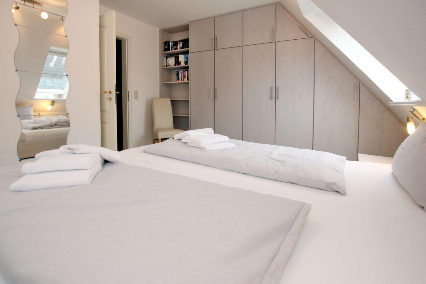 - Schlafzimmer mit 2 Einzelbetten, Kleiderschrank im OG, Aufenthaltsraum mit Schreibtisch, Sessel, Couch im OG