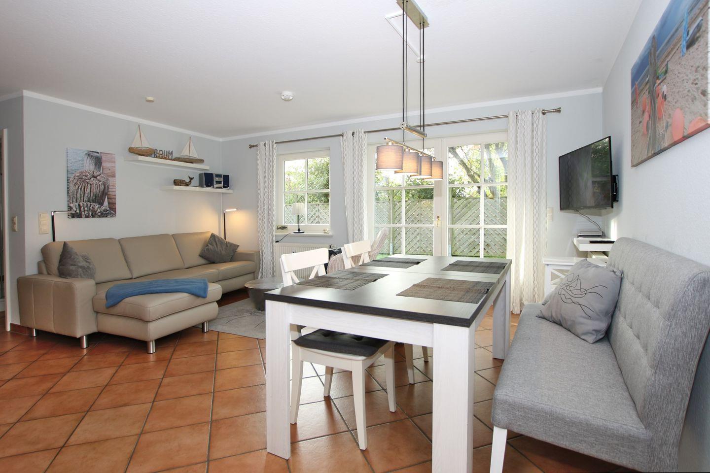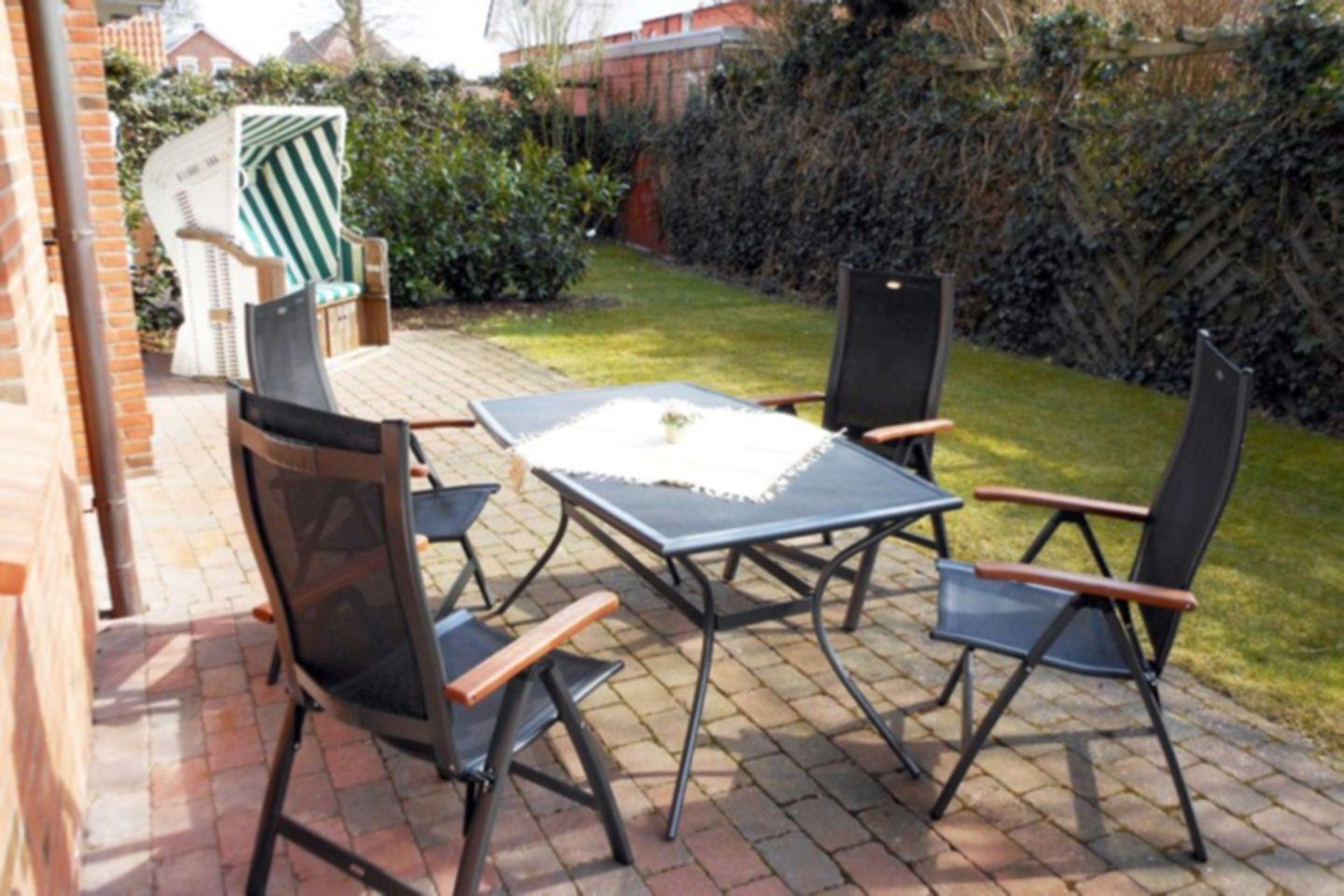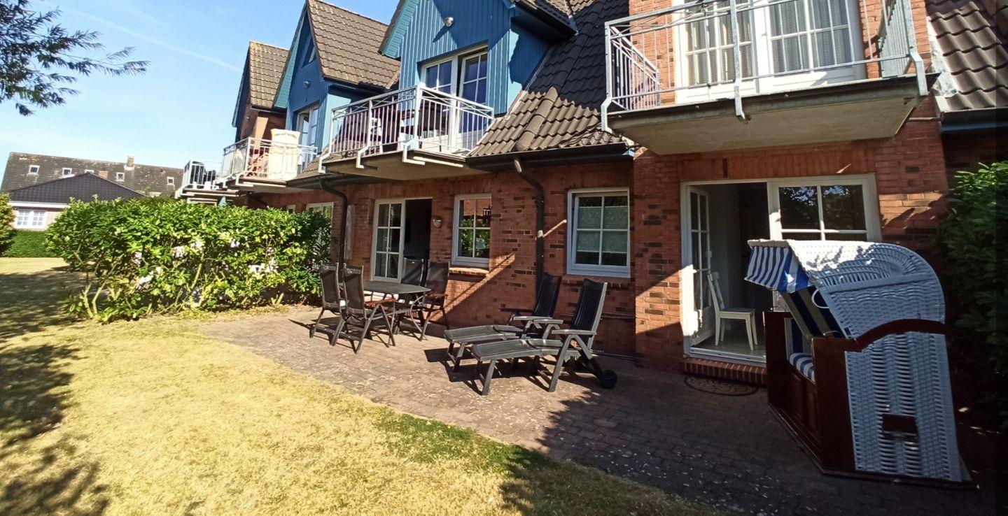Sie verfügt über eine tolle große Südterrasse mit Gartenbereich, auf die man sowohl vom Wohnraum als auch vom Schlafzimmer Zugang hat. Ein schöner Strandkorb und Gartenmöbel stehen zur Verfügung. Der mit Terrakotta-Fliesen ausgelegte Wohn- und Essbereich ist u.a. ausgestattet mit einem gemütlichen Ledersofa, einem Esstisch mit 4 Stühlen und einer neuen modernen Küchenzeile mit Mikrowelle. Internetanschluss ist über WLAN gegeben.