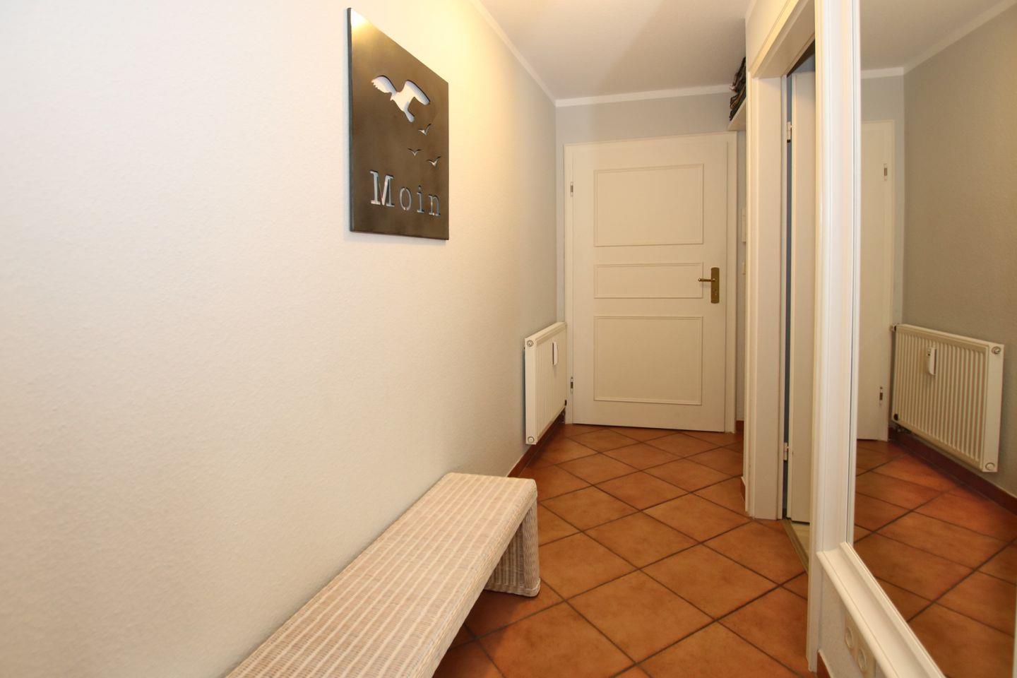 Im Flur befindet sich eine Garderobe, ein Ganzkörperspiegel und eine Sitzbank. Schlafzimmer 1 verfügt über ein Einzelbett (1,40mx 2m)