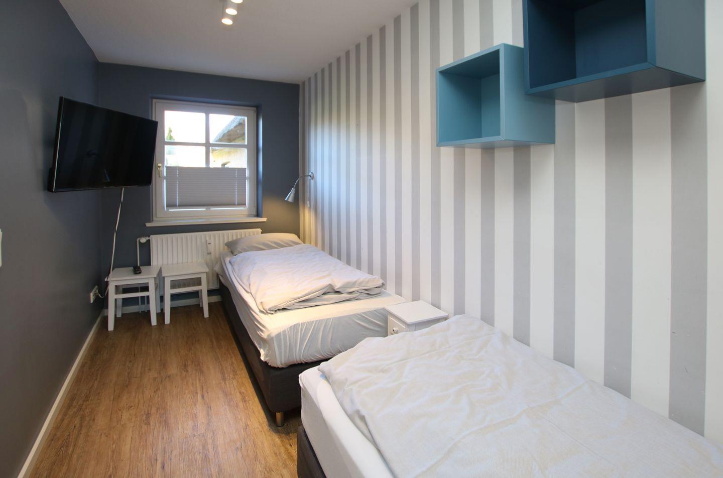 - Kinderzimmer mit zwei hintereinander stehenden Einzelbetten und TV- Gerät