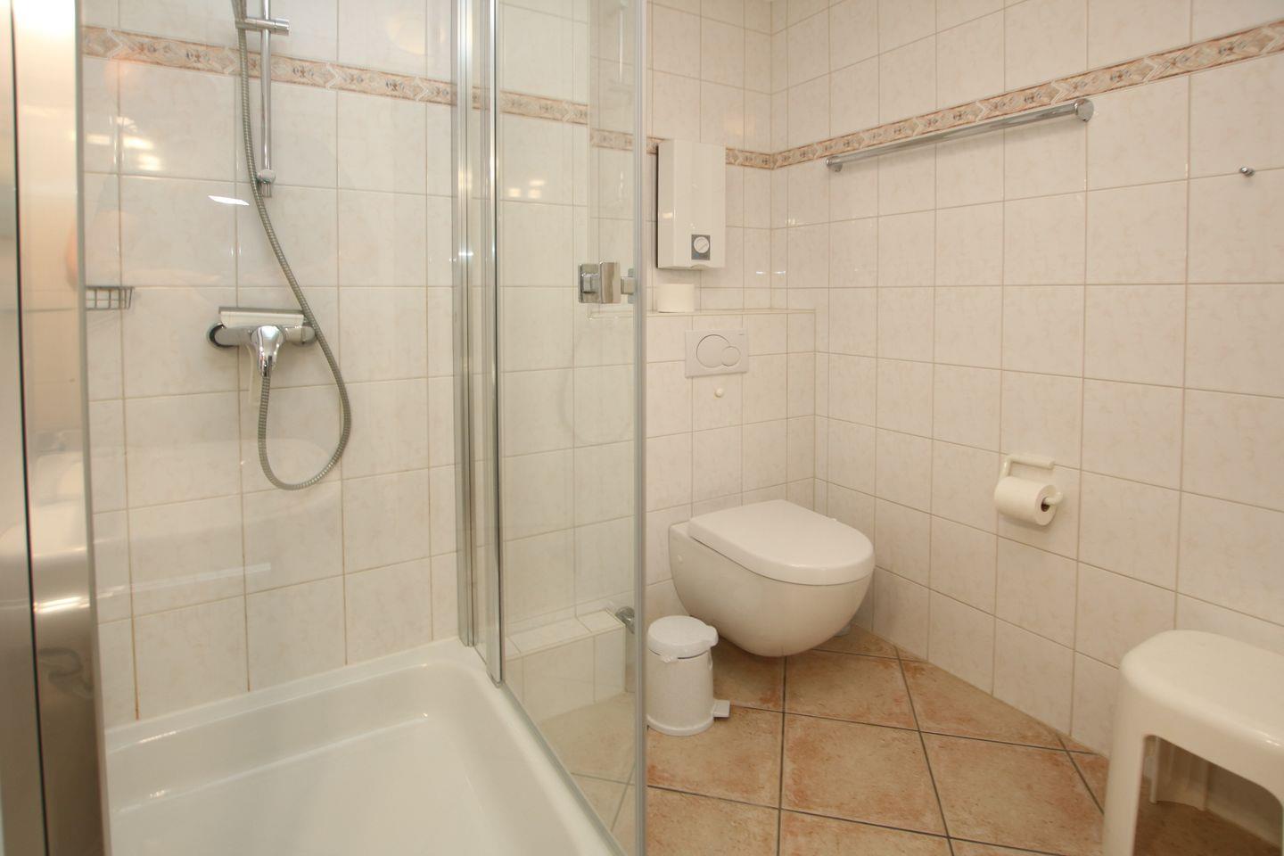 WOHNZIMMER: Ledercouchen 2 er und 3 er, Sessel mit Couchtisch und Kleiderschrank. KÜCHE: Einbauküche mit allen Extras, Eßplatz mit Eckbank und 3 Stühlen. SCHLAFZIMMER 1: Doppelbett (1,80x2m) und Kleiderschrank. SCHLAFZIMMER 2: Doppelbett (1,40x2m) und 1 Einzelbett (0,90x2m). BAD: Dusche/WC. Die Wohnung ist komplett mit Fliesen ausgelegt. Parkplatz ist nicht am Haus, es kann aber am Wellenbad geparkt werden. Fahrstuhl im Haus. Das Haus ist vorne und vom Parkplatz aus nur über Treppenstufen zu erreichen. Nachtspeicherheizung. Waschmaschine in der Küche, Balkonmöbel, Allergikergerechte Ausstattung, Belegung mit 5 Personen nur mit max. 4 Erwachsenen.