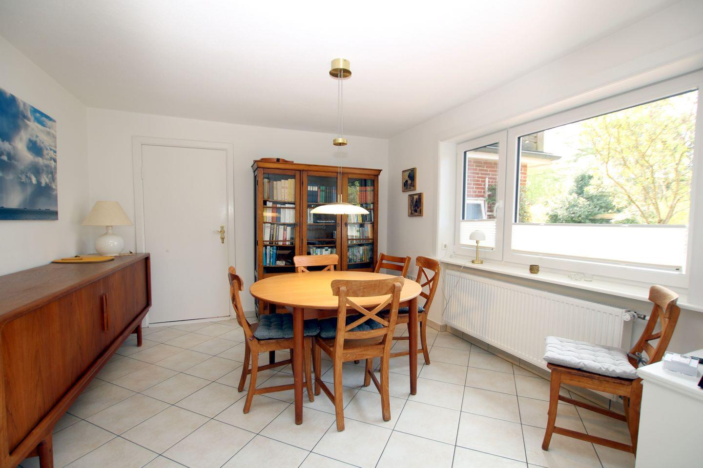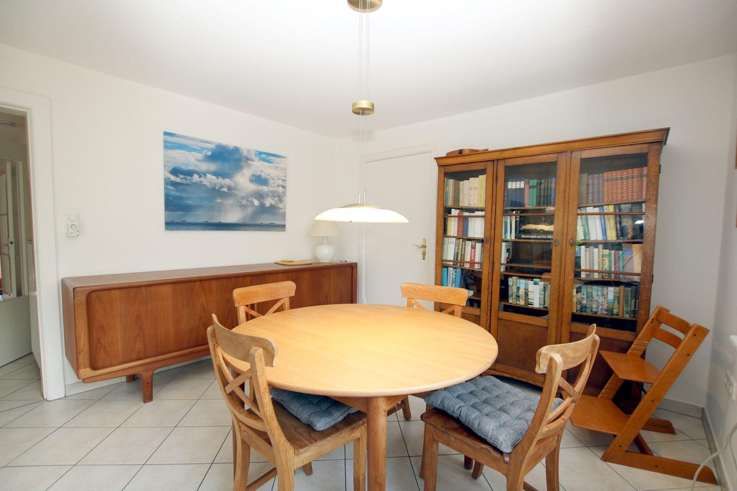 - Wohnzimmer mit Ledersitzecke, Essbereich mit großem Tisch und 6 Stühlen, Kaminofen