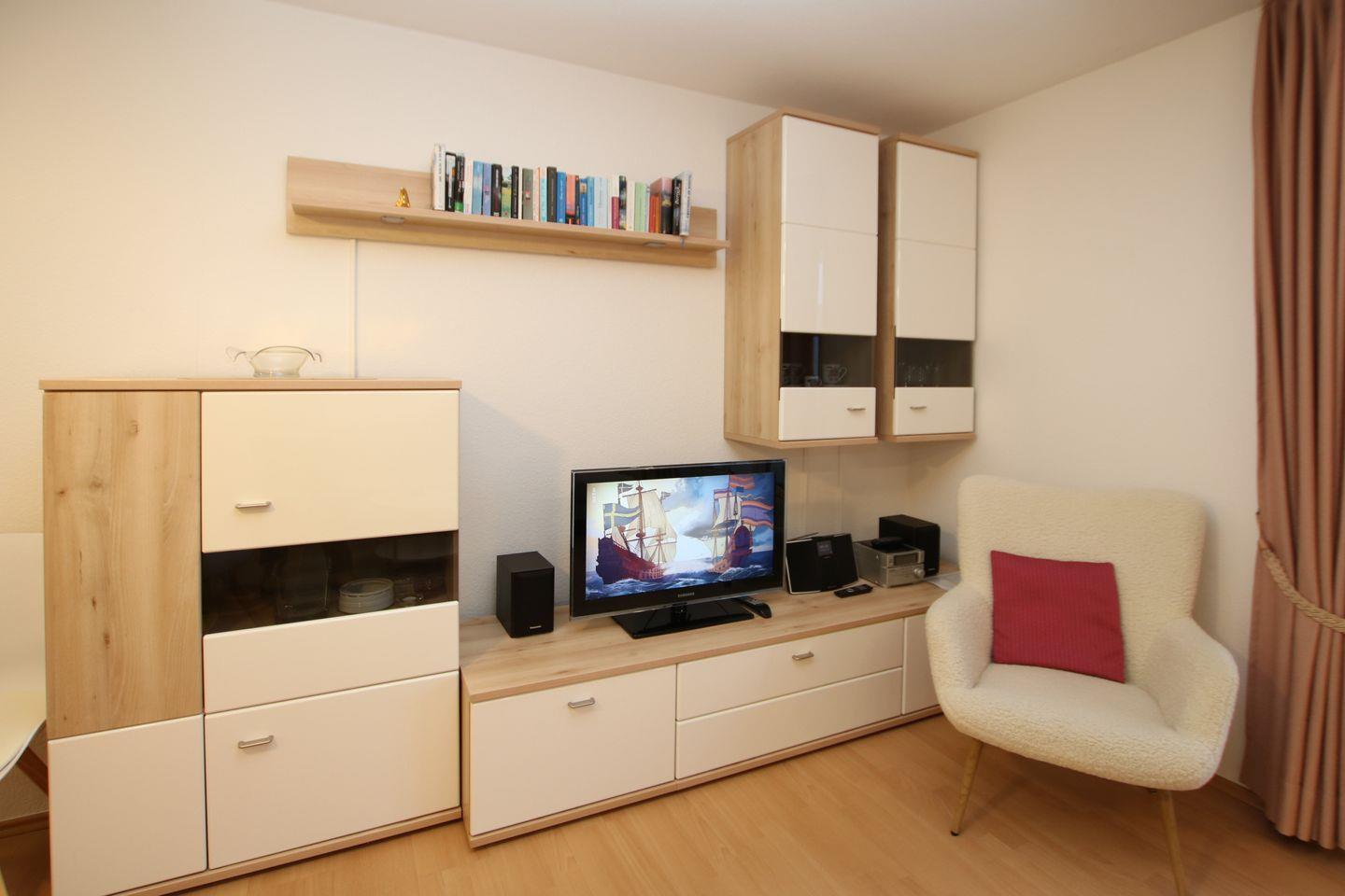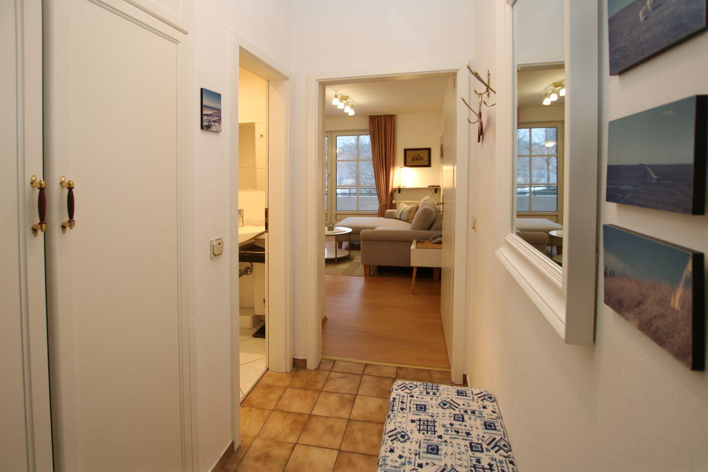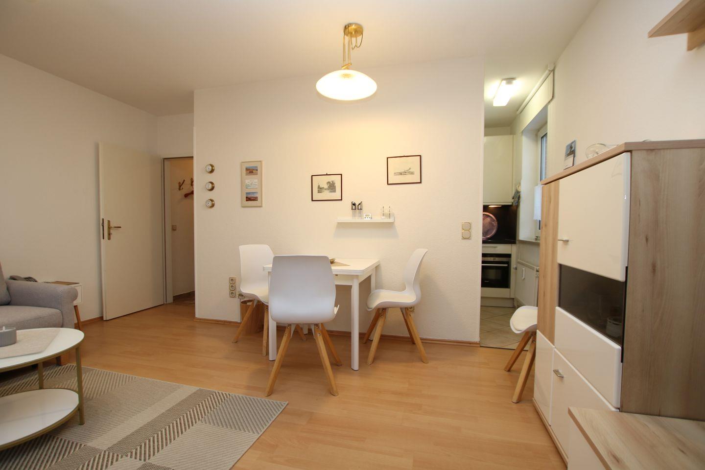 Wohnung Nr. 7, ca. 45 qm, 2-Zimmerwohnung in der 1. Etage mit Süd-Westbalkon. WOHNZIMMER mit Doppelschlafcouch, 2 te Couch und 1 Sessel, Couchtisch, Esstisch mit 4 Stühlen und KÜCHENZEILE mit kompletter Ausstattung. SCHLAFZIMMER mit 2 Einzelbetten und Kleiderschrank und 2. TV. FLUR: