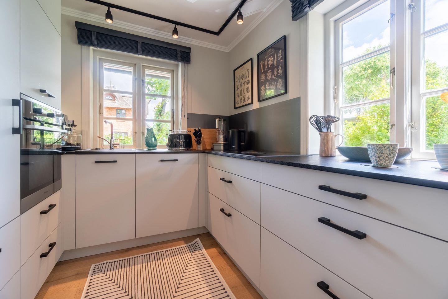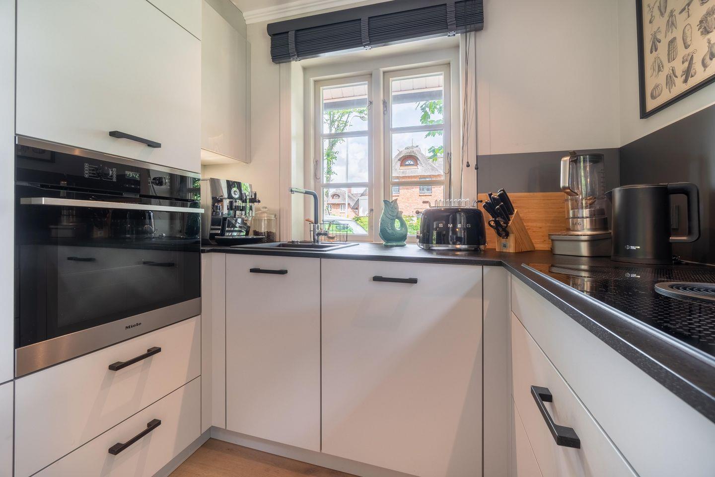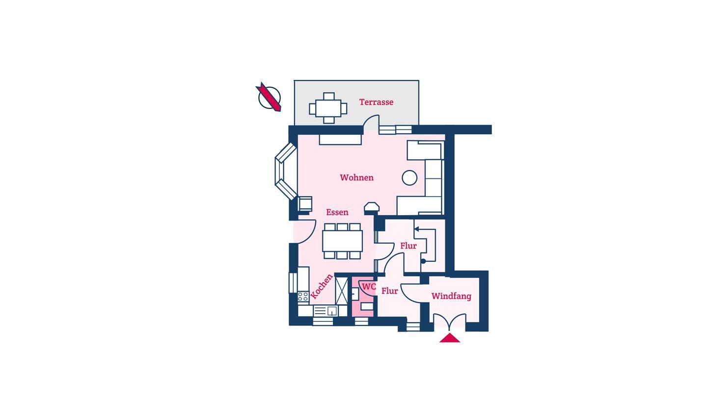 Im Erdgeschoss befinden sich der großzügige Wohn- und Essbereich mit offener Küche sowie ein Gäste-WC. Über den Wohn- und Essbereich gelangen Sie auf die eigene Terrasse mit Strandkorb und in den Garten. Der Gaskamin im Wohnbereich sorgt auch an kühleren Tagen für eine angenehme Atmosphäre.