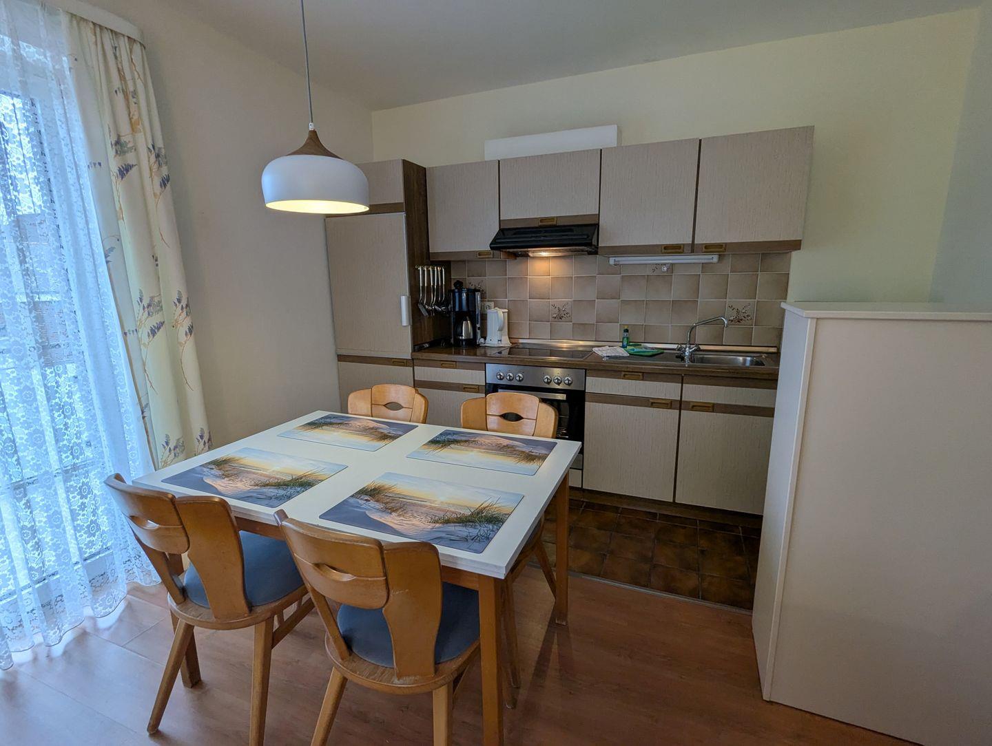 Die Wohnung ist wie folgt aufgeteilt: WOHNBEREICH (ein Sofa, 2 Sessel, ein Couchtisch, Sat-TV, CD-Player, kostenloses Internet), Süd-West-BALKON mit Gartenmöbel und Gartenblick, vollausgestattete WOHNKÜCHE MIT ESSBEREICH (u.a. Esstisch mit 4 Stühlen, Geschirrspüler, Mikrowelle, Backofen, Ceranfeld, Kühlschrank mit Gefrierfach, Kaffeemaschine, Toaster, Eierkocher, Besteck und Töpfe), SCHLAFZIMMER mit einem Doppelbett (180 x 200 cm) und einem Kleiderschrank, ein zweites SCHLAFZIMMER mit einem Einzelbett und einem Kleiderschrank, BADEZIMMER mit Dusche, Fenster, WC, Handtuchwärmer, Waschbecken, Spiegelschrank und Föhn, FLUR mit einer kleinen Garderobe für Jacken und Schuhe. Zur Wohnung gehört ein Parkplatz am Haus.