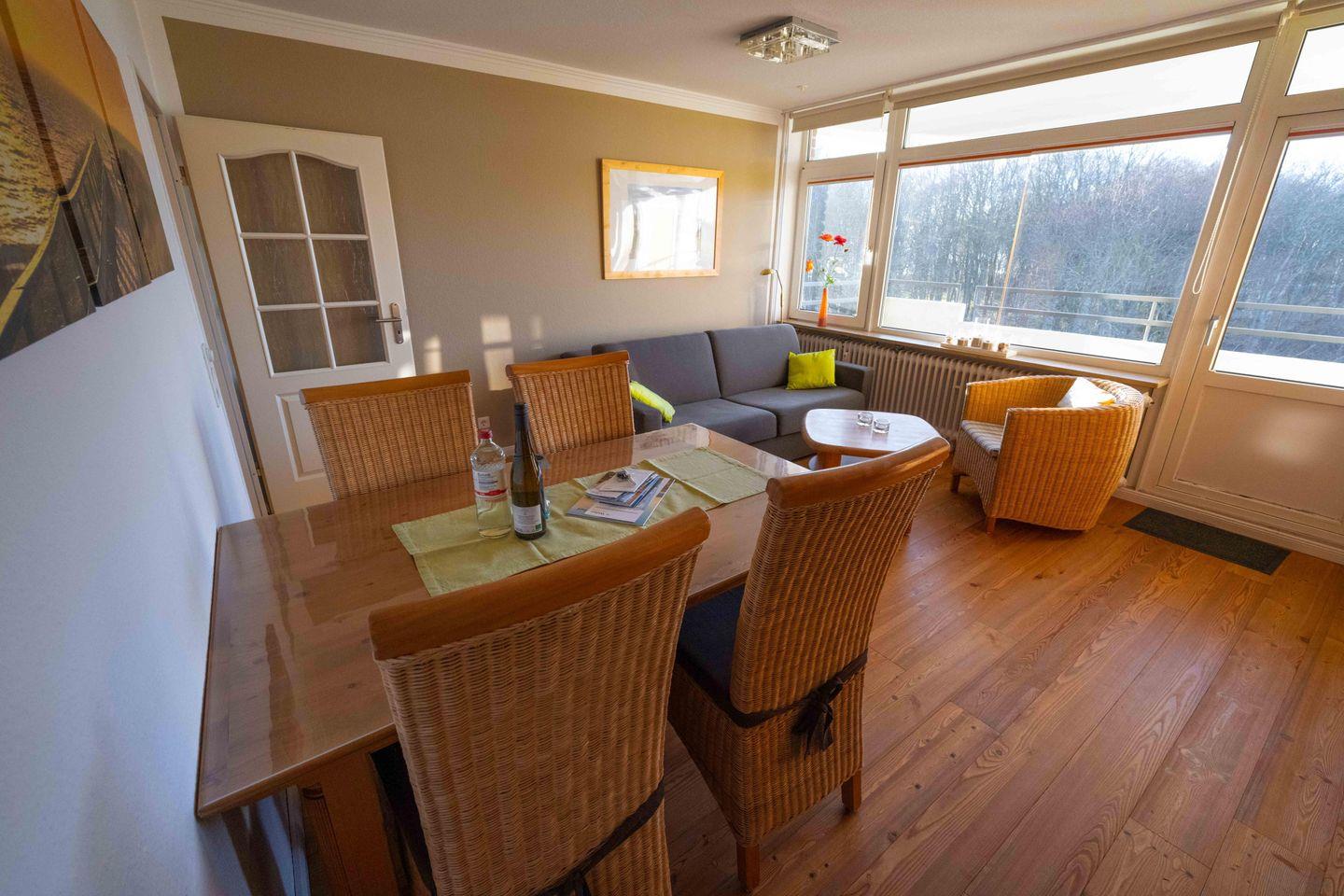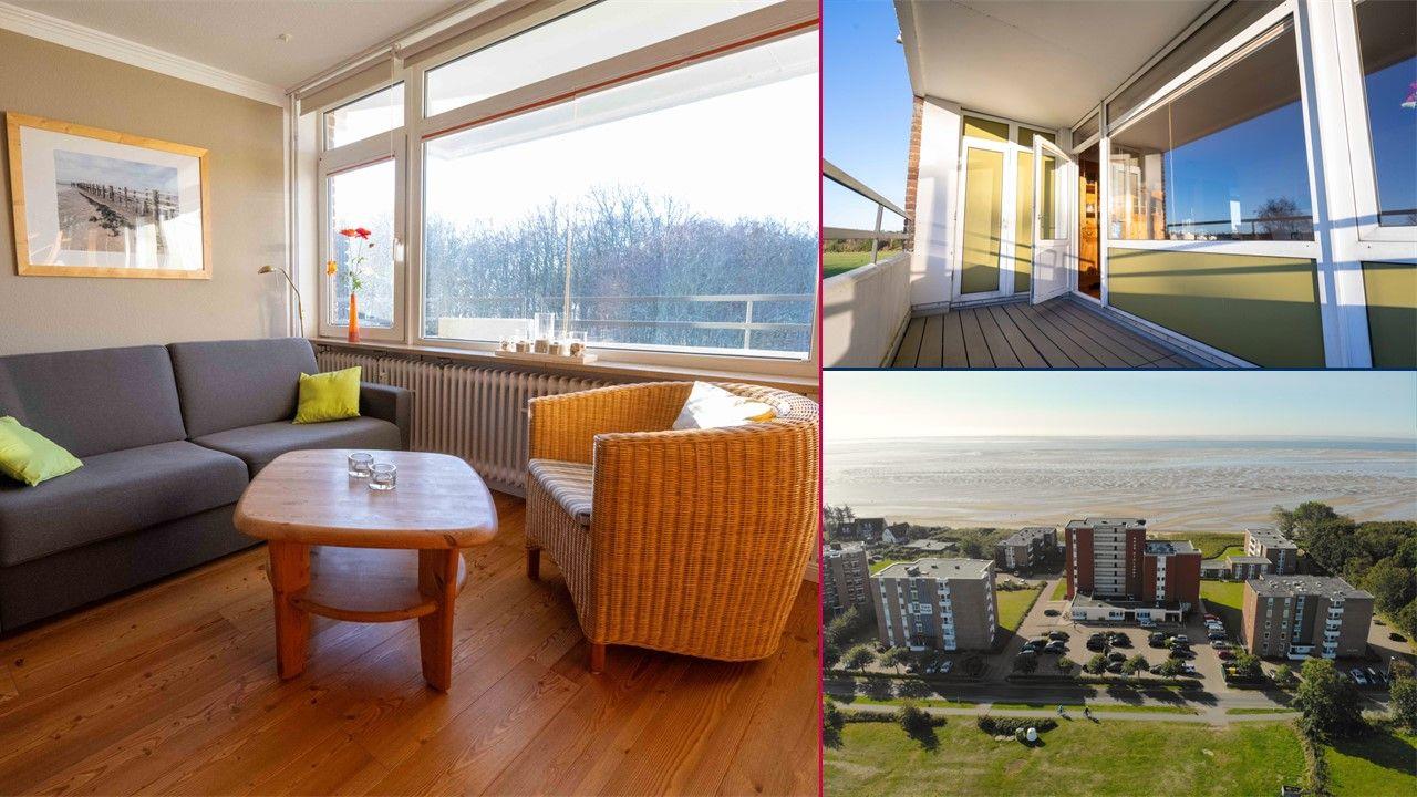 Die Ferienwohnung ist im dritten Obergeschoss gelegen und verfügt über einen großzügigen Wohn- und Essbereich mit offener Küche, ein Duschbad und zwei Balkone. Über den Wohnbereich gelangen Sie auf den Westbalkon, welcher Ihnen einen eingeschränkten Blick auf die Nordsee bietet. Den kleinen Nordbalkon mit Blick auf den nahe gelegenen Flugplatz erreichen Sie über das Schlafzimmer.