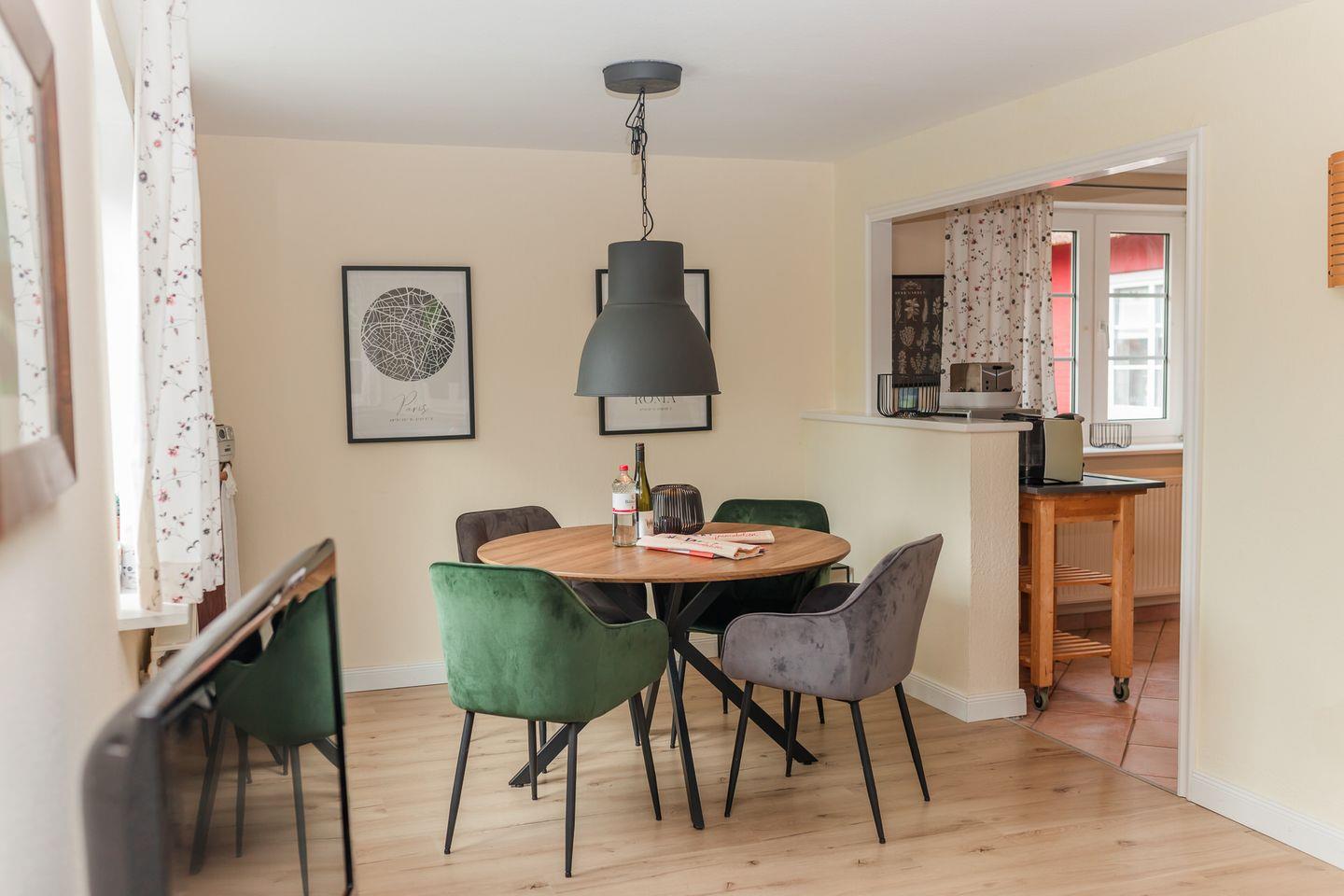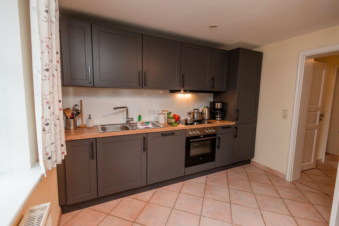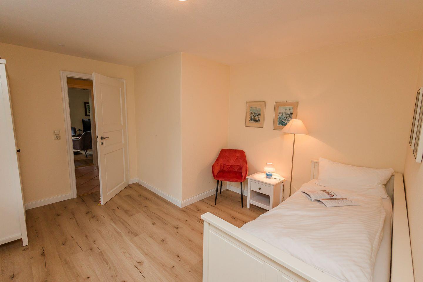 Die Wohnung liegt im Erdgeschoss und ist in einen großzügigen Wohn- und Essbereich mit offener Küche, zwei Schlafzimmer, ein Duschbad und ein Gäste-WC unterteilt. Die Schlafzimmer sind mit einem Doppelbett bzw. einem Einzelbett und einem Ausziehbett ausgestattet.