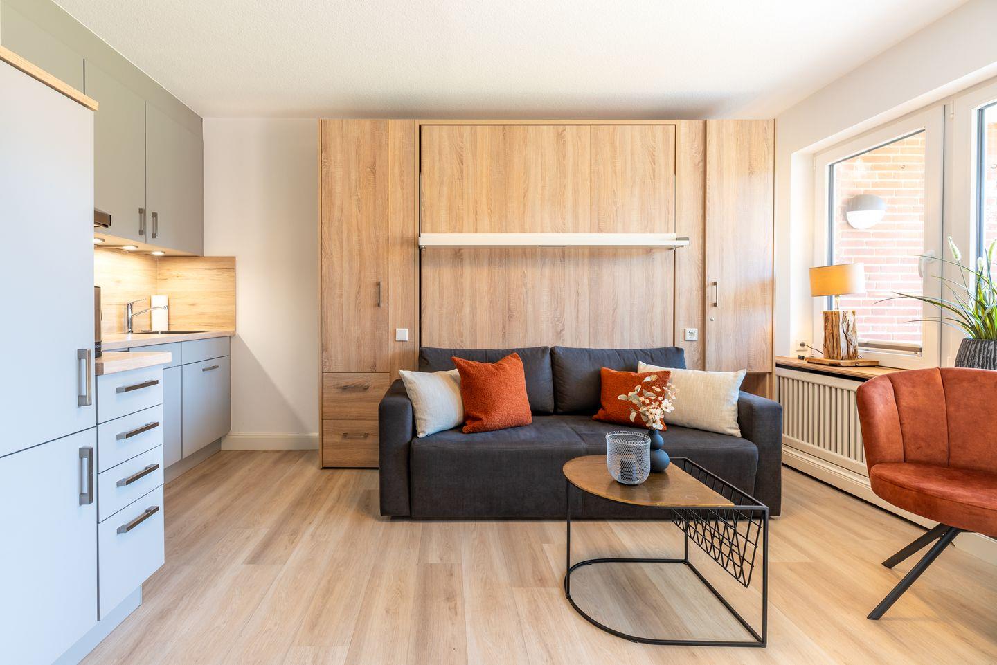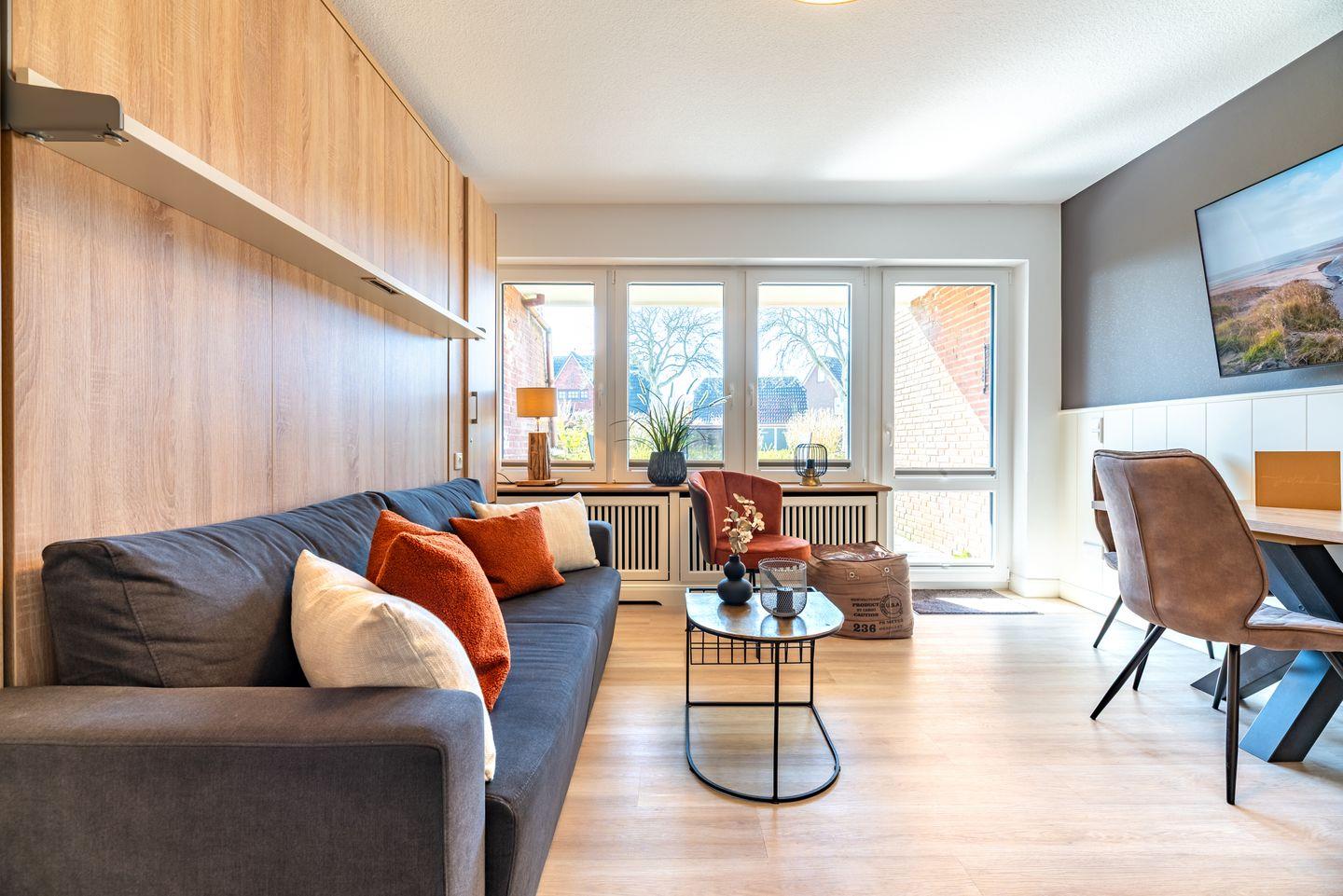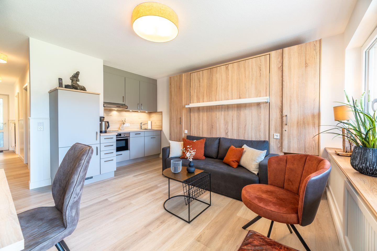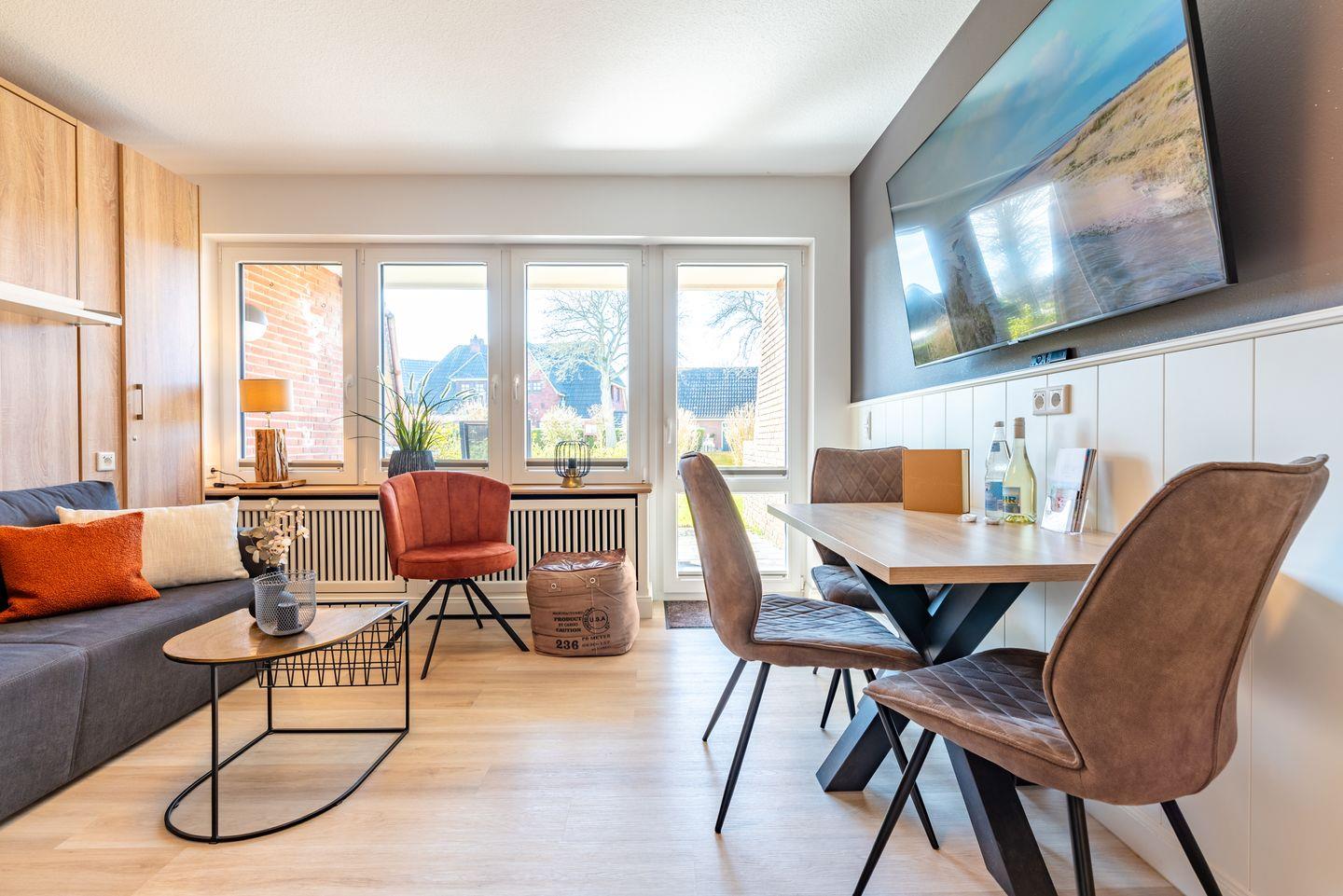 Offener Wohn- und Essbereich mit einer einladenden Sofaecke, einem Esstisch, einem gemütlichen Klappbett, einem Flachbildfernseher und einem Terrassenzugang. Die moderne Küche ist ausgestattet mit Herd, Backofen, Geschirrspüler und weiteren Annehmlichkeiten.